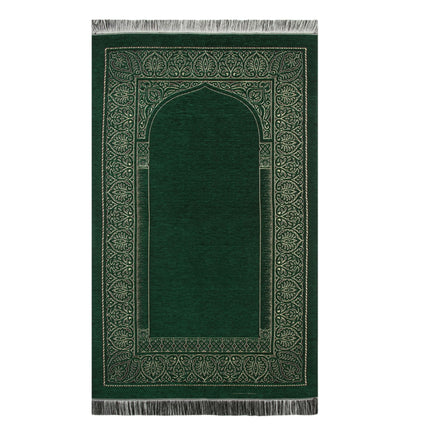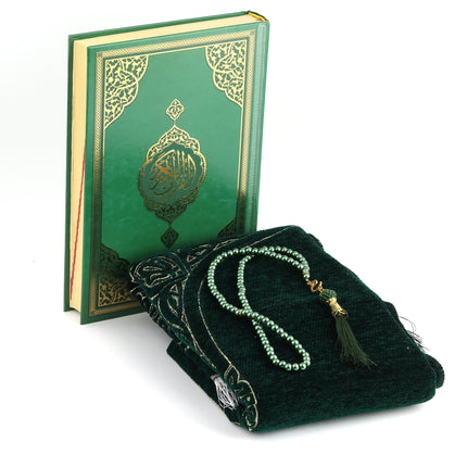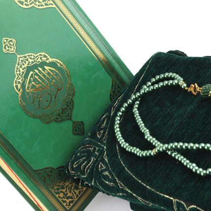 - Kadife Kaplı Kutu İçerisinde 70x115 Cm Şönil Seccade,17x24 Cm Orta Boy Kuran- Kerim ve 99'lu 10 mm Tül Güllü Tesbih ile beraber sunulur.