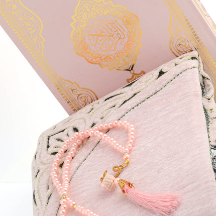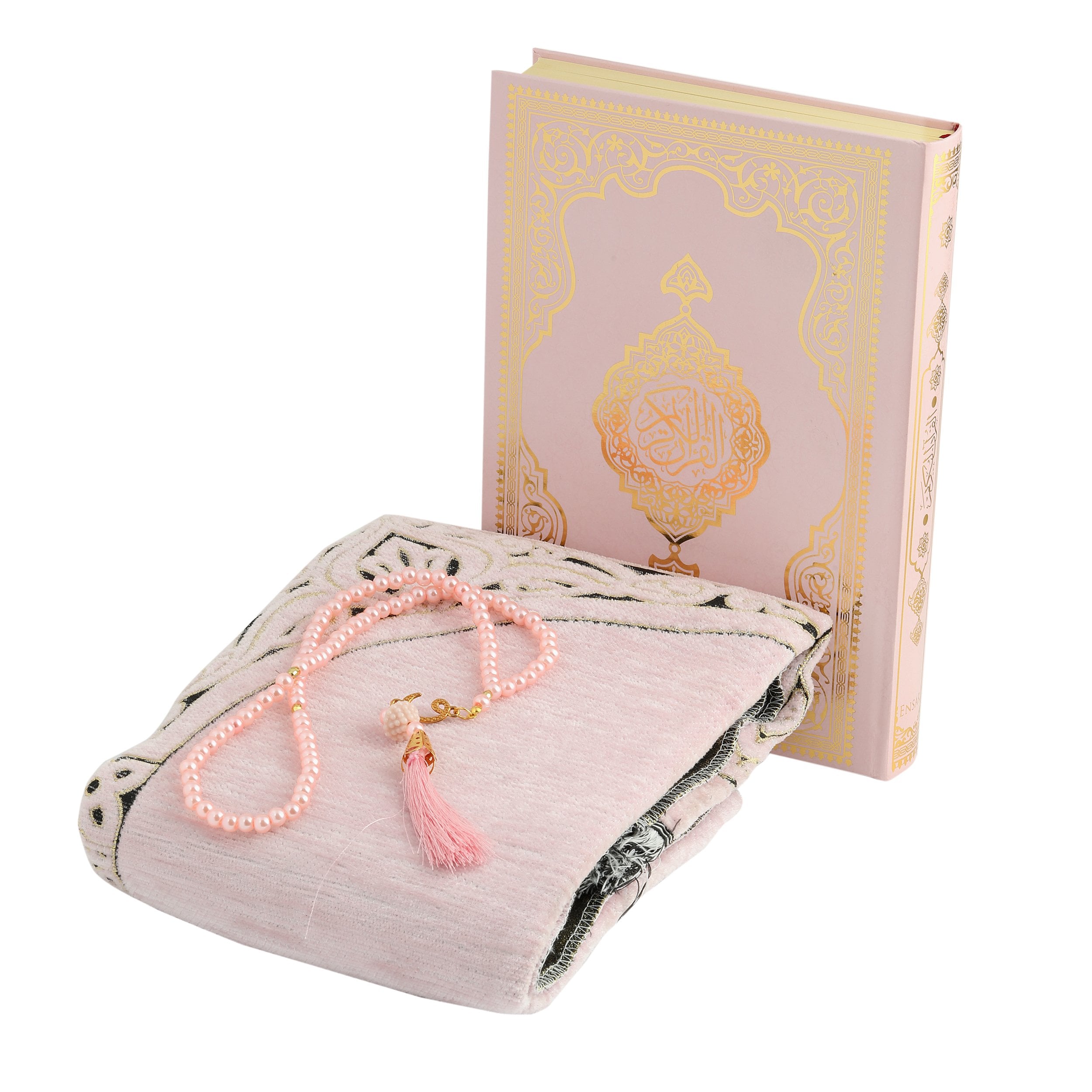 - Kadife Kaplı Kutu İçerisinde 70x115 Cm Şönil Seccade,17x24 Cm Orta Boy Kuran- Kerim ve 99'lu 10 mm Tül Güllü Tesbih ile beraber sunulur.