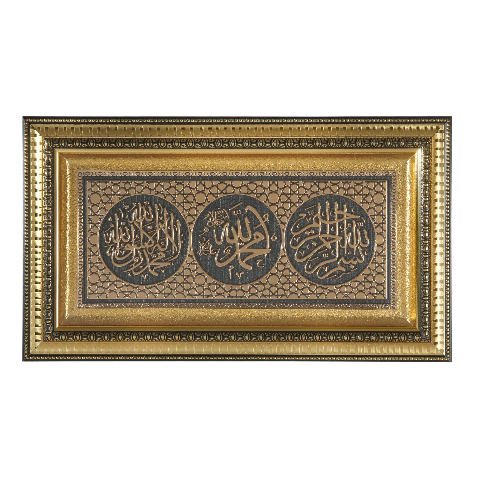 Evinizde, ofisinizde kullanabileceğiniz veya hediye olarak alabileceğiniz şık bir tasarıma sahip Üçlü Ayet (İsmi Celil,İsmi Nebi,Kelime-i Tevhid) tablo modelidir. Modern bir görünüme sahiptir ve oldukça dekoratif bir tablo modelidir.