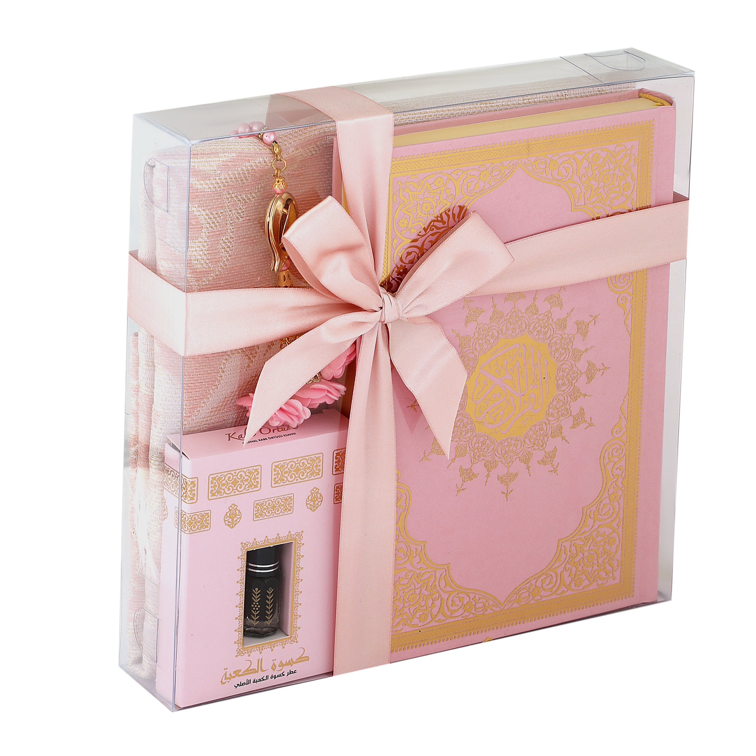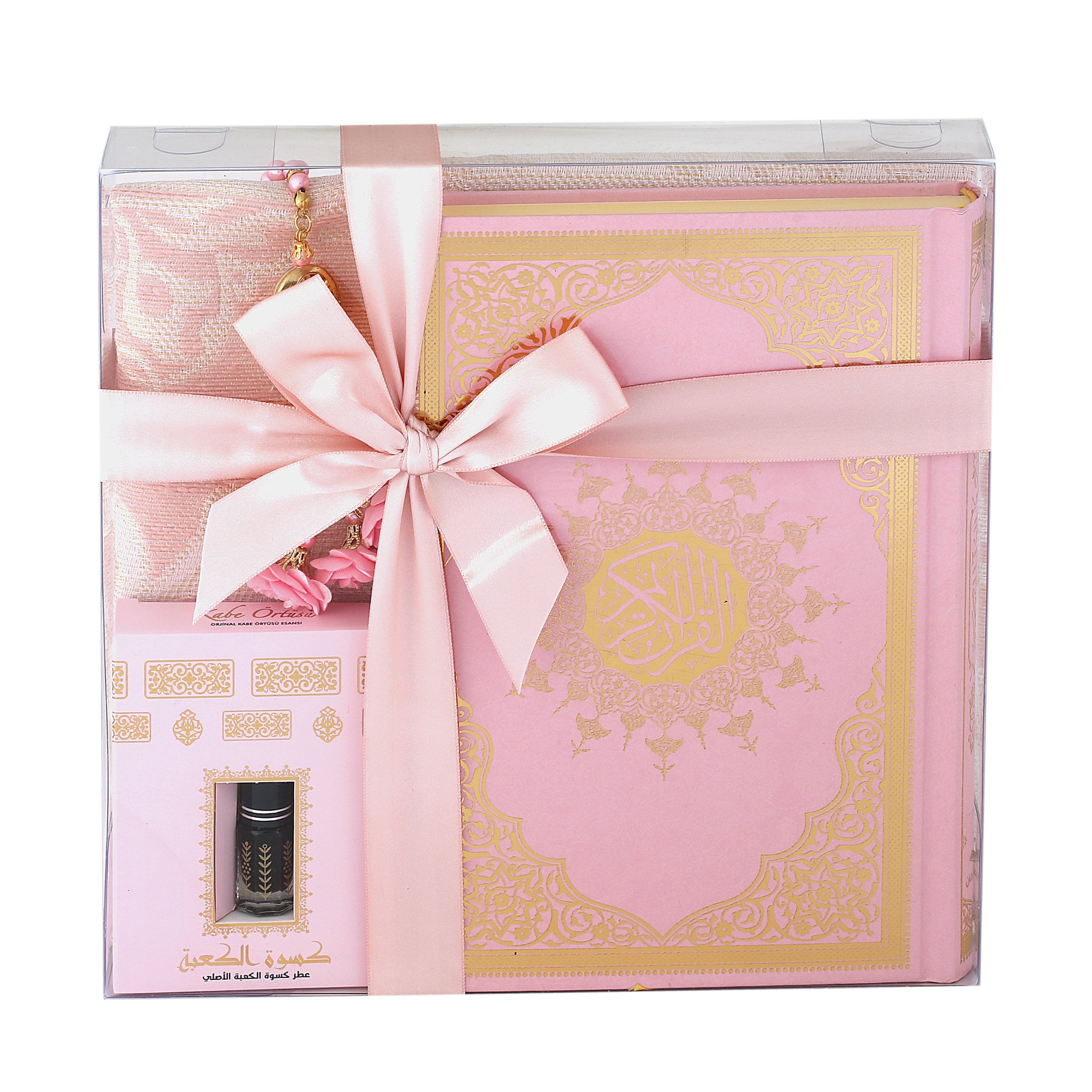 - Asetat kutu içerisinde 99'luk 6 mm Tasarım Tül Güllü Tesbih, 70x110 Tafta Seccade, 17x25 Cm Orta Boy Kuran-ı Kerim ve Kabe Örtüsü Koku ile beraber sunulur.