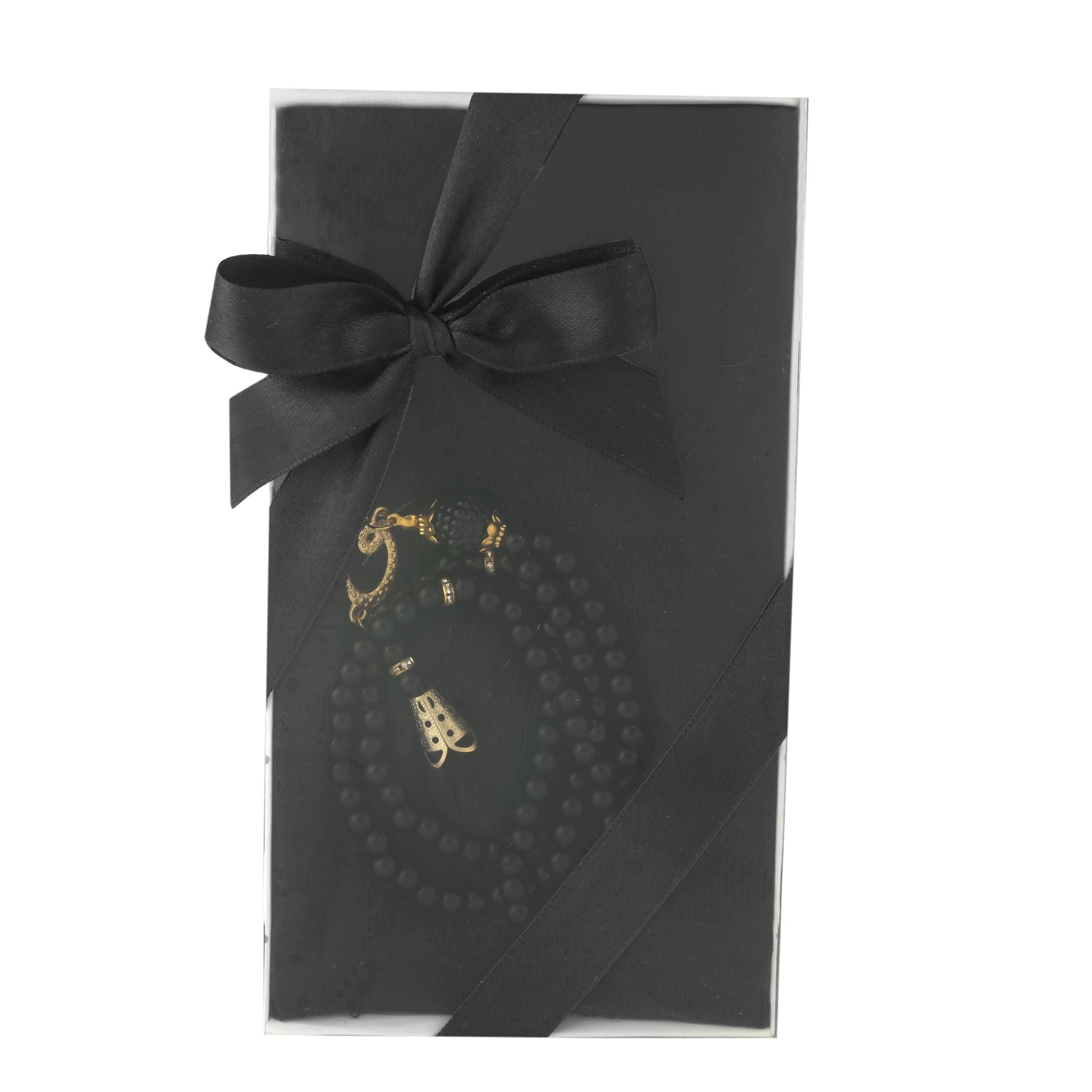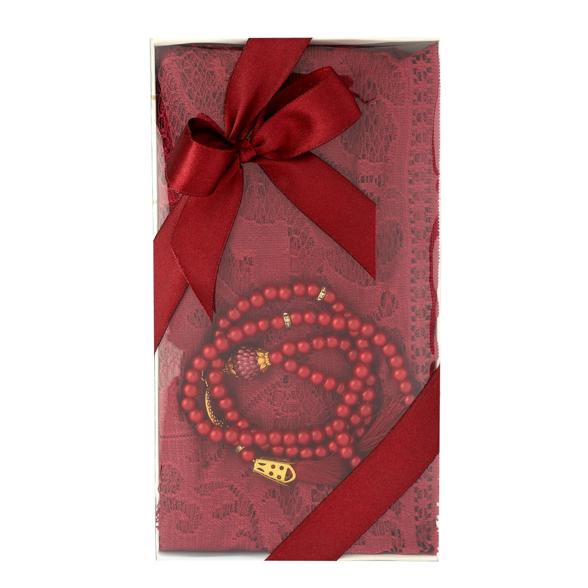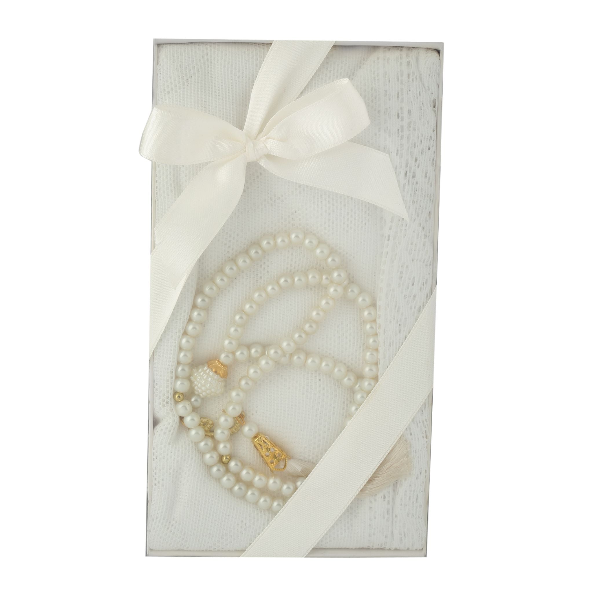 - Asetat kutu içerisinde 99'luk 6 mm Vavlı İnci Tesbih ve Delikli Motifli Şal ile beraber sunulur.
