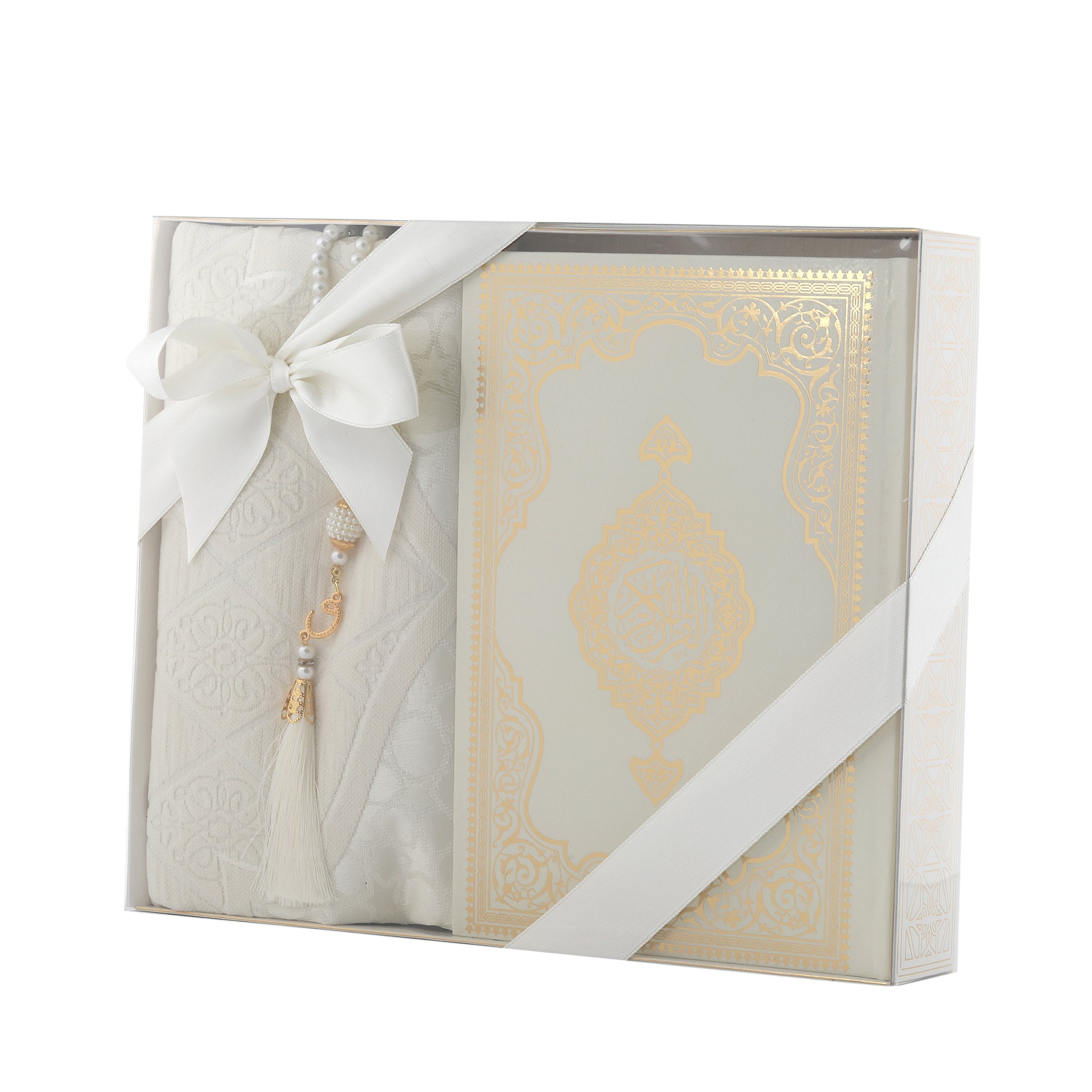- Asetat kutu içerisinde 70x115 Cm Saçaklı Şönil Seccade, 17x25 Cm Ofset Orta Boy Bilgisayar Hatlı Kuran-ı Kerim ve 99'luk 6 mm Vavlı İnci Tesbih ile beraber sunulur.