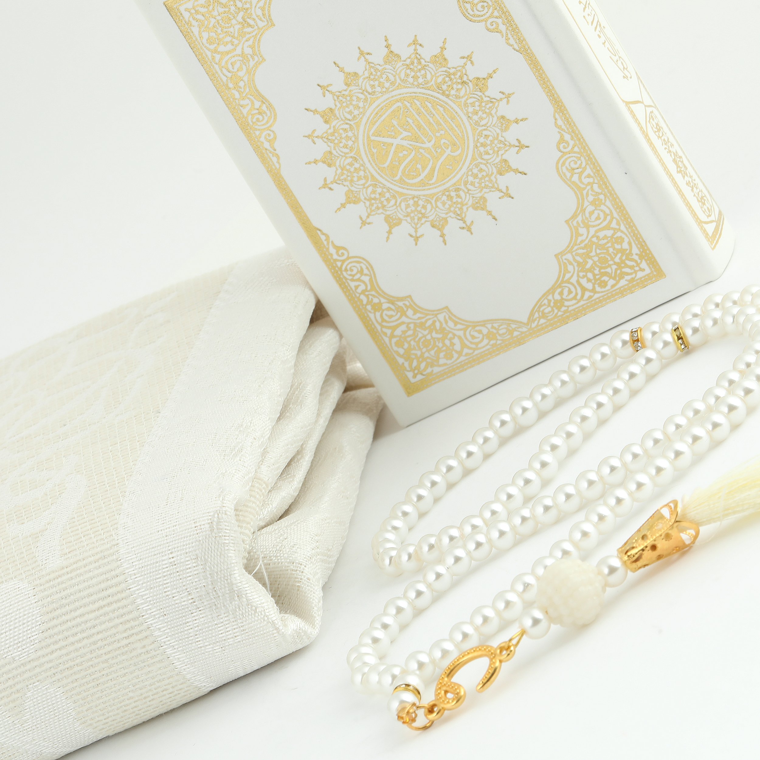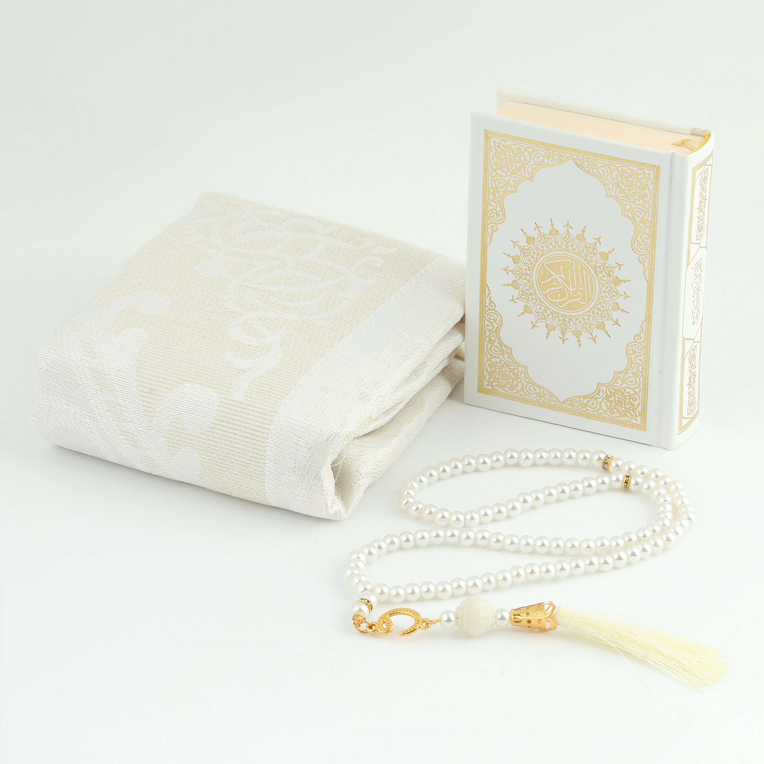 - Kadife Kaplı Kutu İçerisinde 70x110 Cm Tafta Seccade 150 Gr, 8x12 Cm Küçük Cep Boy Kuran-ı Kerim ve 99'lu 6 mm Vavlı İnci Tesbih ile beraber sunulur.