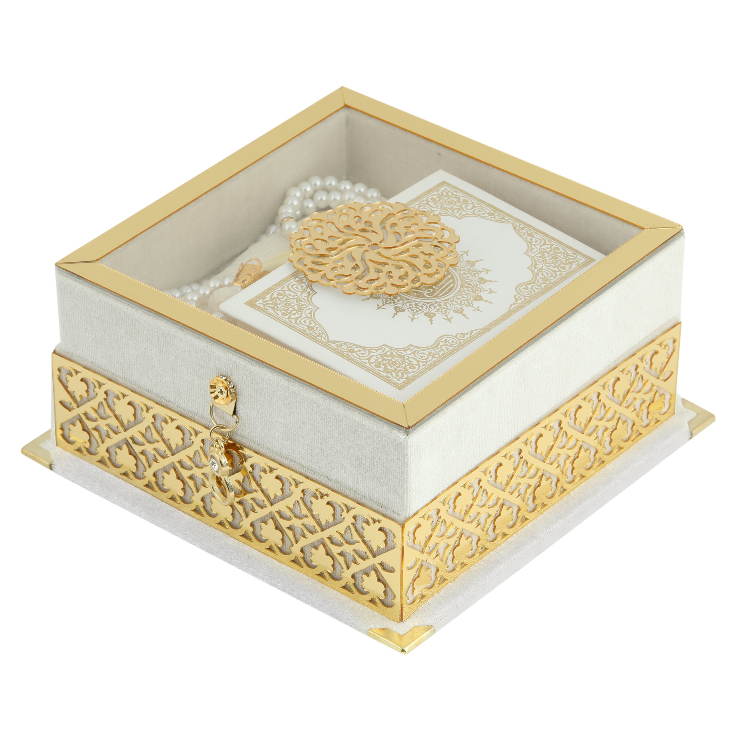 17x17x8 Cm Camlı Seccade Kuran-ı Kerim Tesbih Kutusu Krem