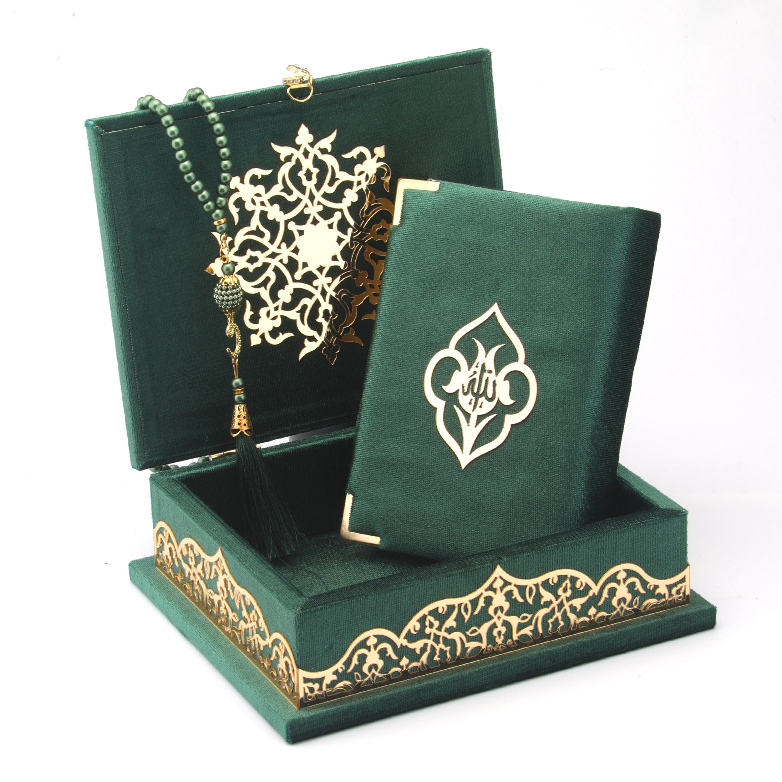 - Kadife Kaplı Kutu İçerisinde 12x16 Cm Çanta Boy Kadife Kaplı Medine Hatlı Kuran-ı Kerim ve 99'lu 6 mm Vavlı İnci Tesbih ile beraber sunulur.