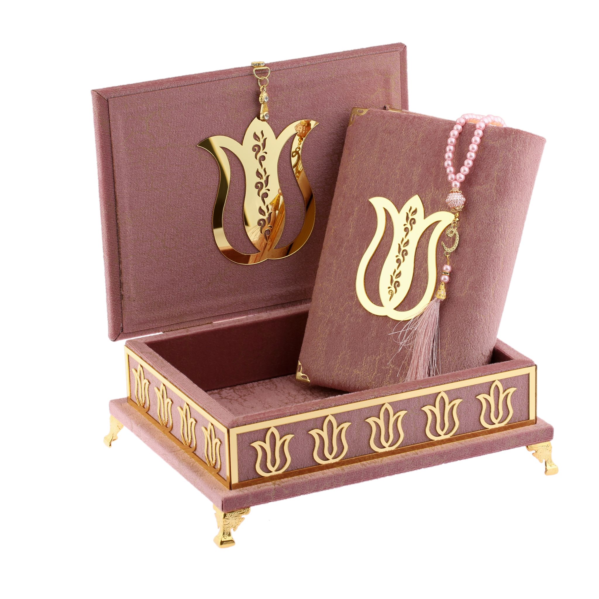 - Mermer desenli Lale modelli kutu içerisinde 99'luk 6 mm vavlı İnci Tesbih ve 17x25 cm orta boy kadife kaplı Kuran-ı Kerim ile beraber sunulur.