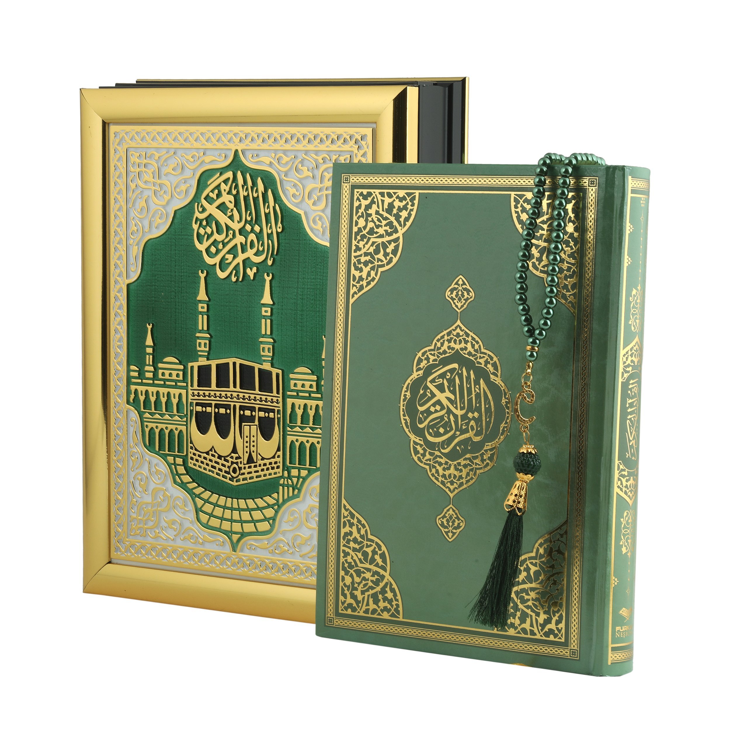 - Çıtalı plaket kutu içerisinde 17x25 Cm Orta Boy Medine Hatlı Kuran-ı Kerim ve 99'lu 6 mm Vavlı İnci Tesbih ile beraber sunulur.