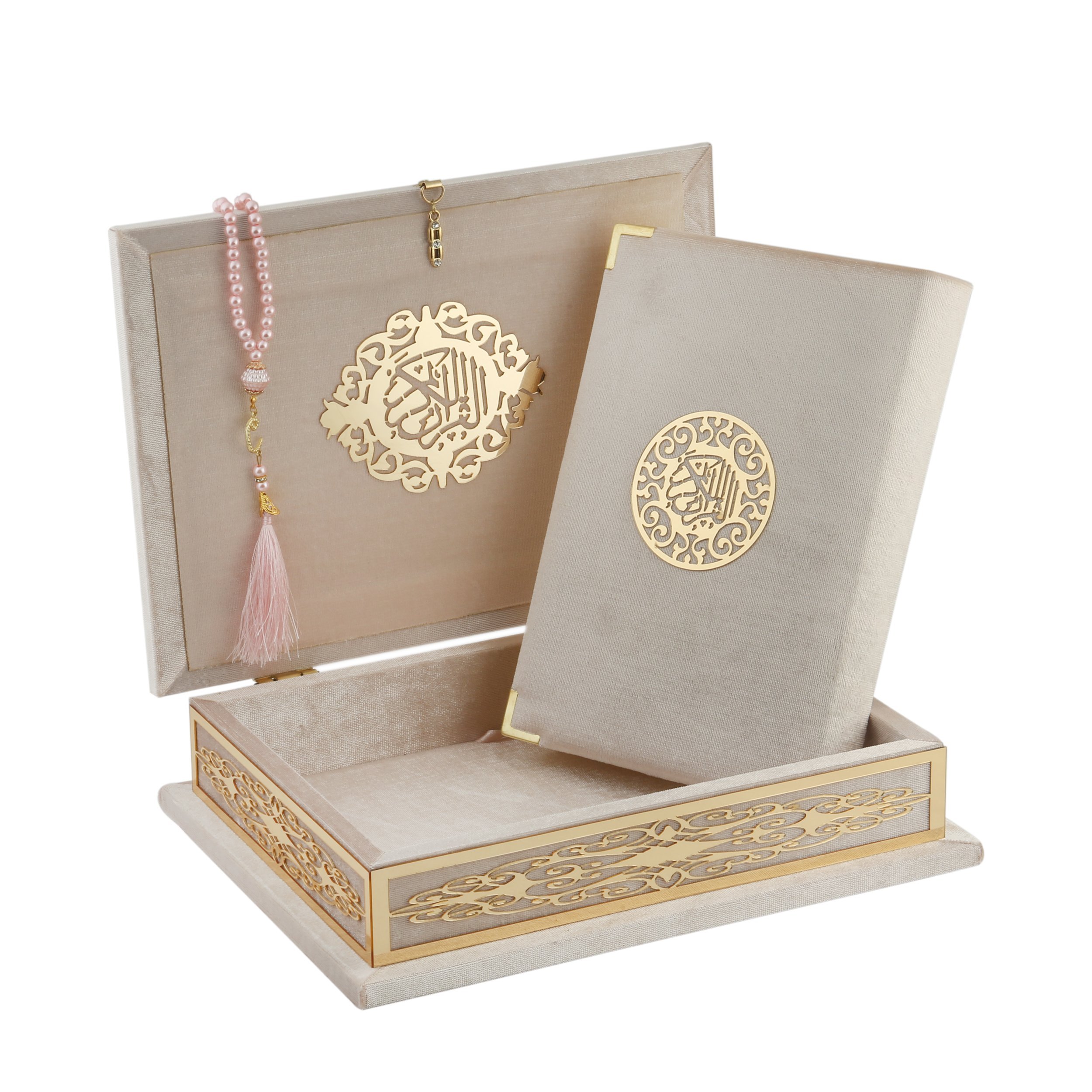 - Kadife kutu içerisinde 99'luk 6 mm Vavlı İnci Tesbih ve 17x25 Cm Kadife Kaplı Orta Boy Medine Hatlı Kuran-ı Kerim ile beraber sunulur.
