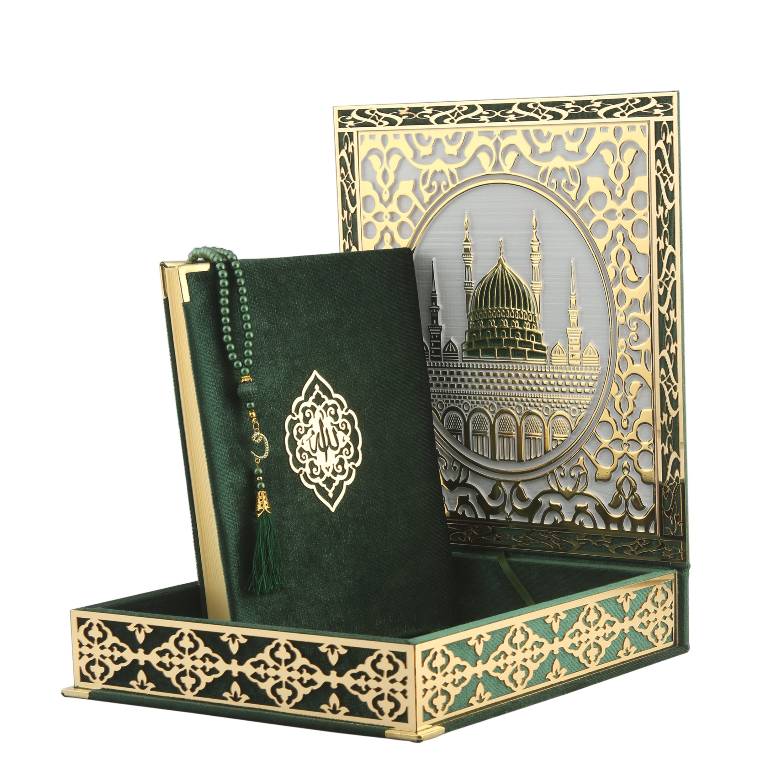26x29 Cm Kabe Ayrıntılı Gold Pleksili Kuran-ı Kerim Tesbih Kutusu Yeşil