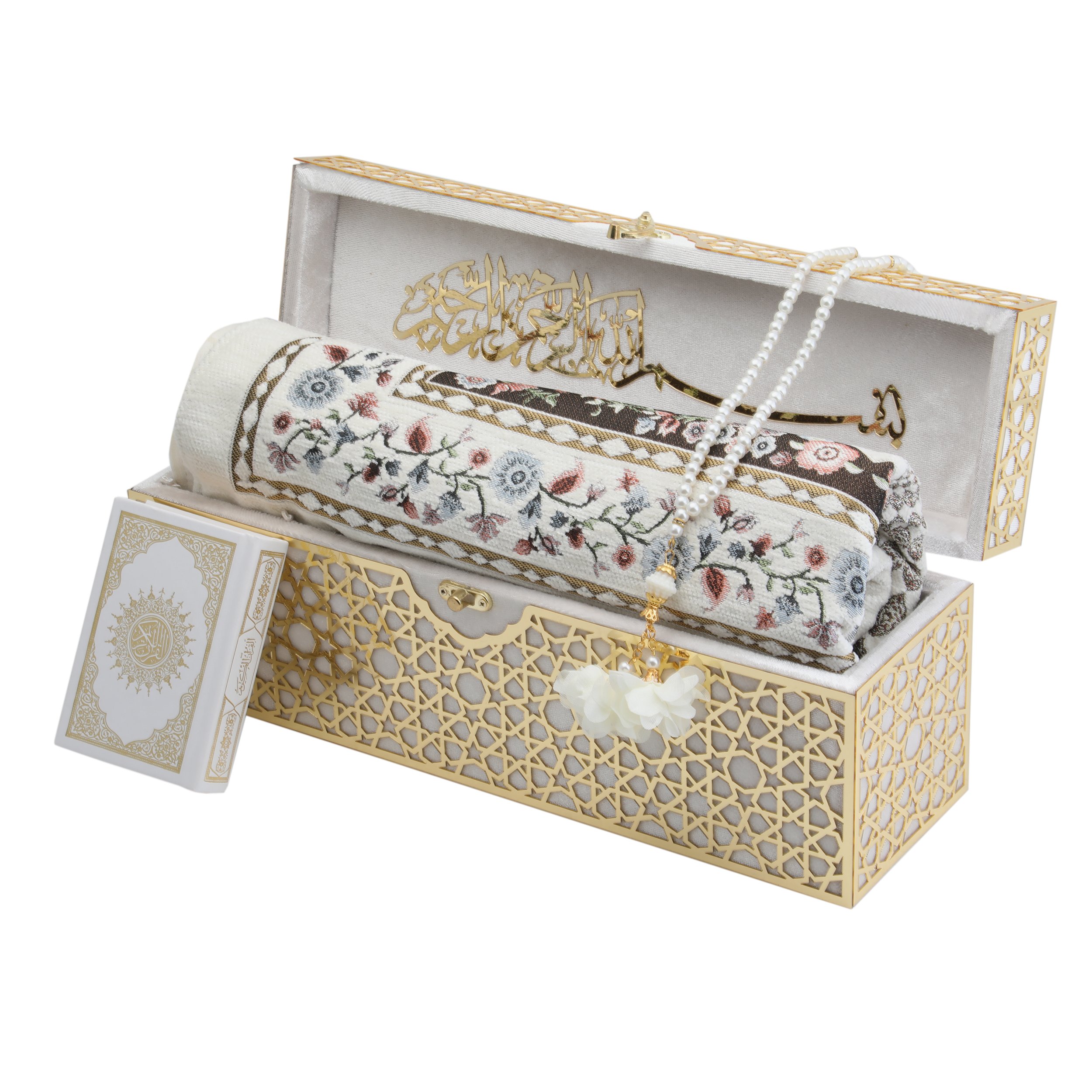 - Kadife Kaplı Kutu İçerisinde 70x110 Cm Astarlı Toros Seccade 800 Gr, 8x12 Cm Küçük Cep Boy Medine Ofset Kuran-ı Kerim ve 99'luk 6 mm Tül Güllü Tesbih ile beraber sunulur.