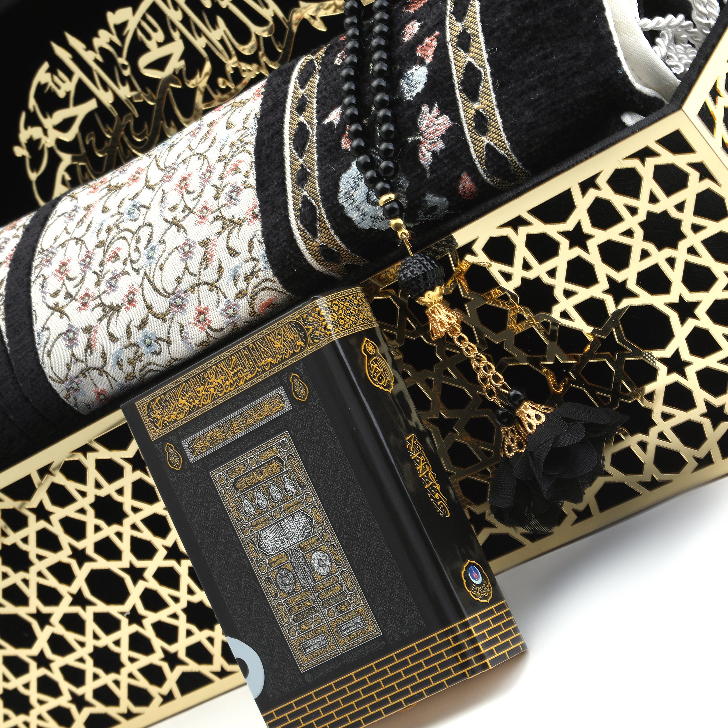 - Kadife Kaplı Kutu İçerisinde 70x110 Cm Astarlı Toros Seccade 800 Gr, 8x12 Cm Küçük Cep Boy Medine Ofset Kuran-ı Kerim ve 99'luk 6 mm Tül Güllü Tesbih ile beraber sunulur.