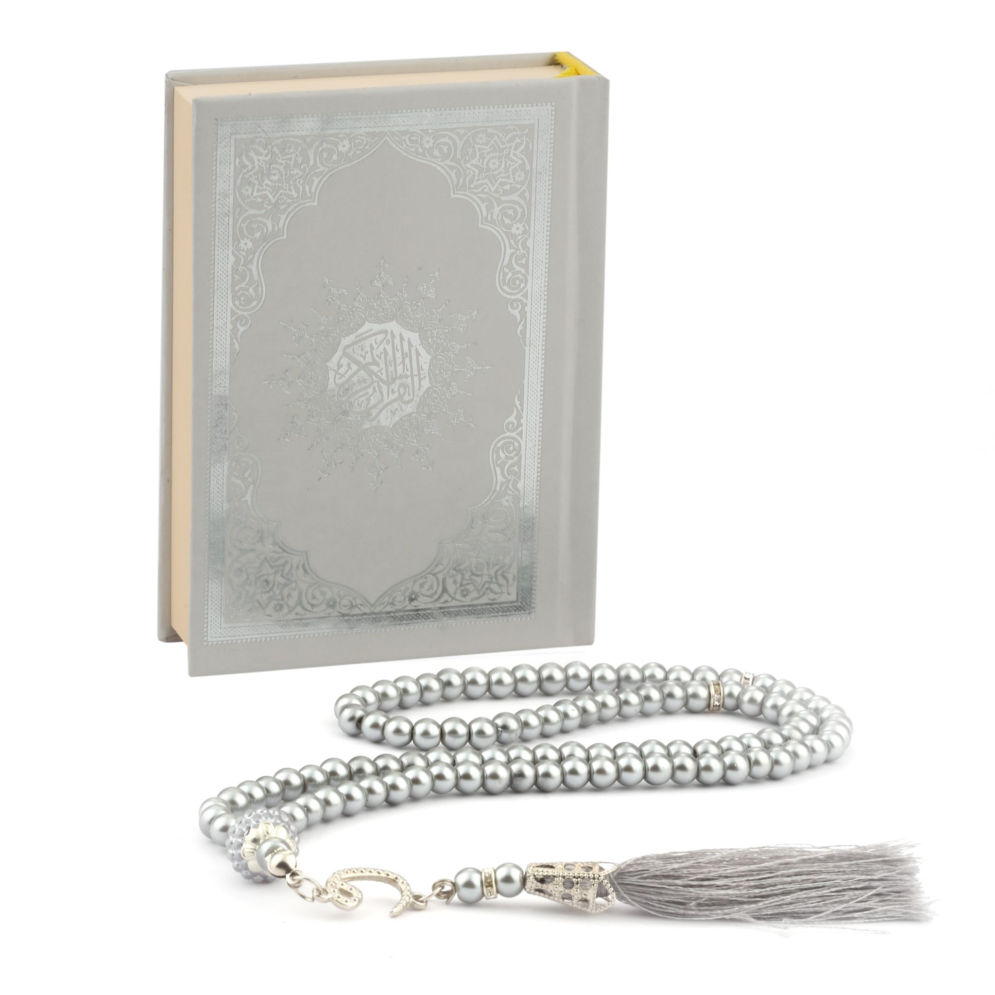 - Asetat kutu içerisinde 99'luk 6 mm Vavlı İnci Tesbih ve 8x12 Cm Cep Boy Ofset Medine Hatlı Kuran-ı Kerim ile beraber sunulur.