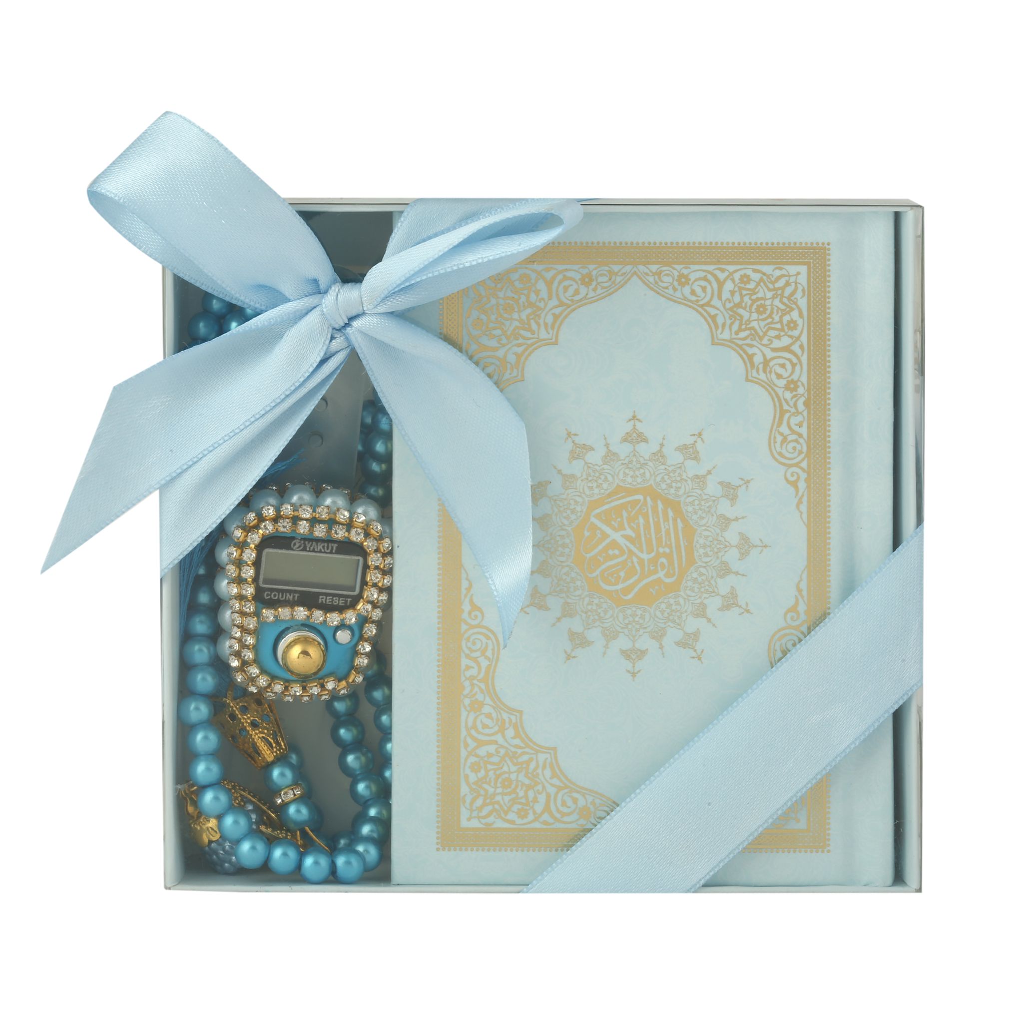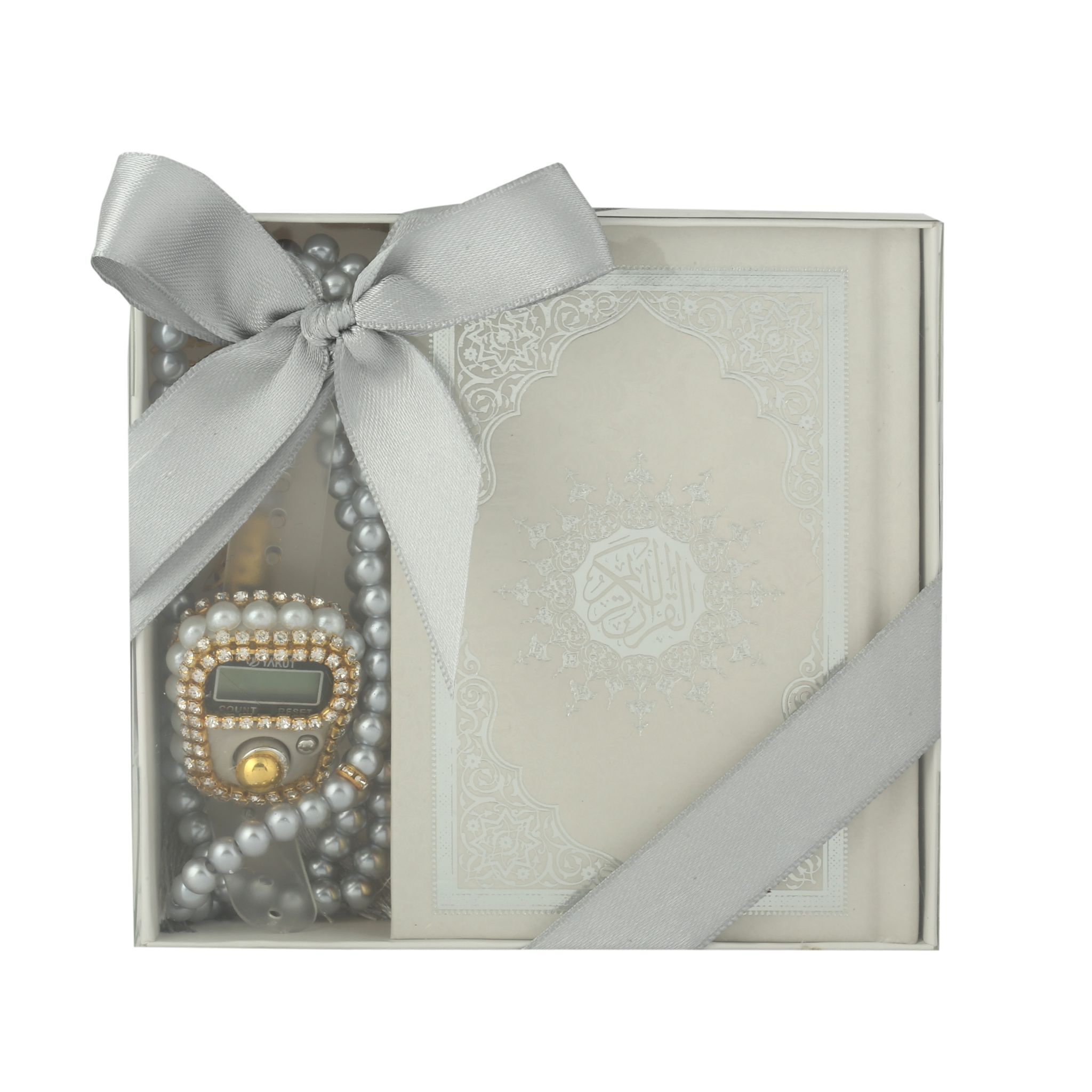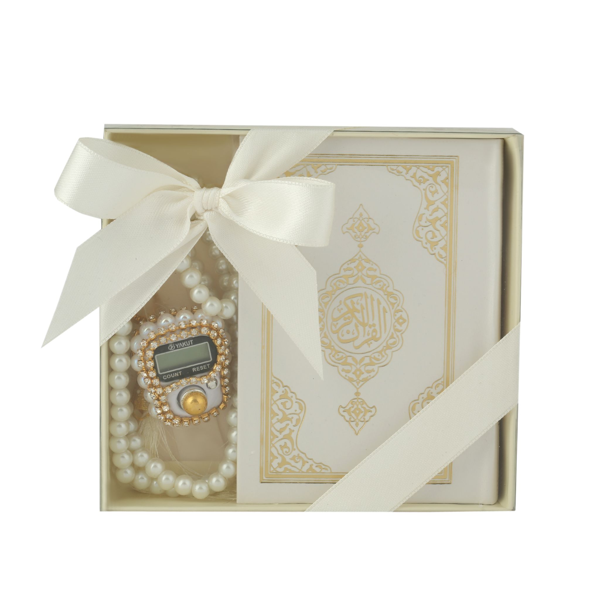 - Asetat kutu içerisinde 99'luk 6 mm Vavlı İnci Tesbih, Taşlı Zikirmatik ve 8x12 Cm Cep Boy Kuran-ı Kerim ile beraber sunulur.