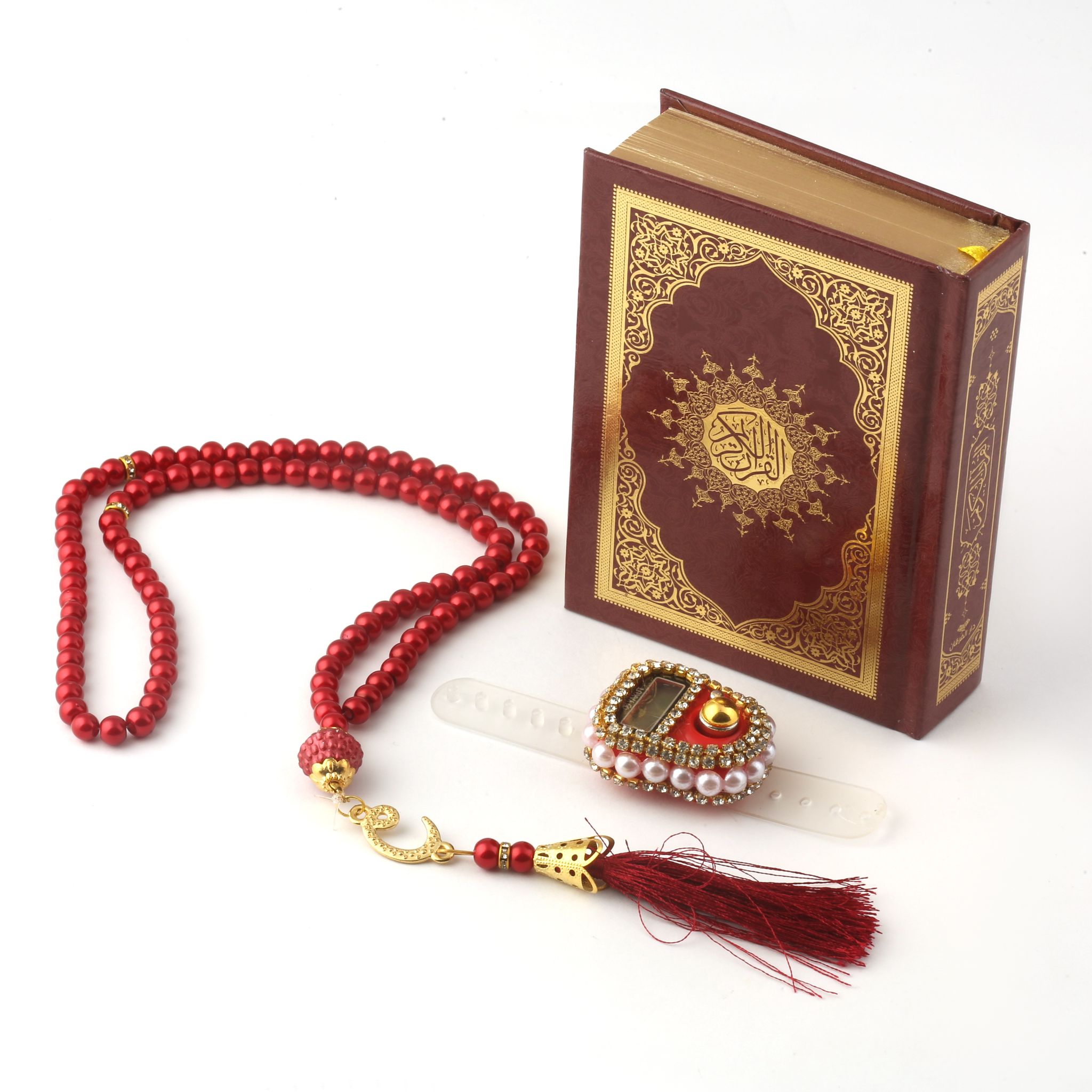 - Asetat kutu içerisinde 99'luk 6 mm Vavlı İnci Tesbih, Taşlı Zikirmatik ve 8x12 Cm Cep Boy Kuran-ı Kerim ile beraber sunulur.