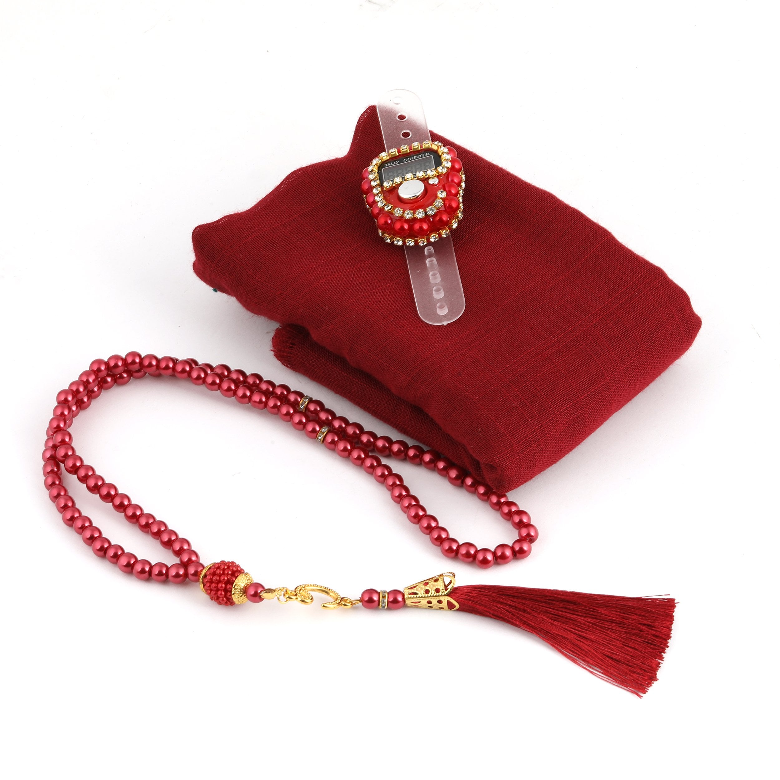Asetat Çantalı Eşarp Zikirmatik Tesbih Seti Bordo