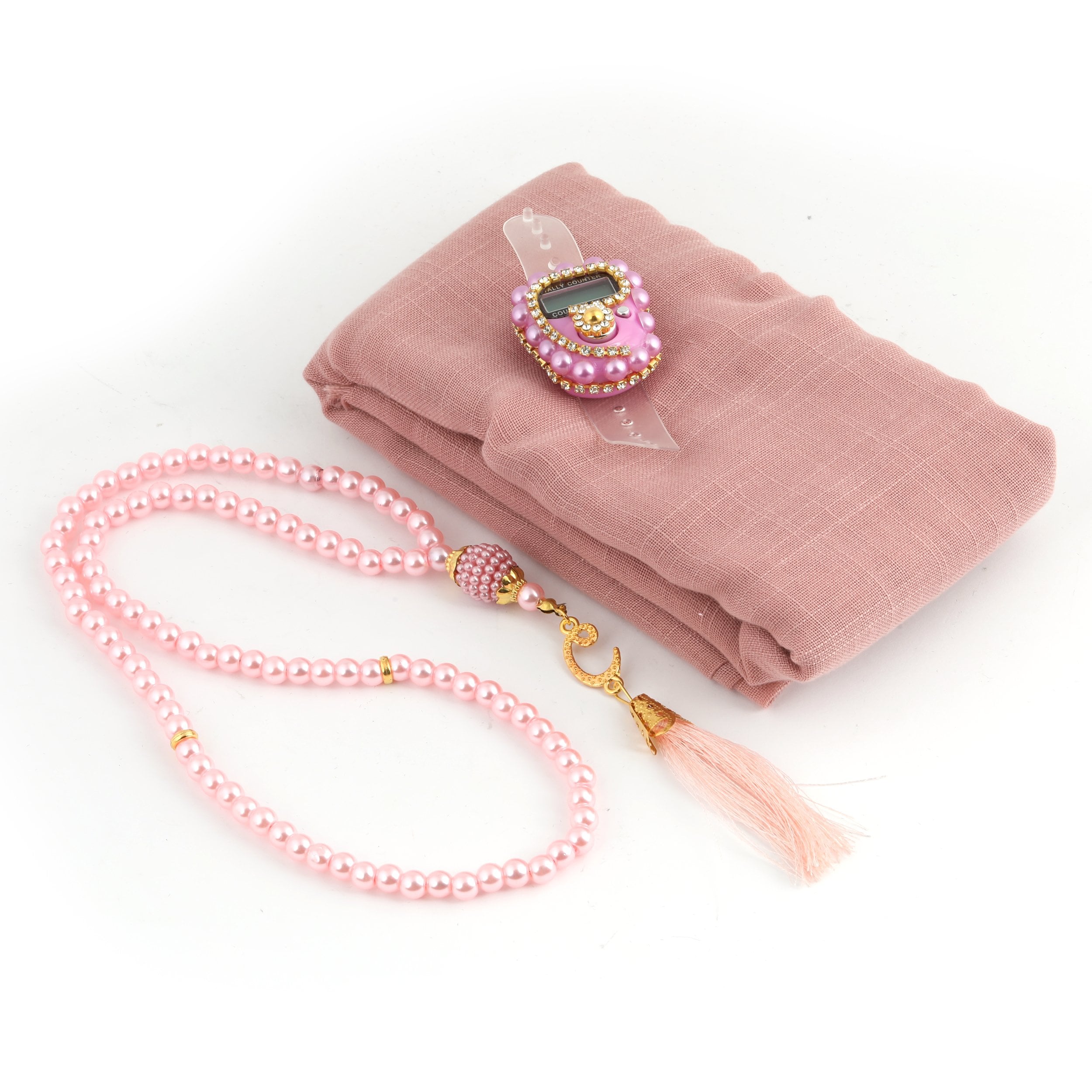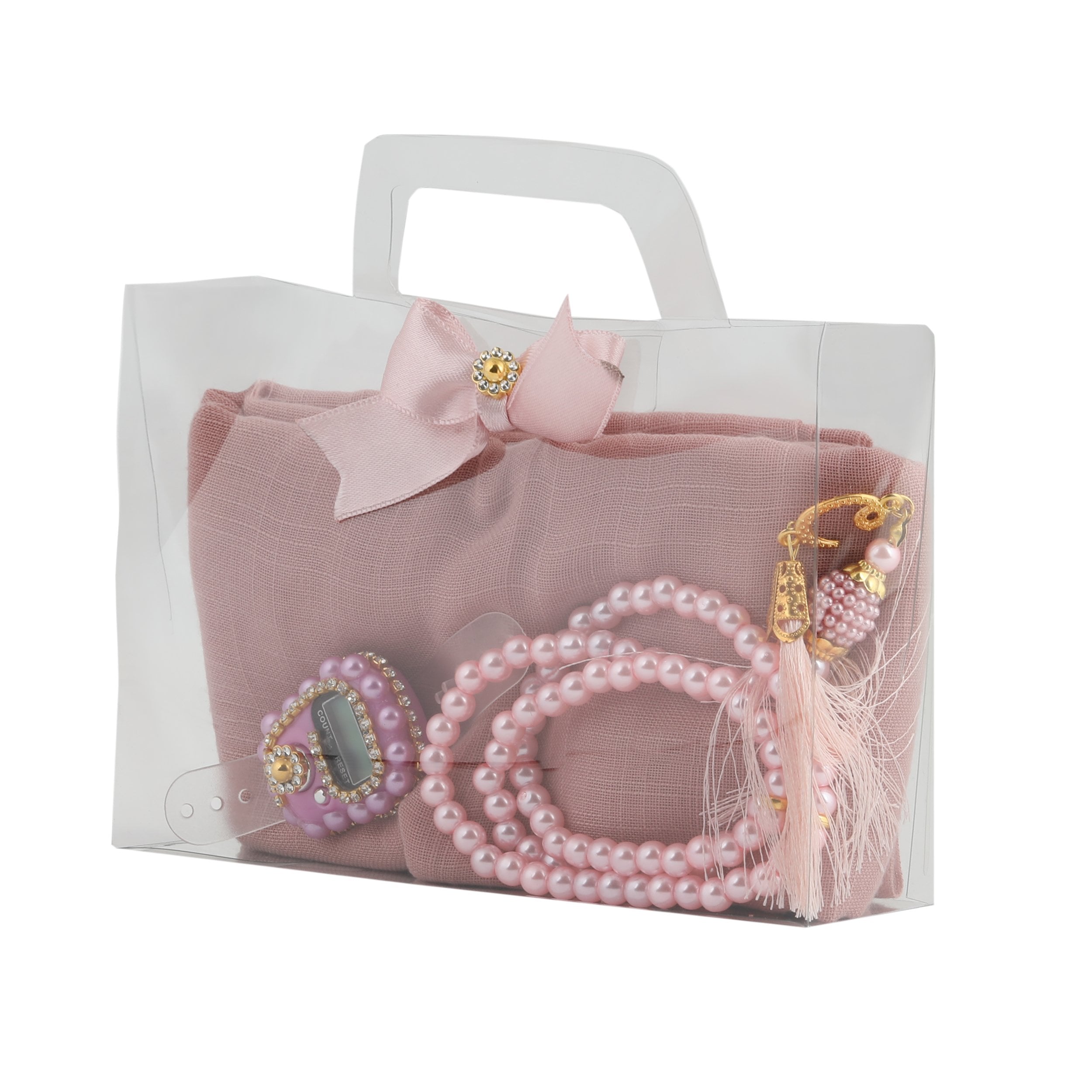 Asetat Çantalı Eşarp Zikirmatik Tesbih Seti Pembe