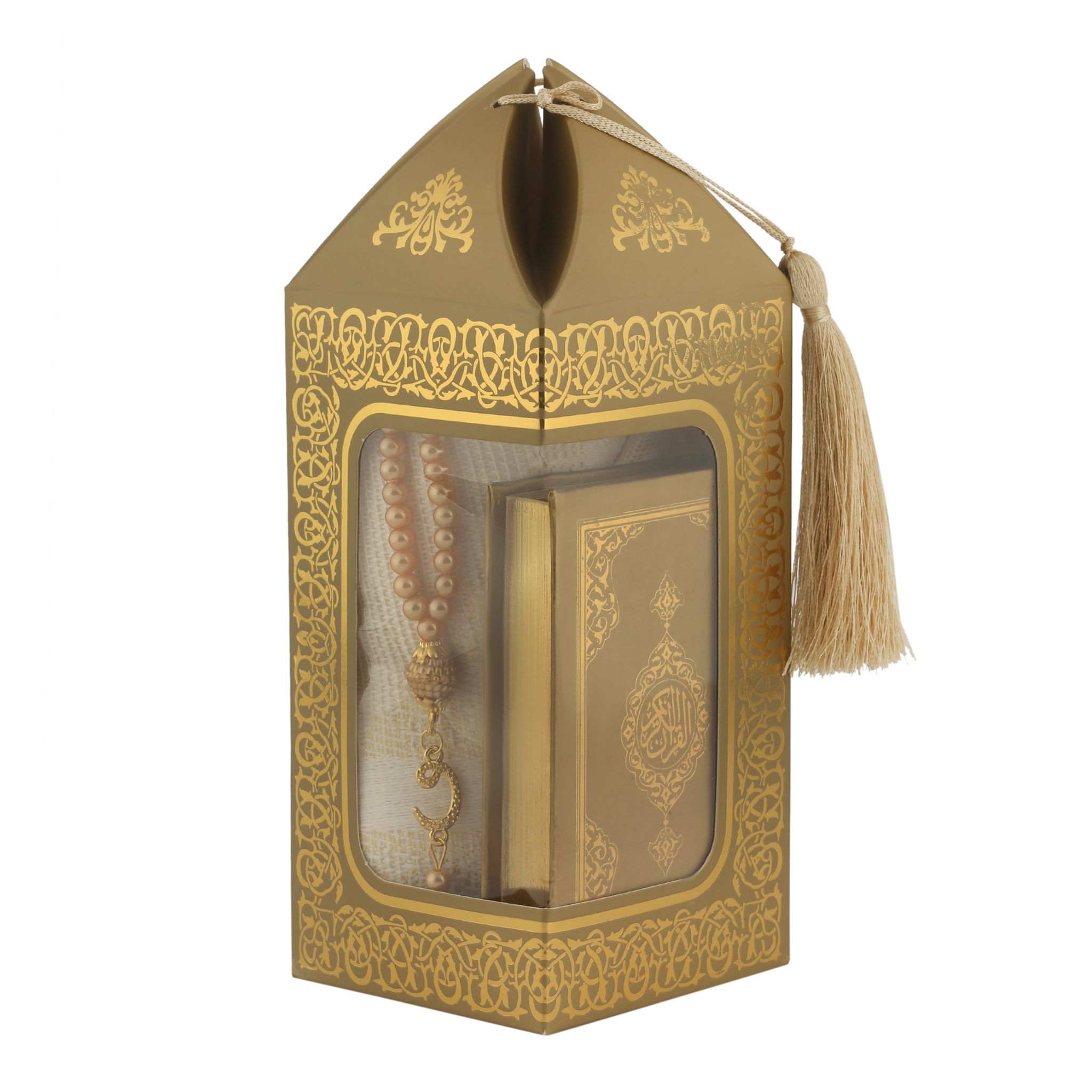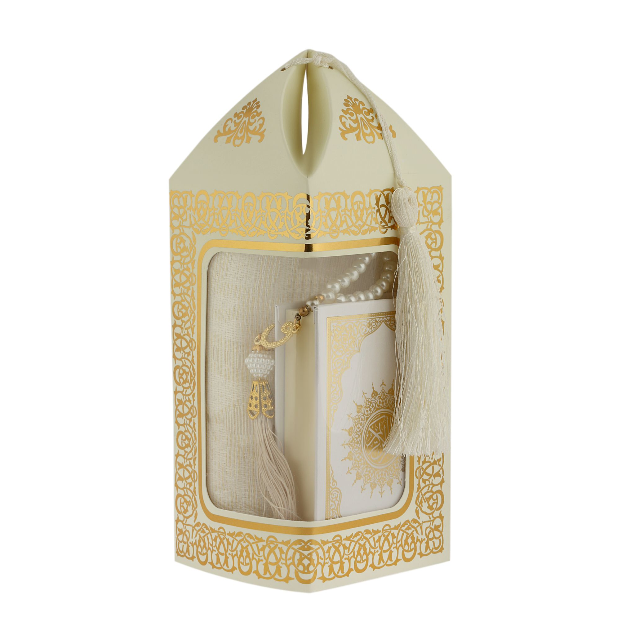 - Kraft kutu içerisinde 99'luk 6 mm Vavlı İnci Tesbih, 70x110 Tafta Seccade ve 8x12 Cm Cep Boy Kuran-ı Kerim ile beraber sunulur.