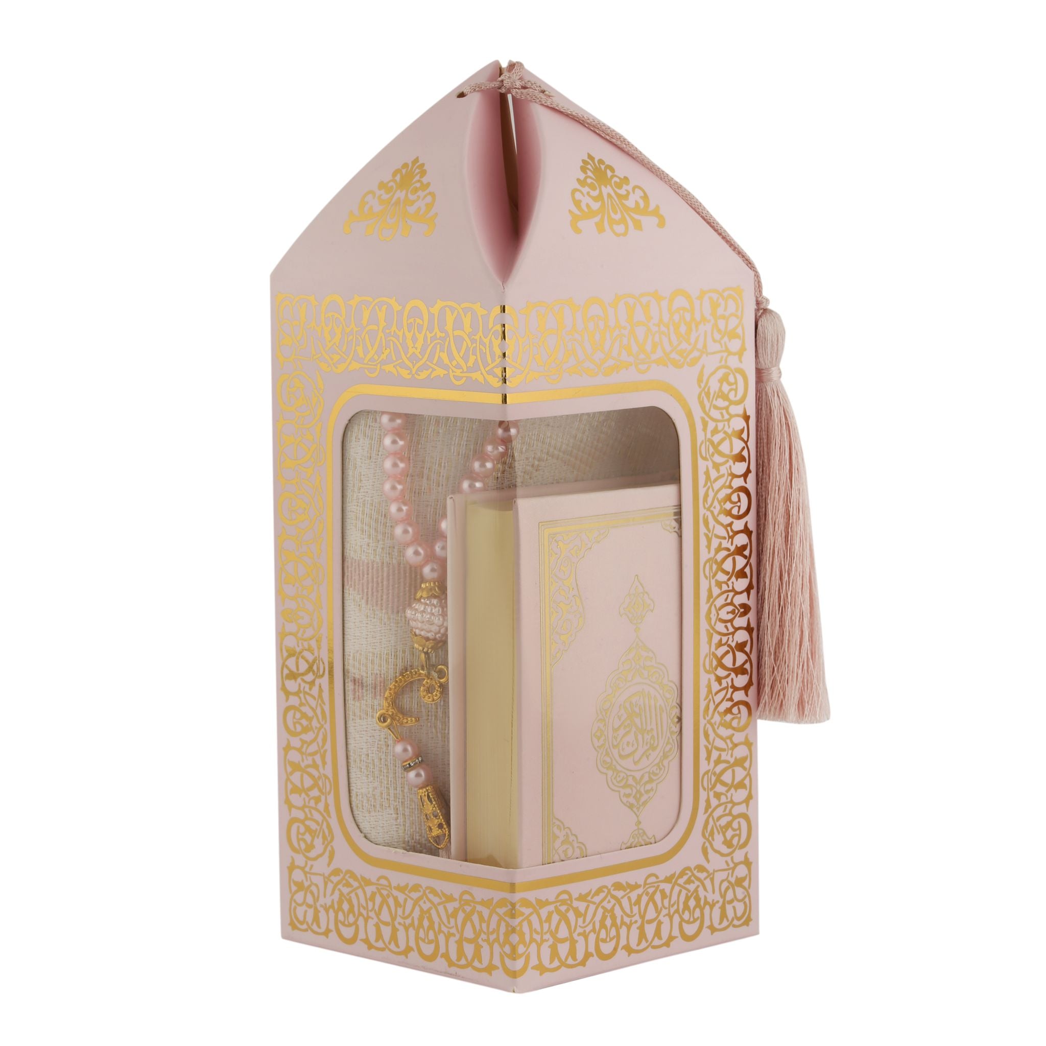 - Kraft kutu içerisinde 99'luk 6 mm Vavlı İnci Tesbih, 70x110 Tafta Seccade ve 8x12 Cm Cep Boy Kuran-ı Kerim ile beraber sunulur.
