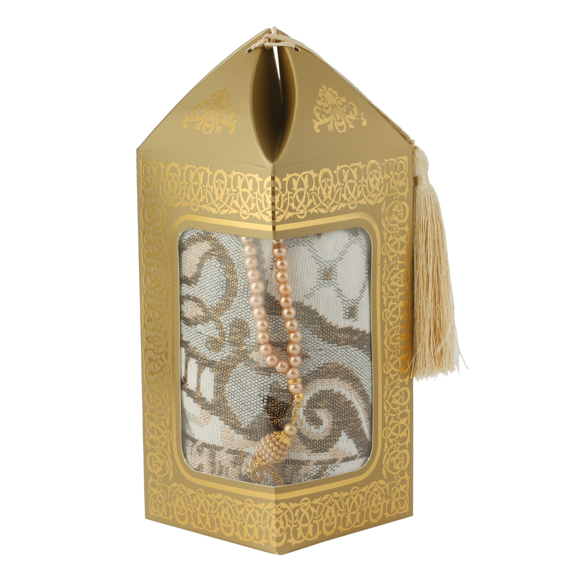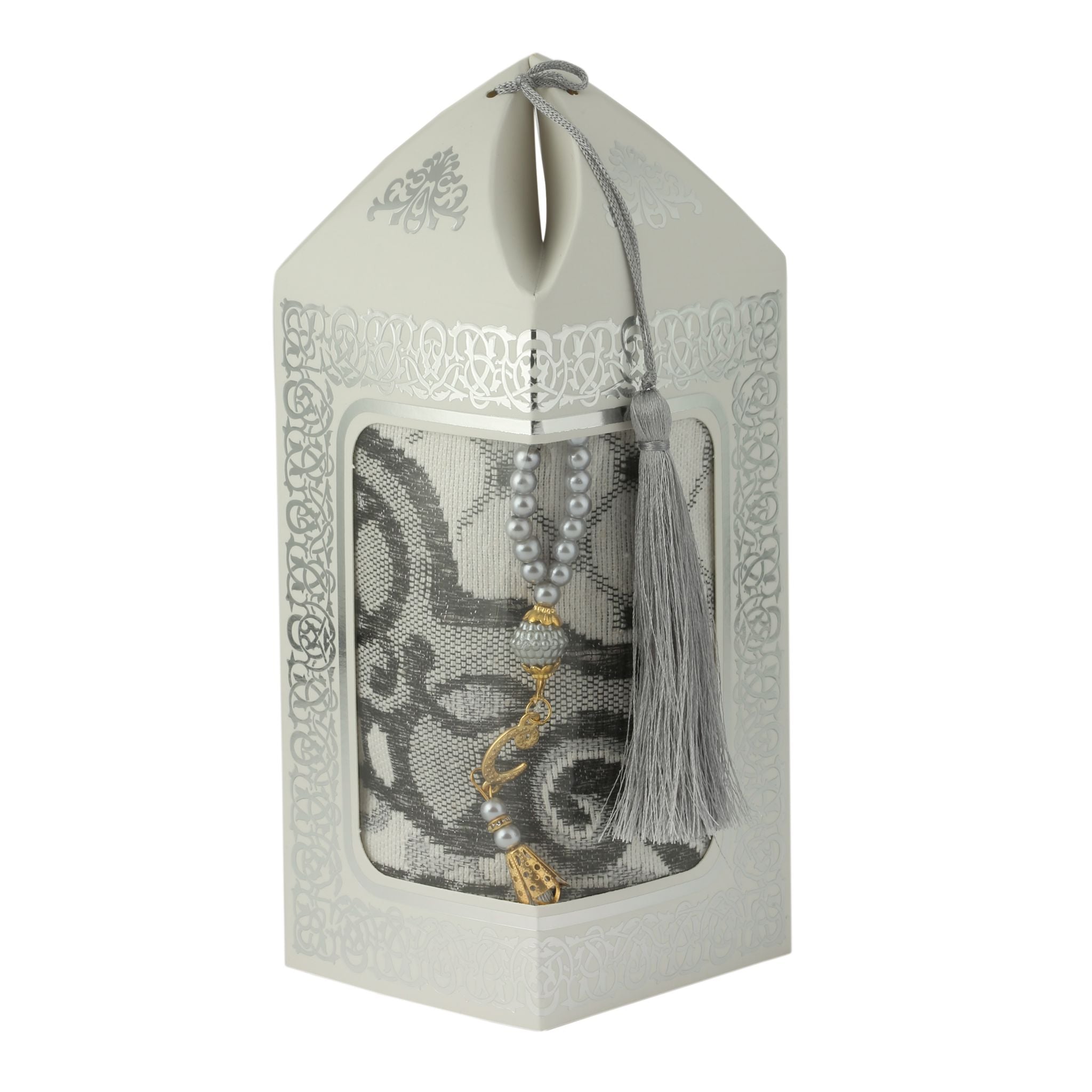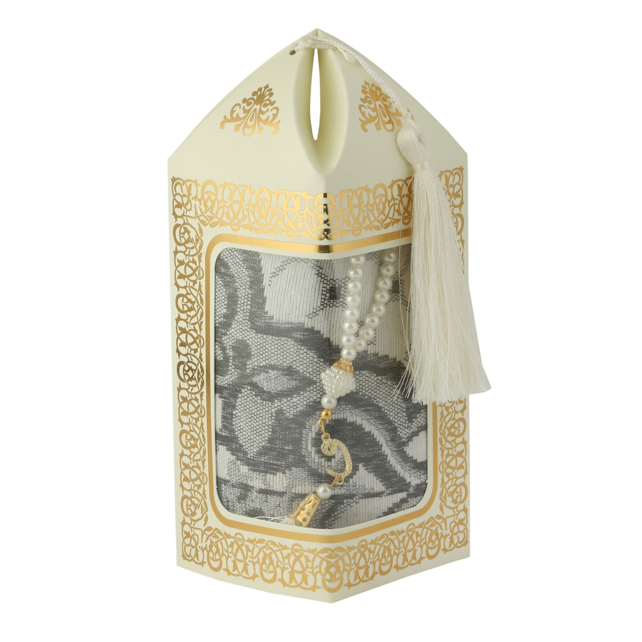 - Kraft kutu içerisinde 99'luk 6 mm Vavlı İnci Tesbih ve 70x110 210 Gr. Simli Brokar Seccade ile beraber sunulur.