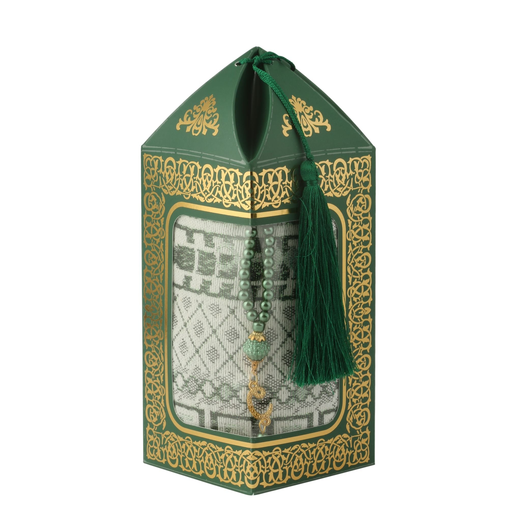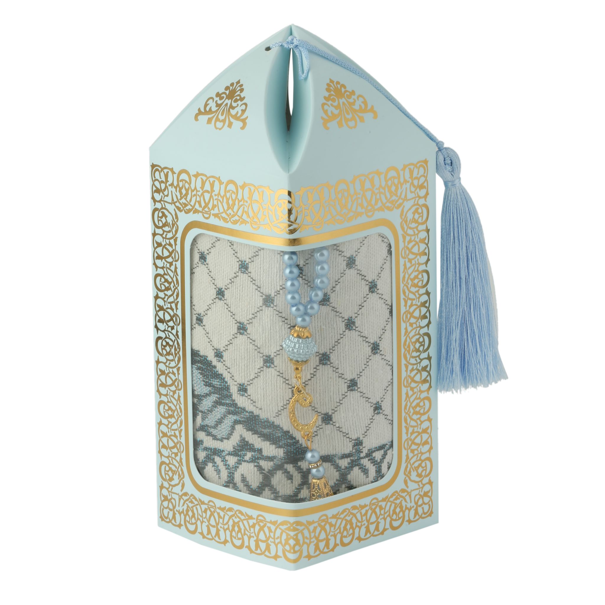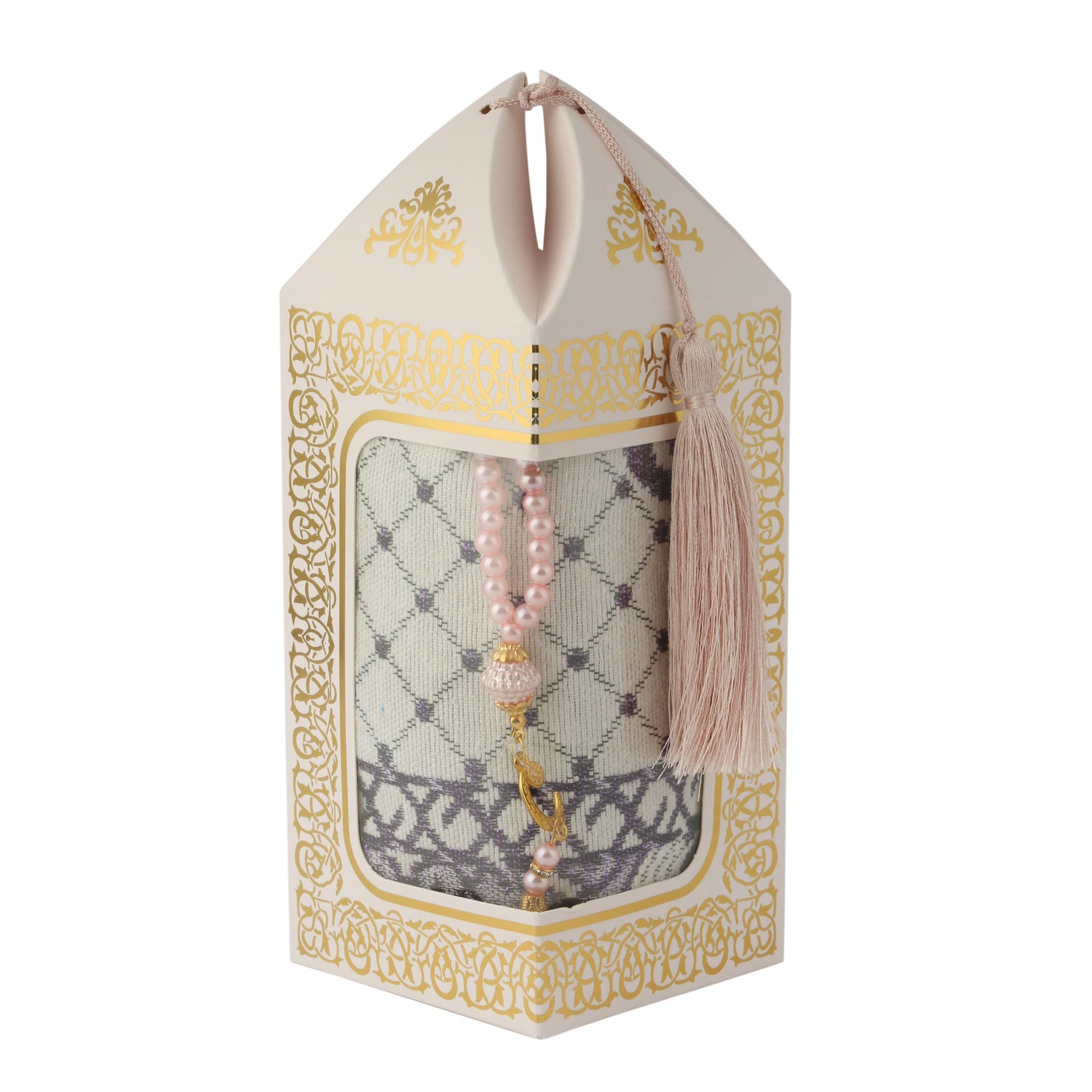 - Kraft kutu içerisinde 99'luk 6 mm Vavlı İnci Tesbih ve 70x110 210 Gr. Simli Brokar Seccade ile beraber sunulur.