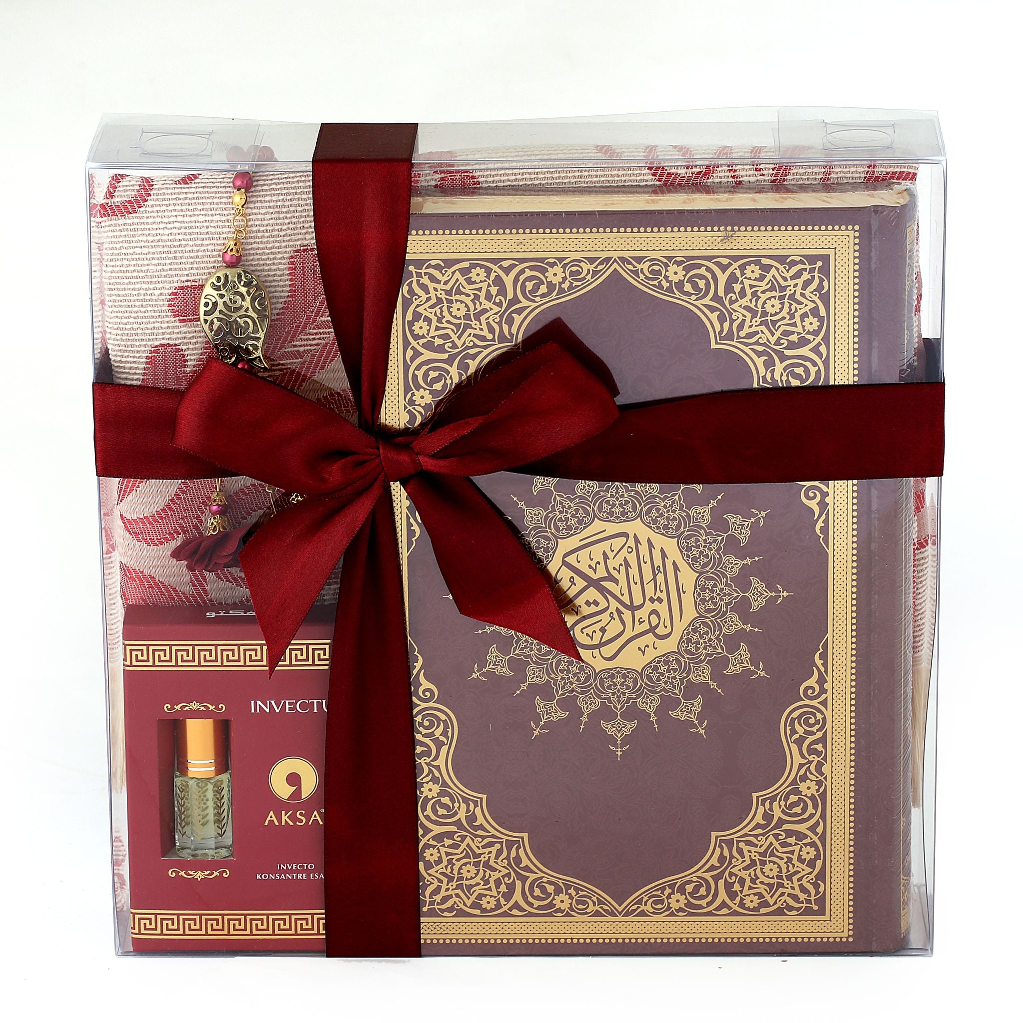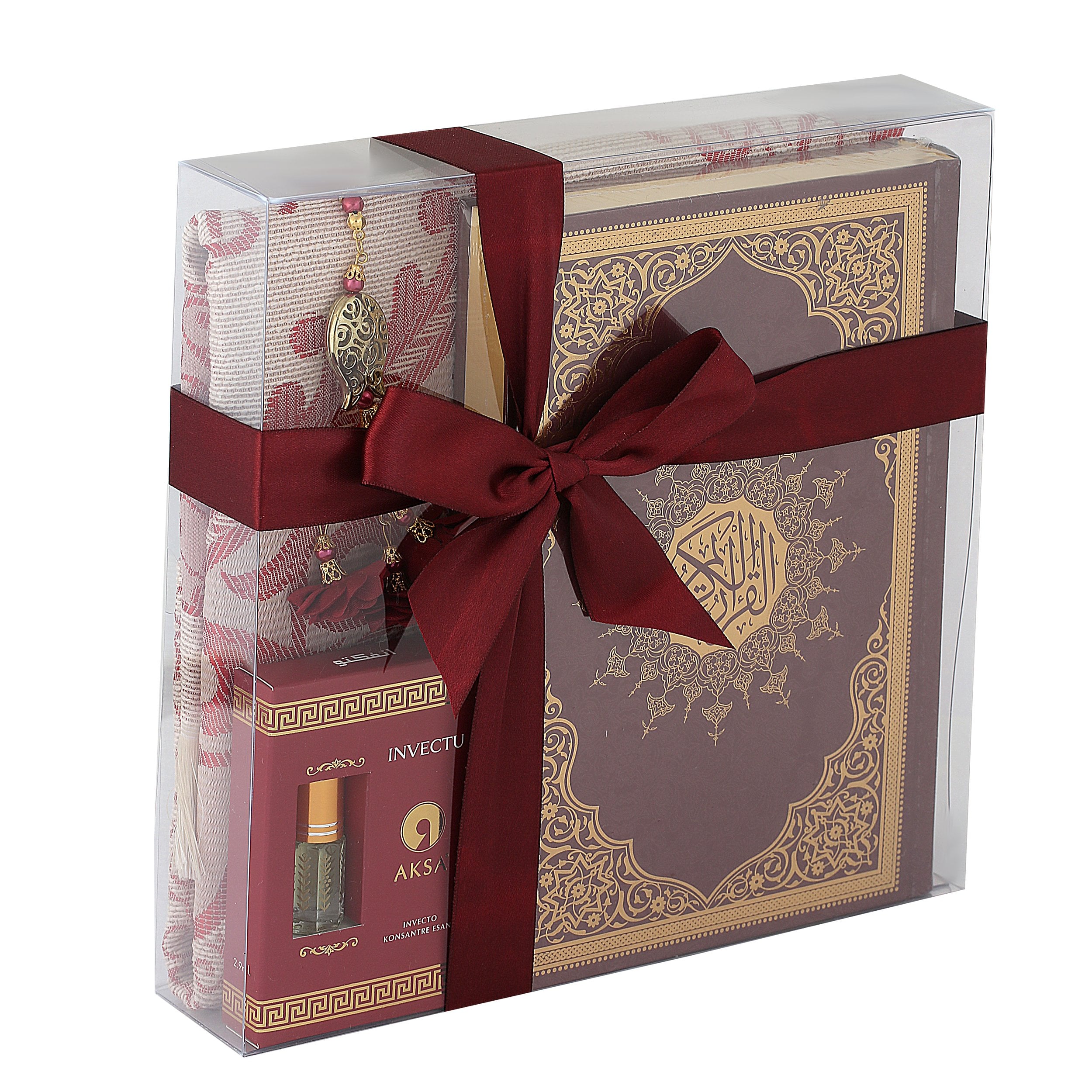 - Asetat kutu içerisinde 99'luk 6 mm Tasarım Tül Güllü Tesbih, 70x110 Tafta Seccade, 17x25 Cm Orta Boy Kuran-ı Kerim ve Kabe Örtüsü Koku ile beraber sunulur.