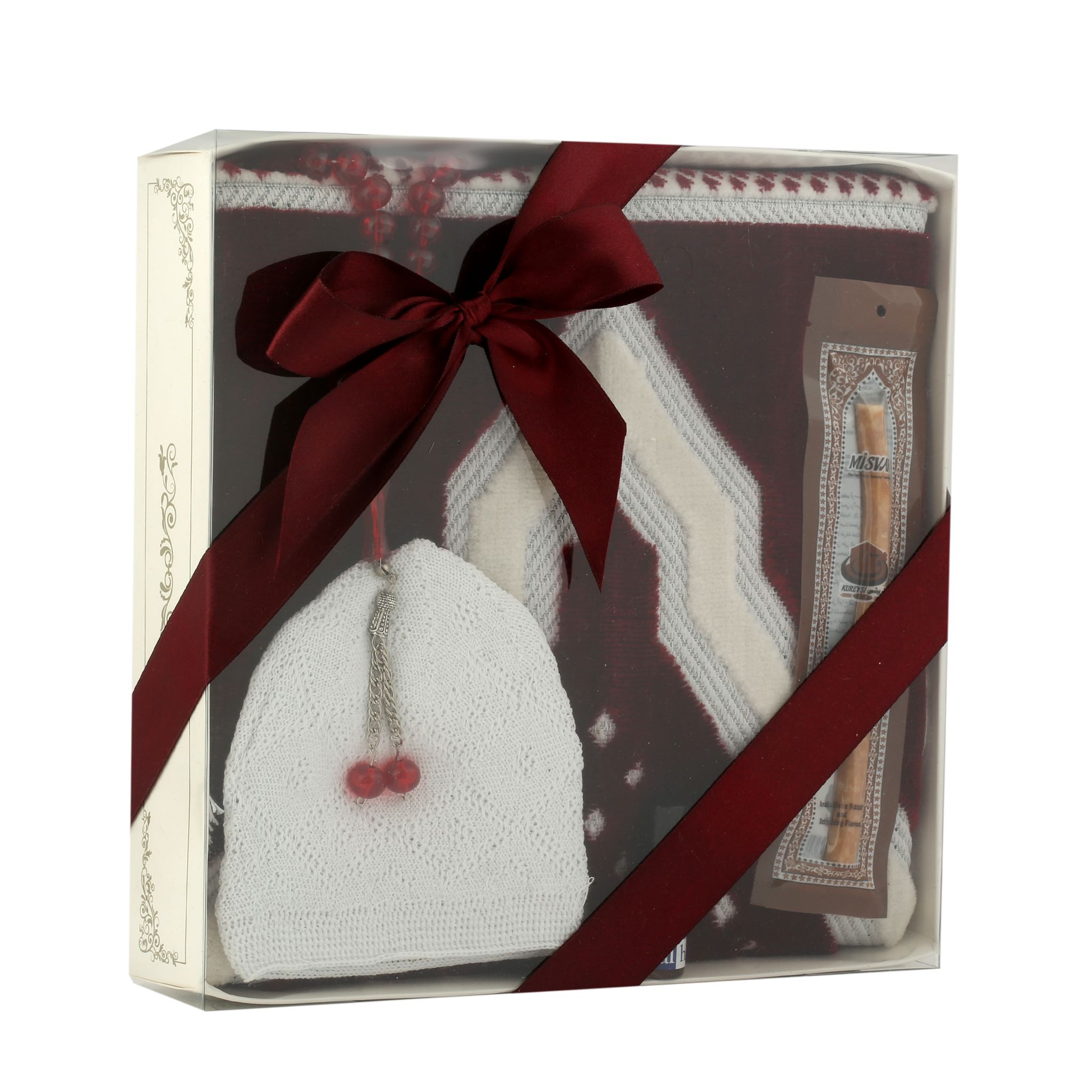 - Asetat kutu içerisinde 33'lük 14 mm Mono Tesbih, 5 ml Aksa Alhamra Safir Esans, 200 Gr 70x110 Versace Model Spiegel Seccade, Takke ve 6 inç Misvak ile beraber sunulur.