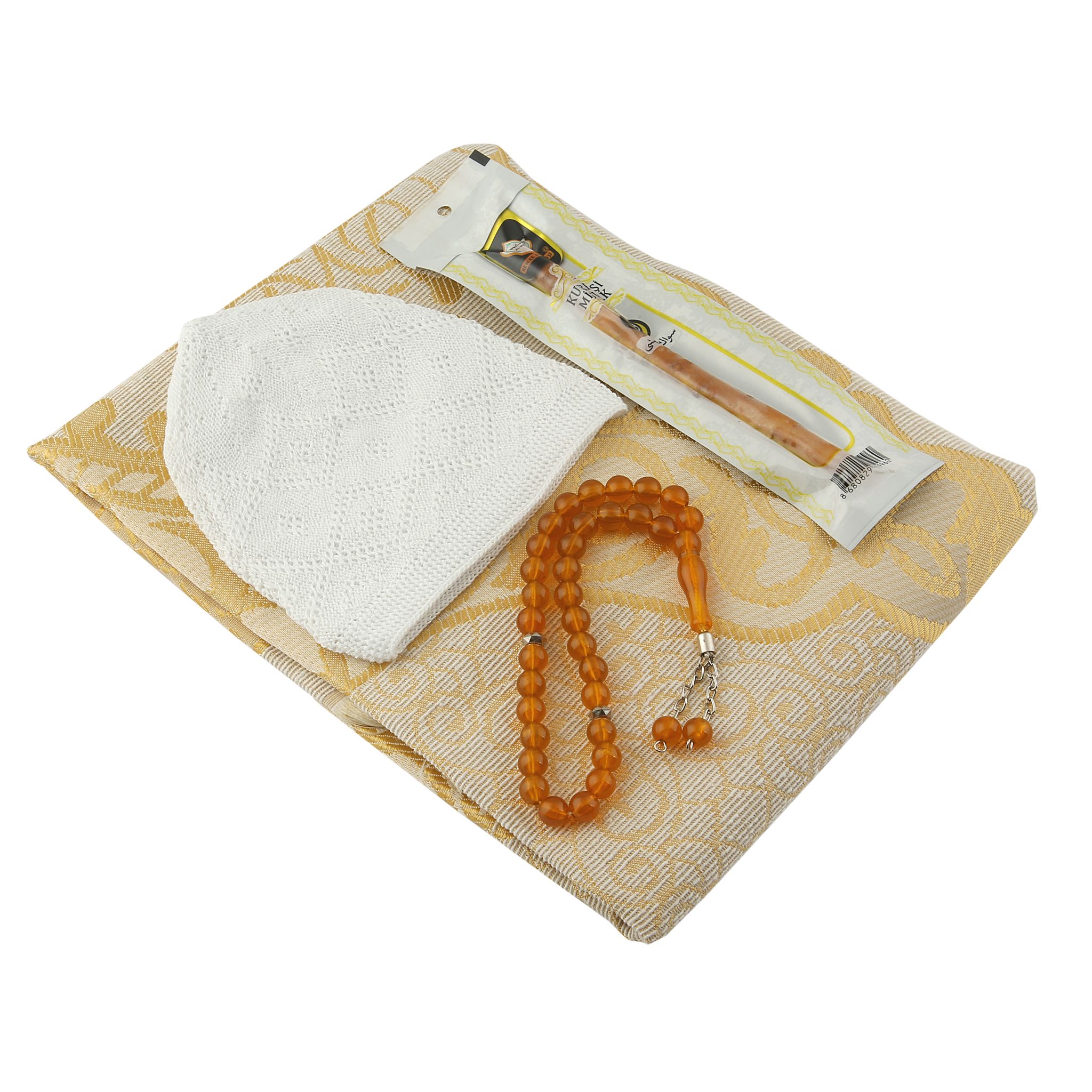 - Asetat kutu içerisinde 33'lük 10 mm Mono Tesbih, 200 Gr 70x110 Pamuk Tafta, Takke ve 6 inç Misvak ile beraber sunulur.
