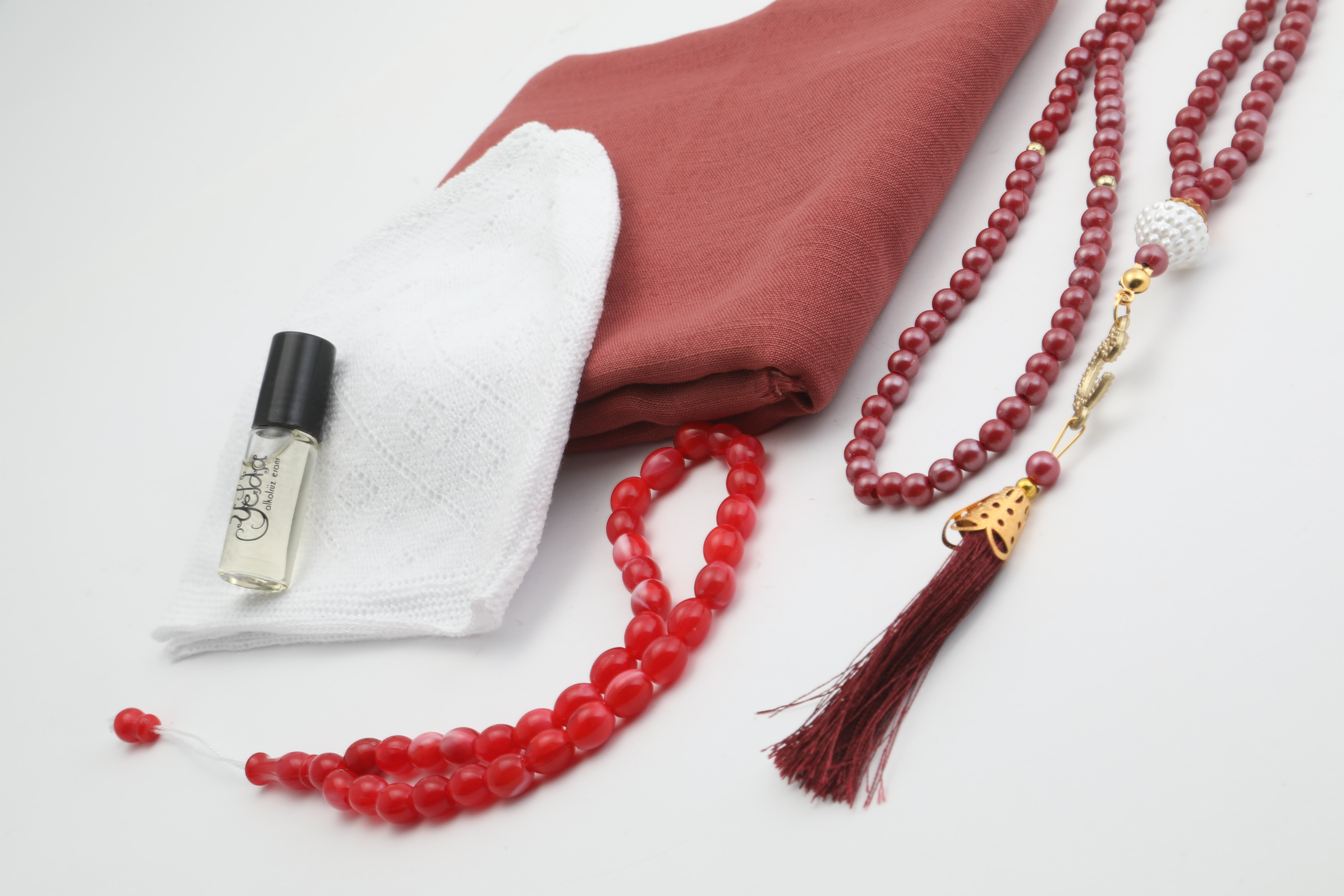 Hediyelik Eşarp Tesbih Esans Takke Seti: