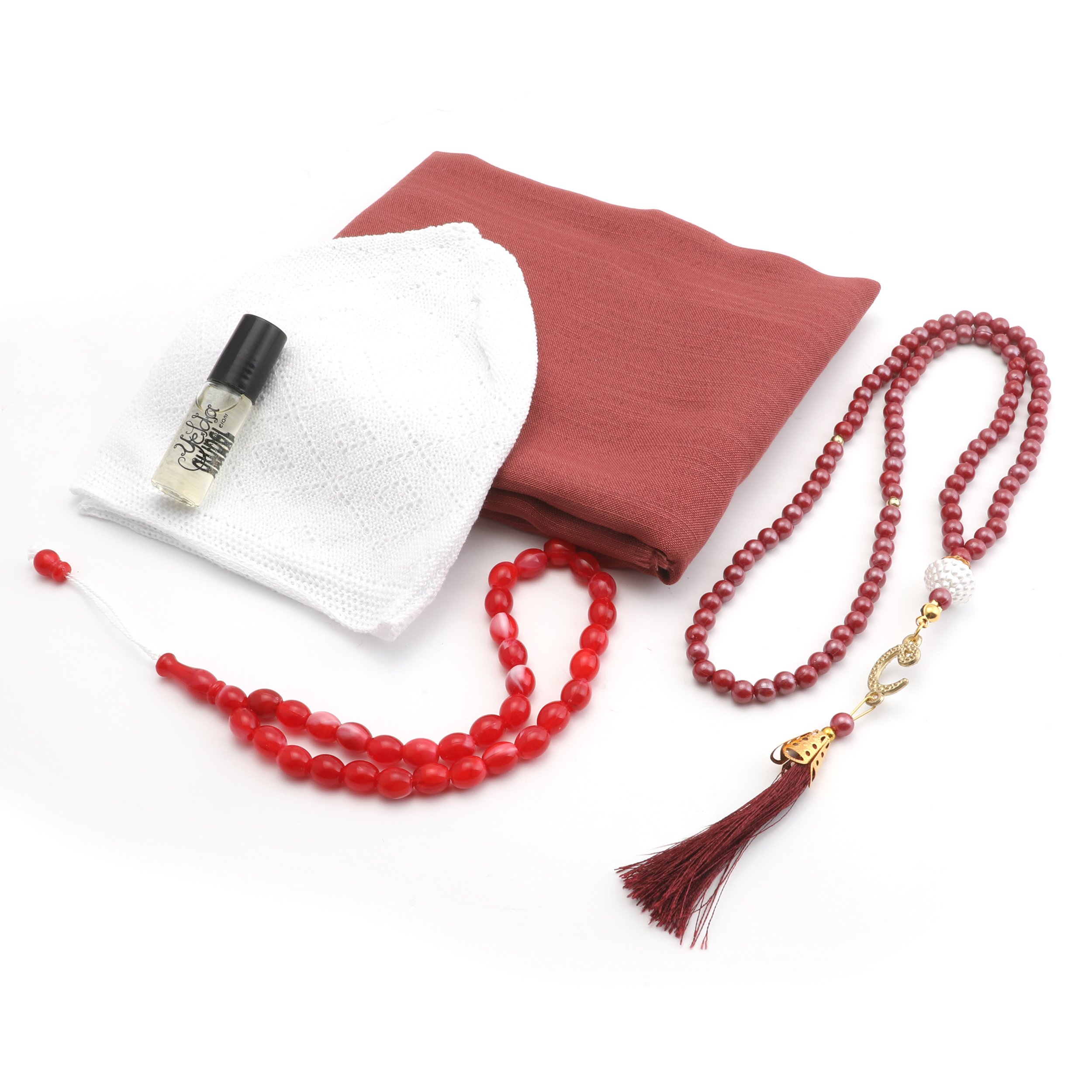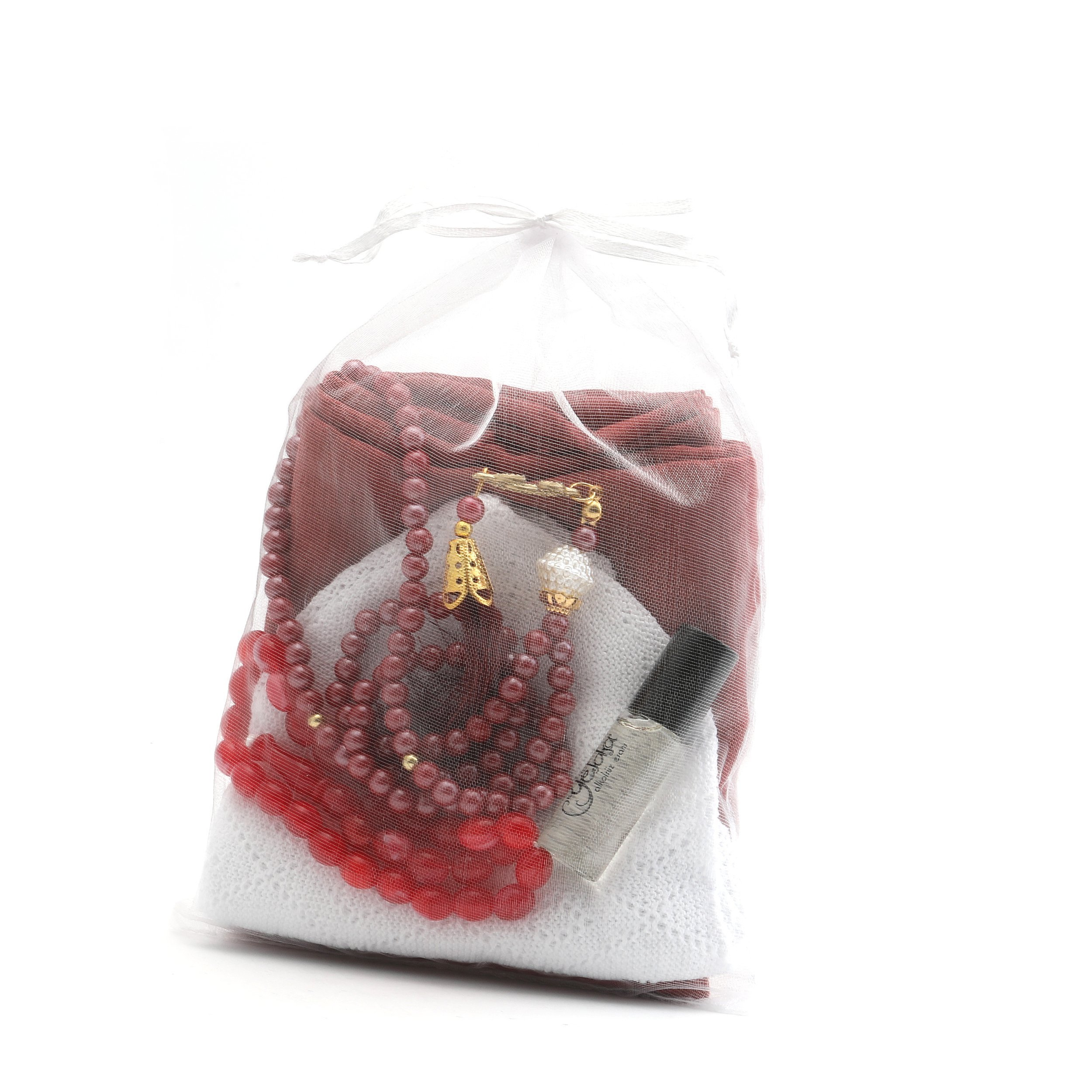 Hediyelik Eşarp Tesbih Esans Takke Seti Bordo