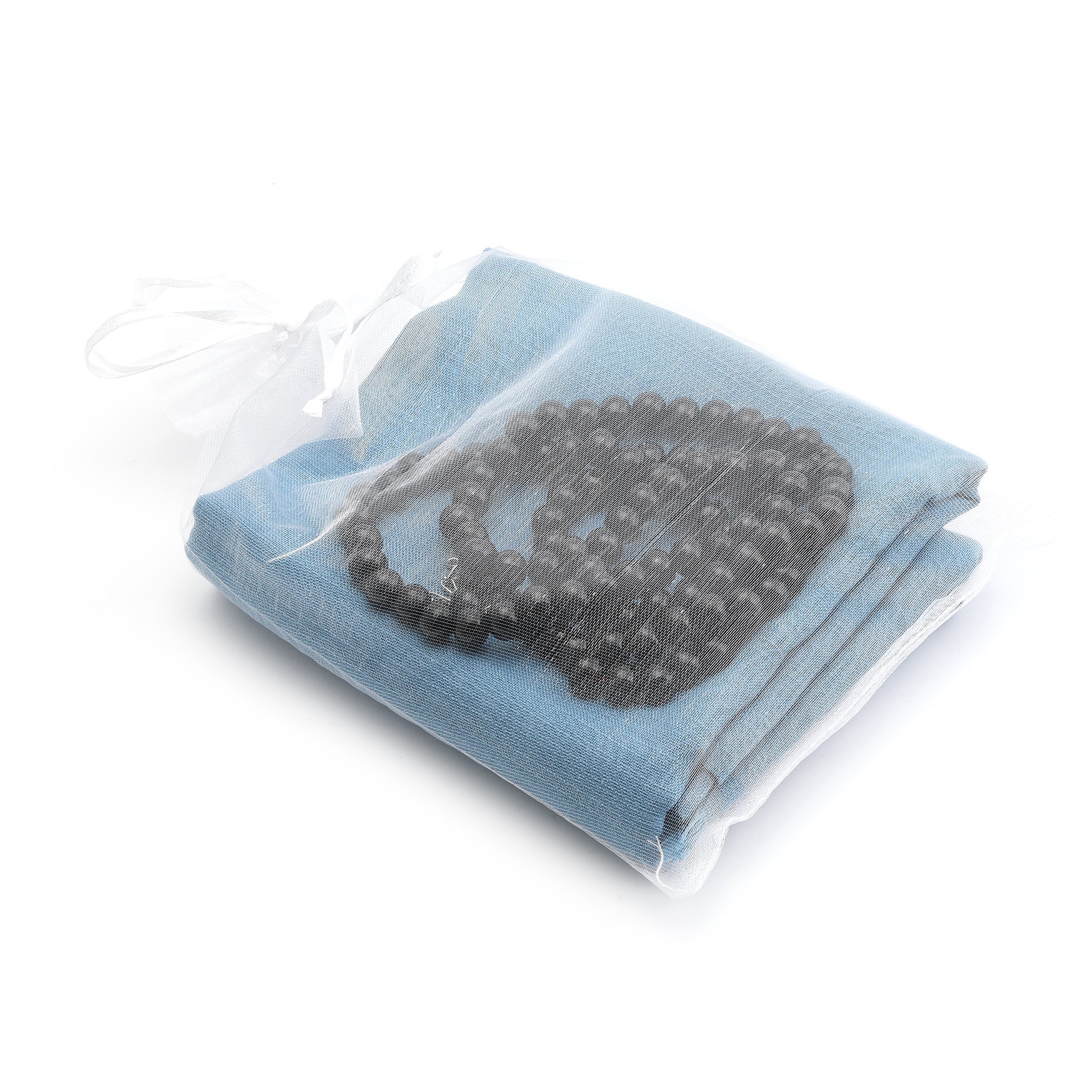 - Tül Kese içerisinde 100 Cm Flamlı Düz Eşarp Ve 99'luk 10 mm Zincirli Tesbih ile beraber sunulur.