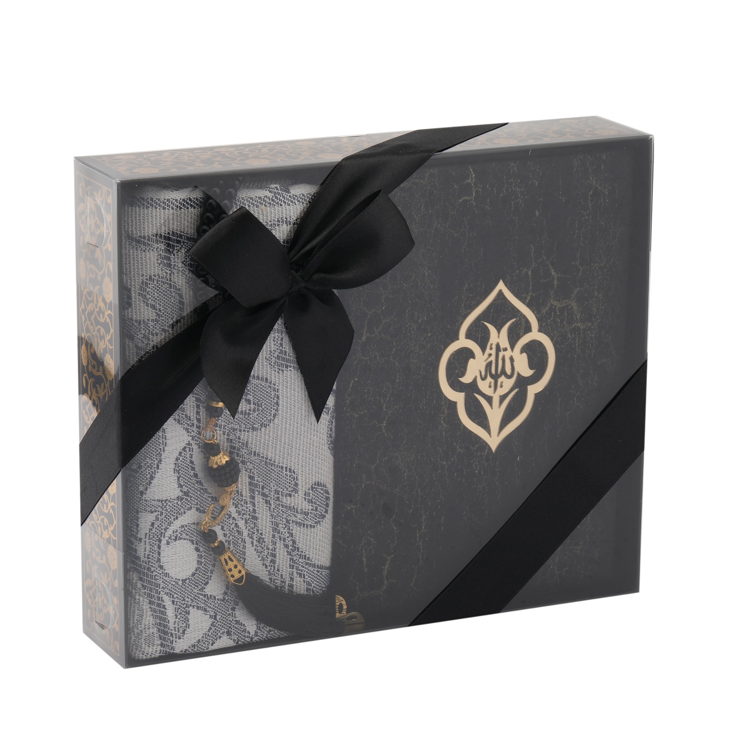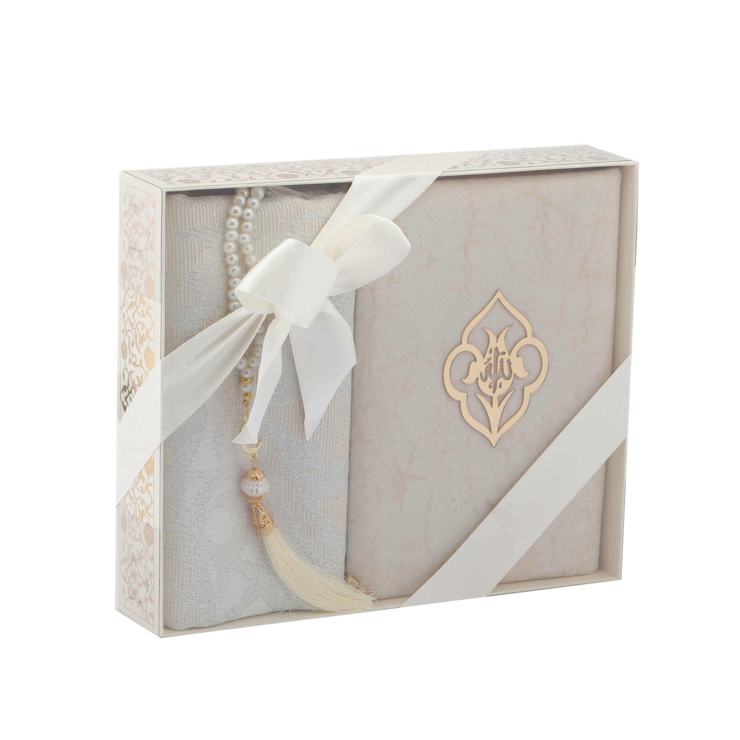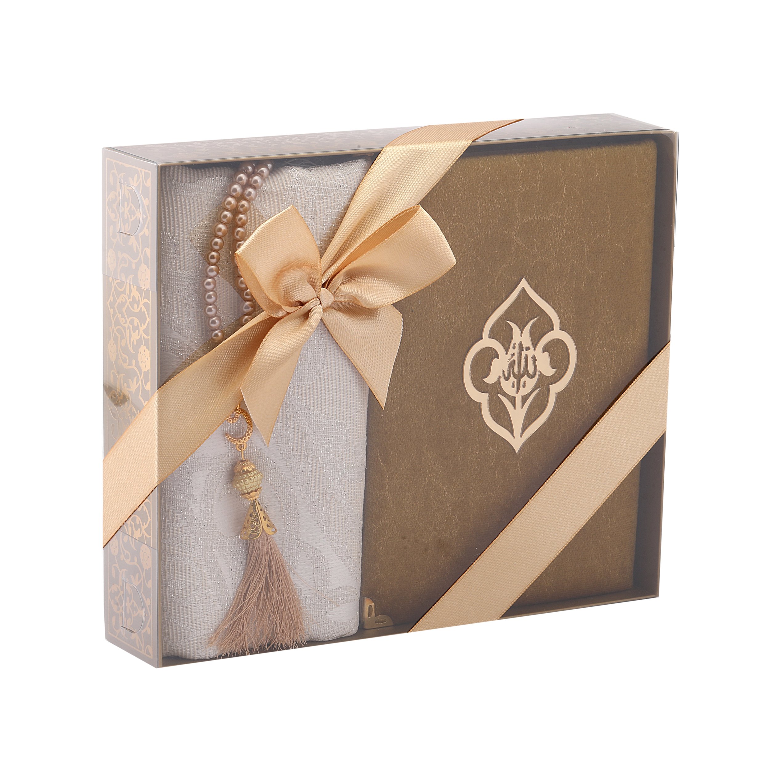 - Asetat kutu içerisinde 70x120 Cm Simli Tafta Seccade ve 14x20 Cm Hafız Boy Mermer Desen Kadife Kuran-ı Kerim,99'luk 6 mm Vavlı İnci Tesbih ile beraber sunulur.