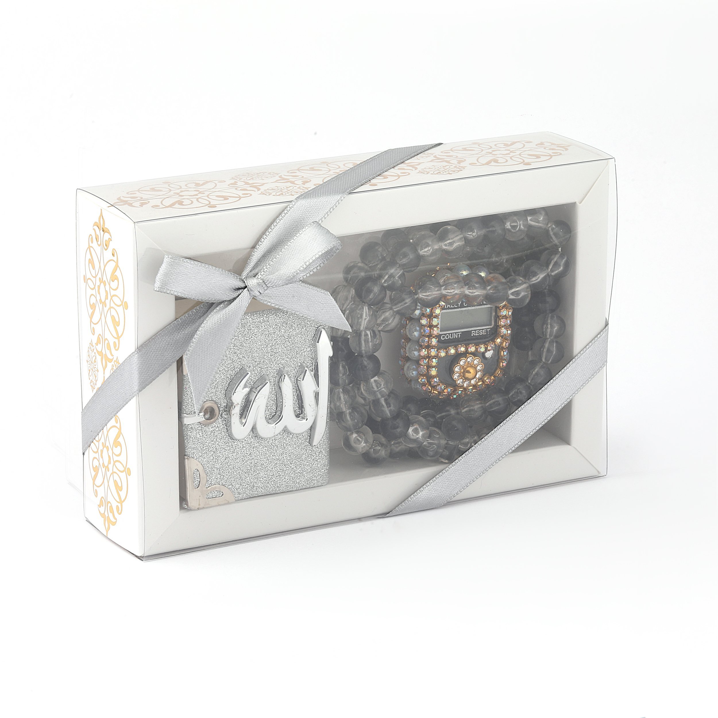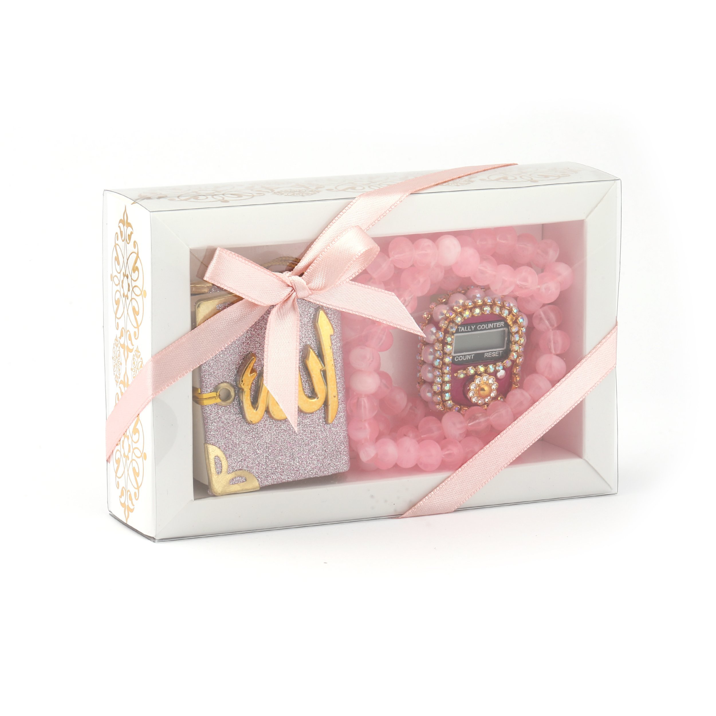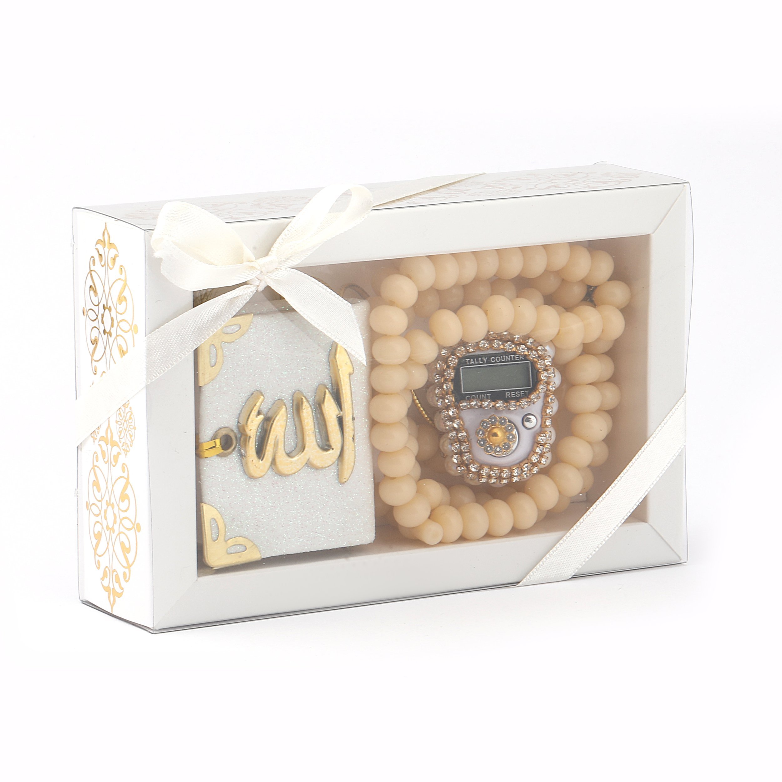 - Asetat kutu içerisinde taşlı zikirmatik, kadife tam mini simli Kuran-ı Kerim otosüs ve 99'luk 10 mm zincirli tesbih ile beraber sunulur.