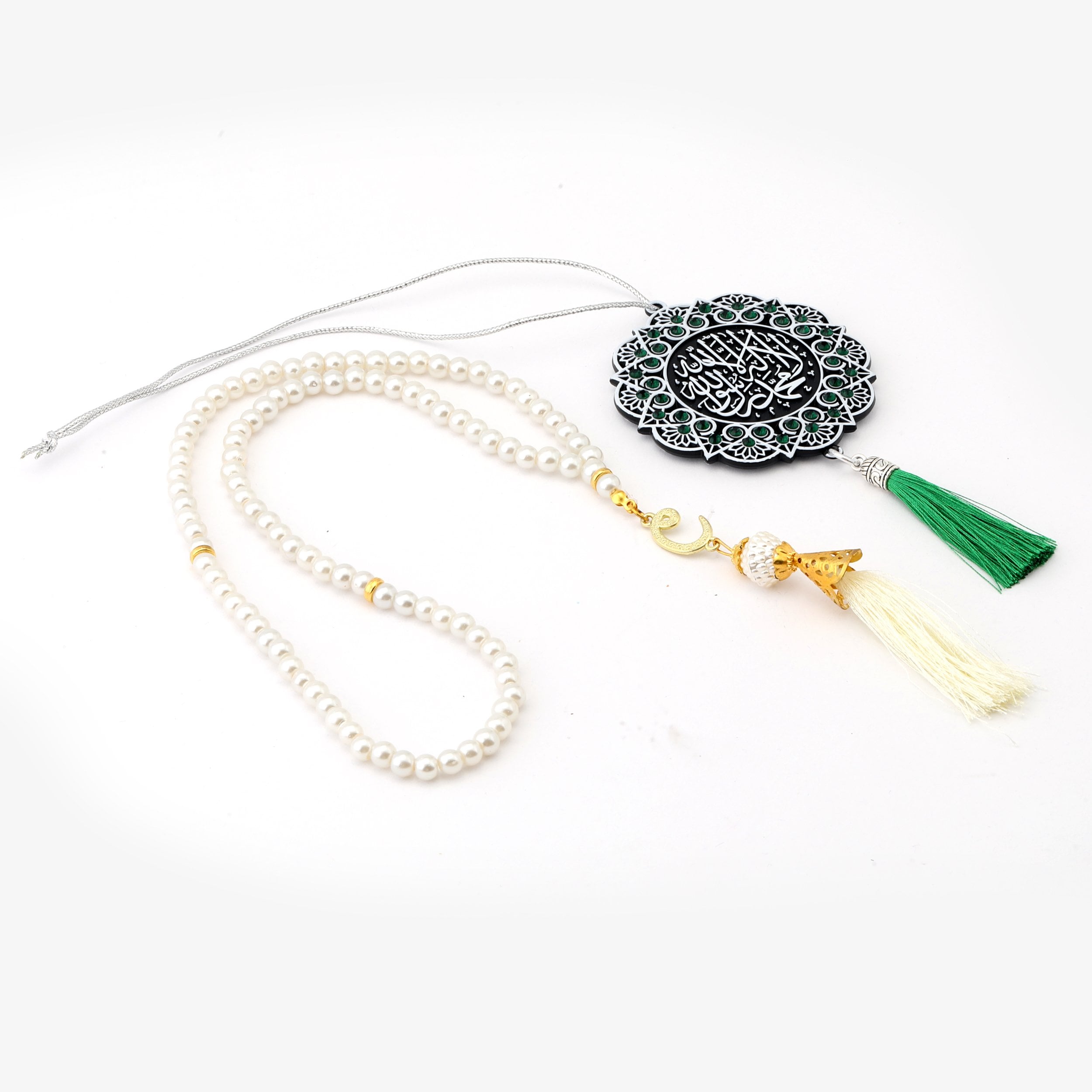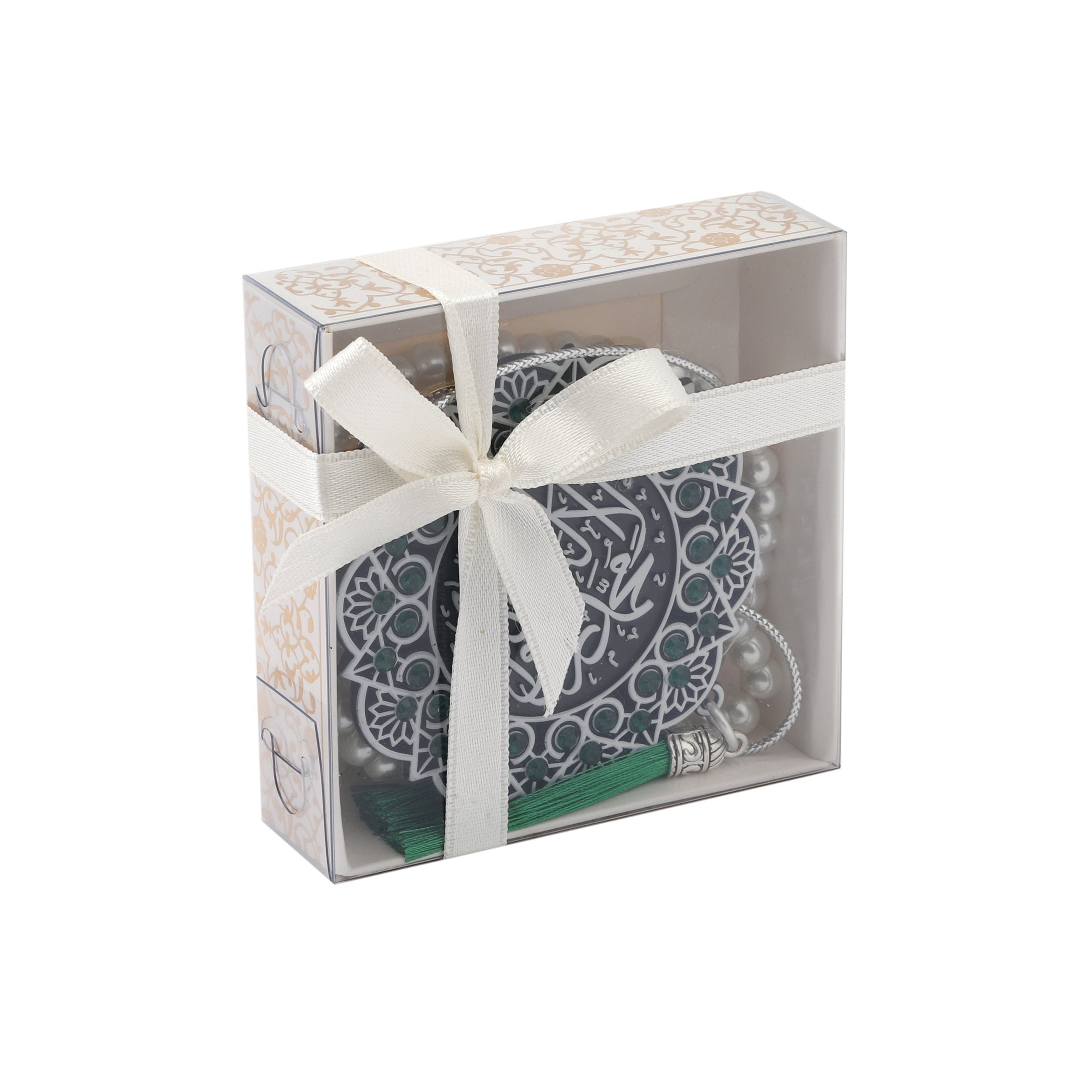 - Asetat kutu içerisinde 99'luk 6 mm Vavlı İnci Tesbih, 7 Cm Papatya Maskot Otosüs ile beraber sunulur.