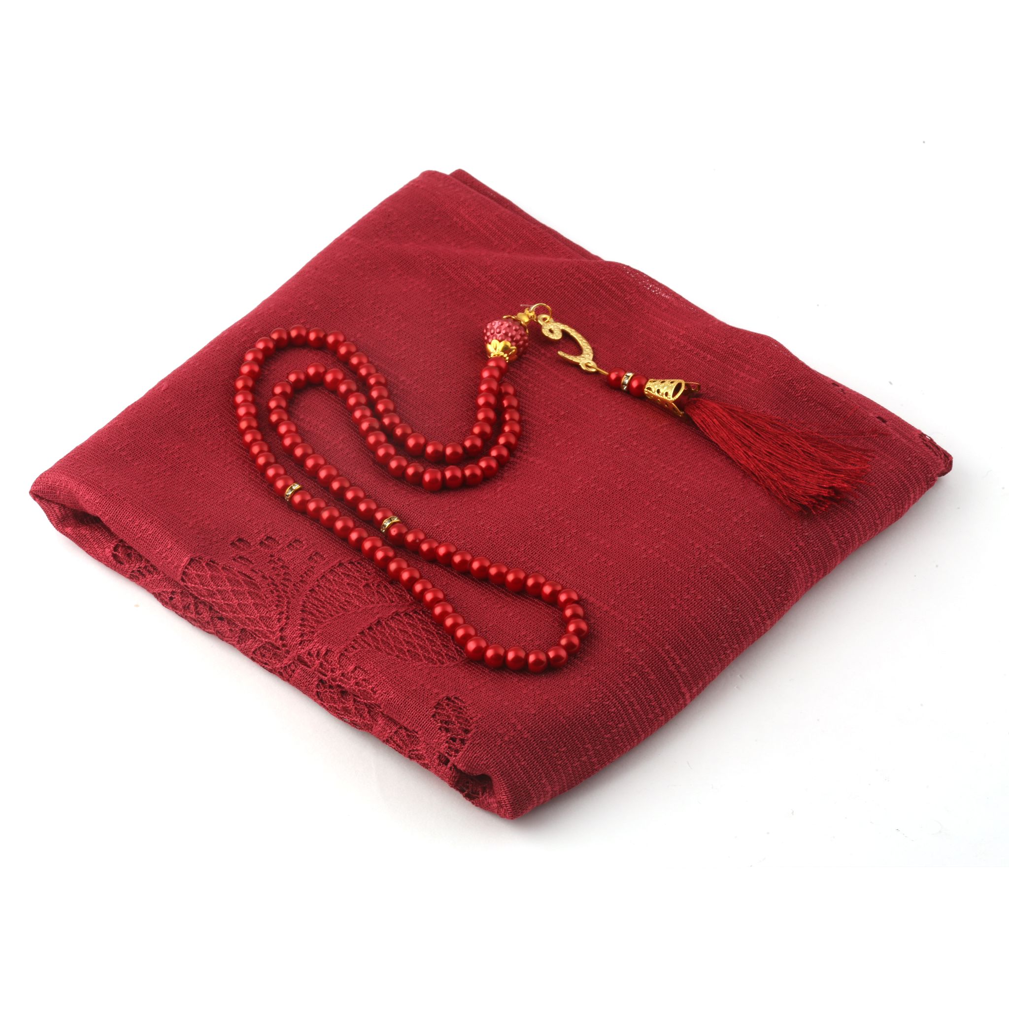 - Asetat kutu içerisinde 99'luk 6 mm Vavlı İnci Tesbih ve Delikli Motifli Şal ile beraber sunulur.