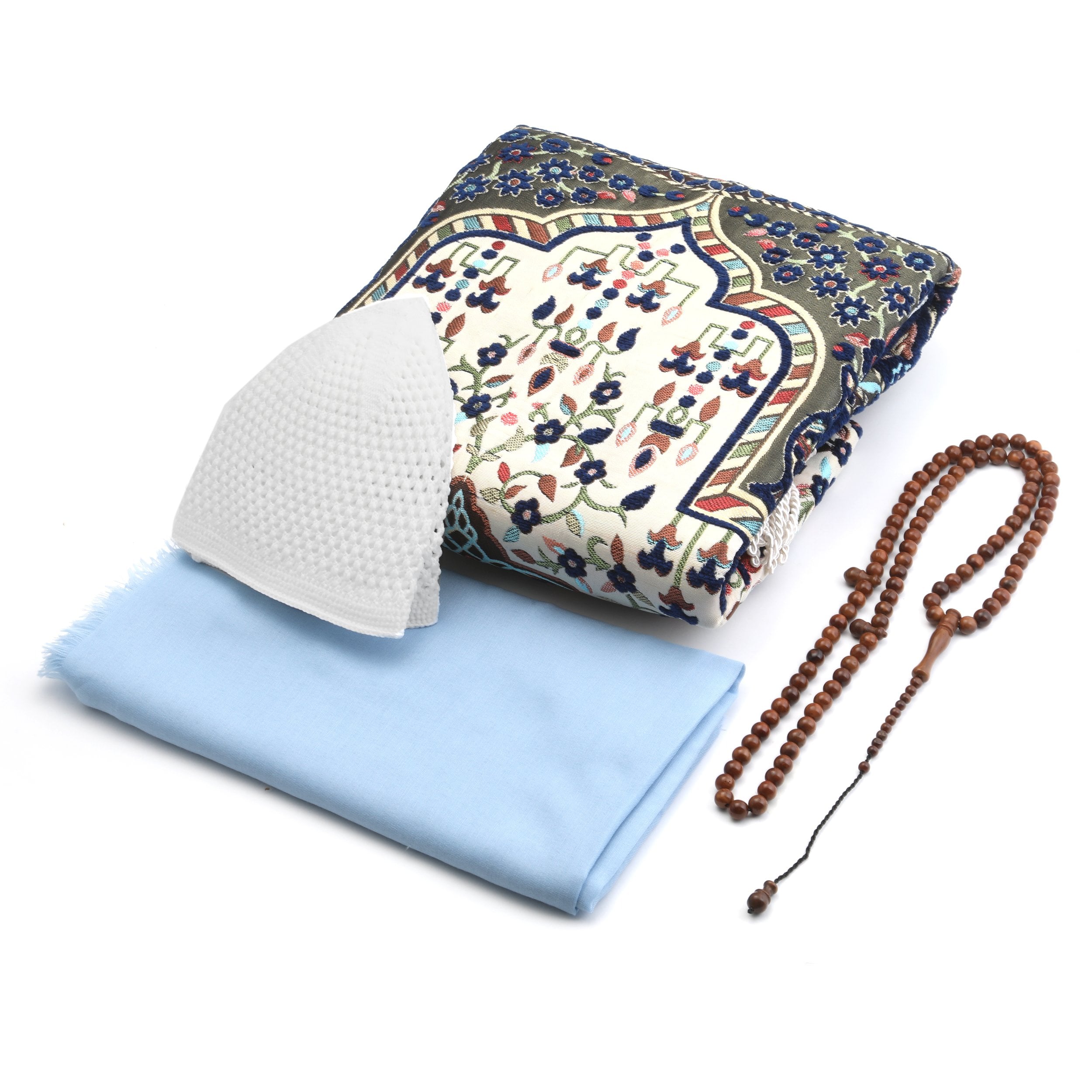 - Asetat kutu içerisinde 70x110 Cm Astarlı Toros Seccade, 100 Cm Renkli Pamuk Eşarp, 99'luk 8 mm Yuvarlak Kuka Tesbih ve Soylu Takke ile beraber sunulur.