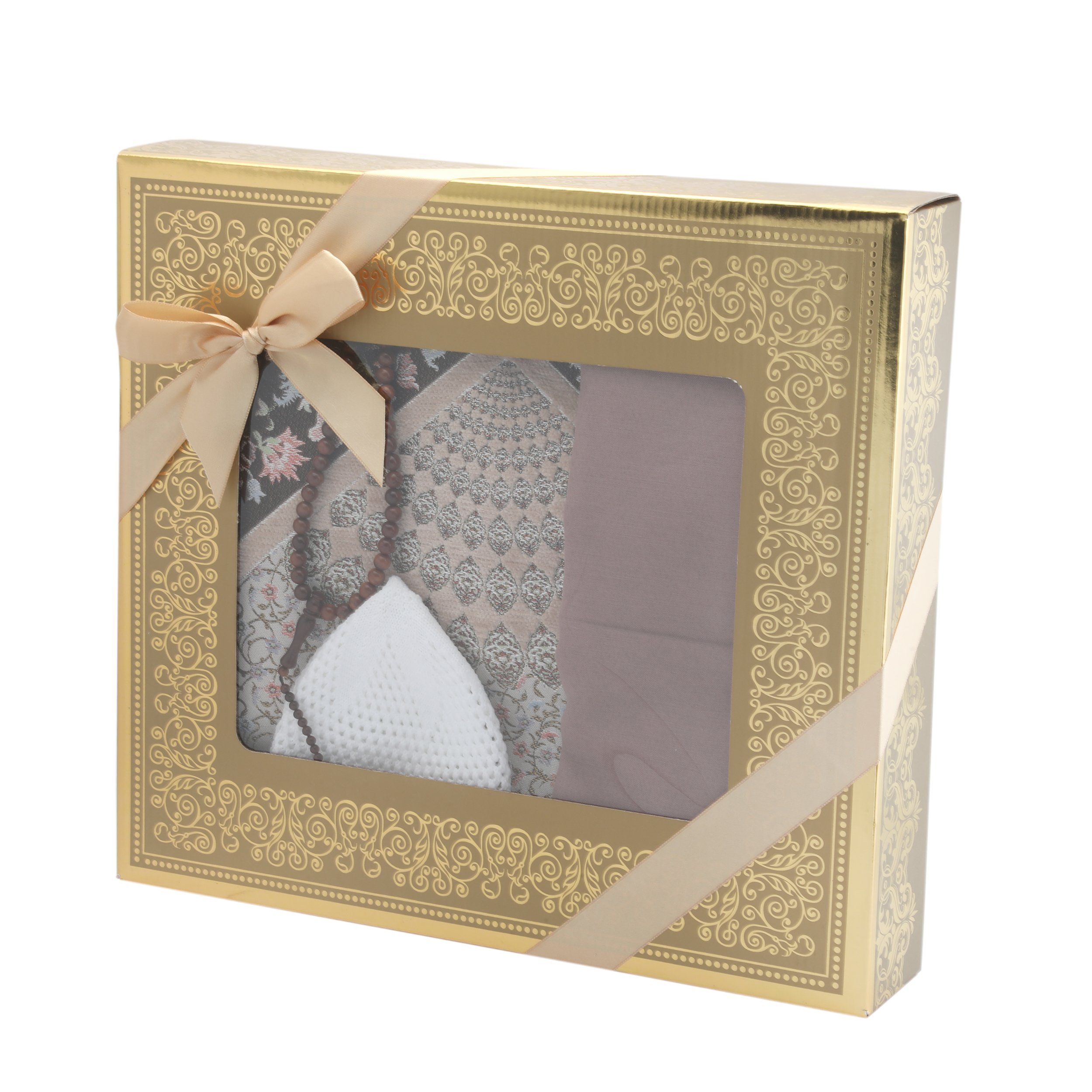 - Asetat kutu içerisinde 70x110 Cm Astarlı Toros Seccade, 100 Cm Renkli Pamuk Eşarp, 99'luk 8 mm Yuvarlak Kuka Tesbih ve Soylu Takke ile beraber sunulur.
