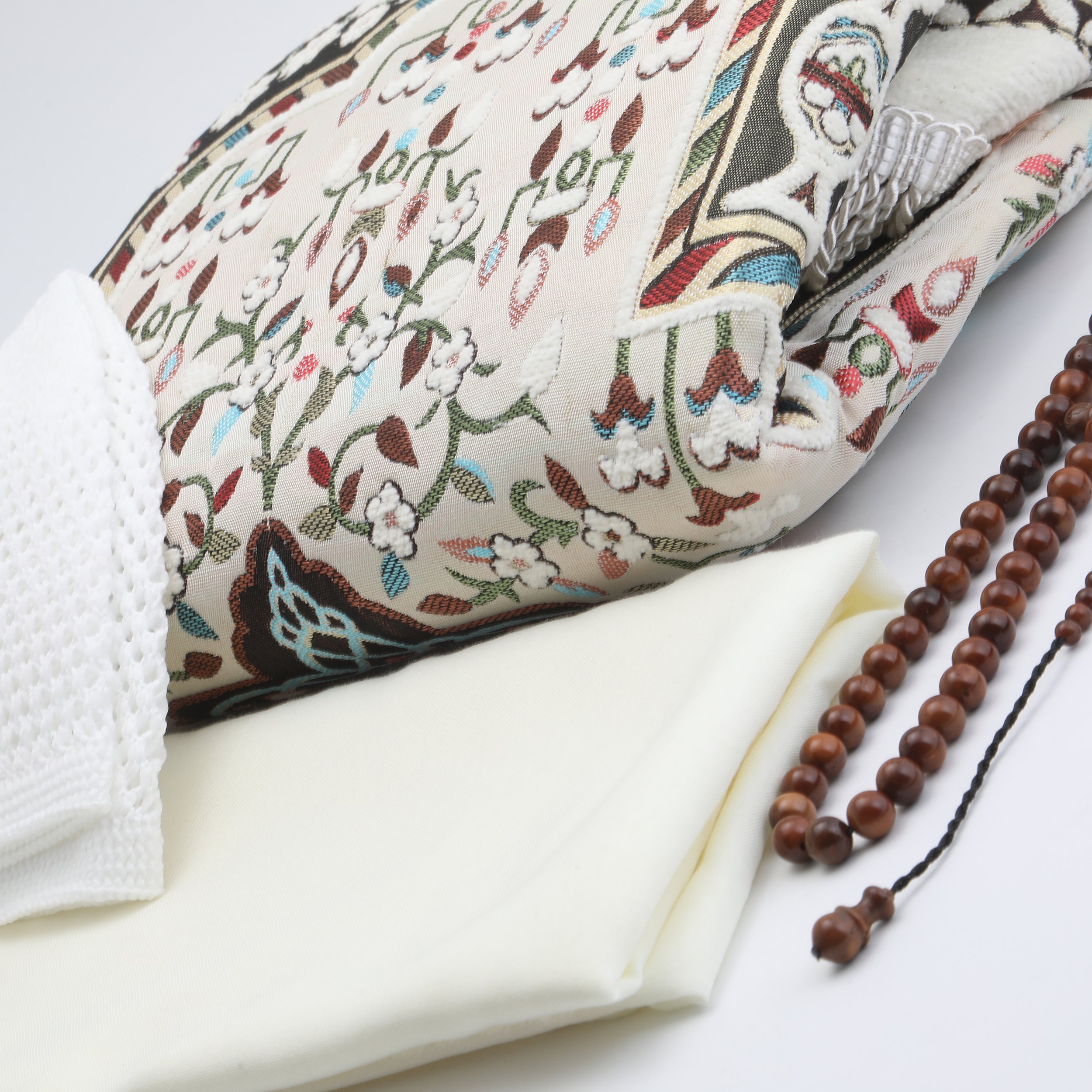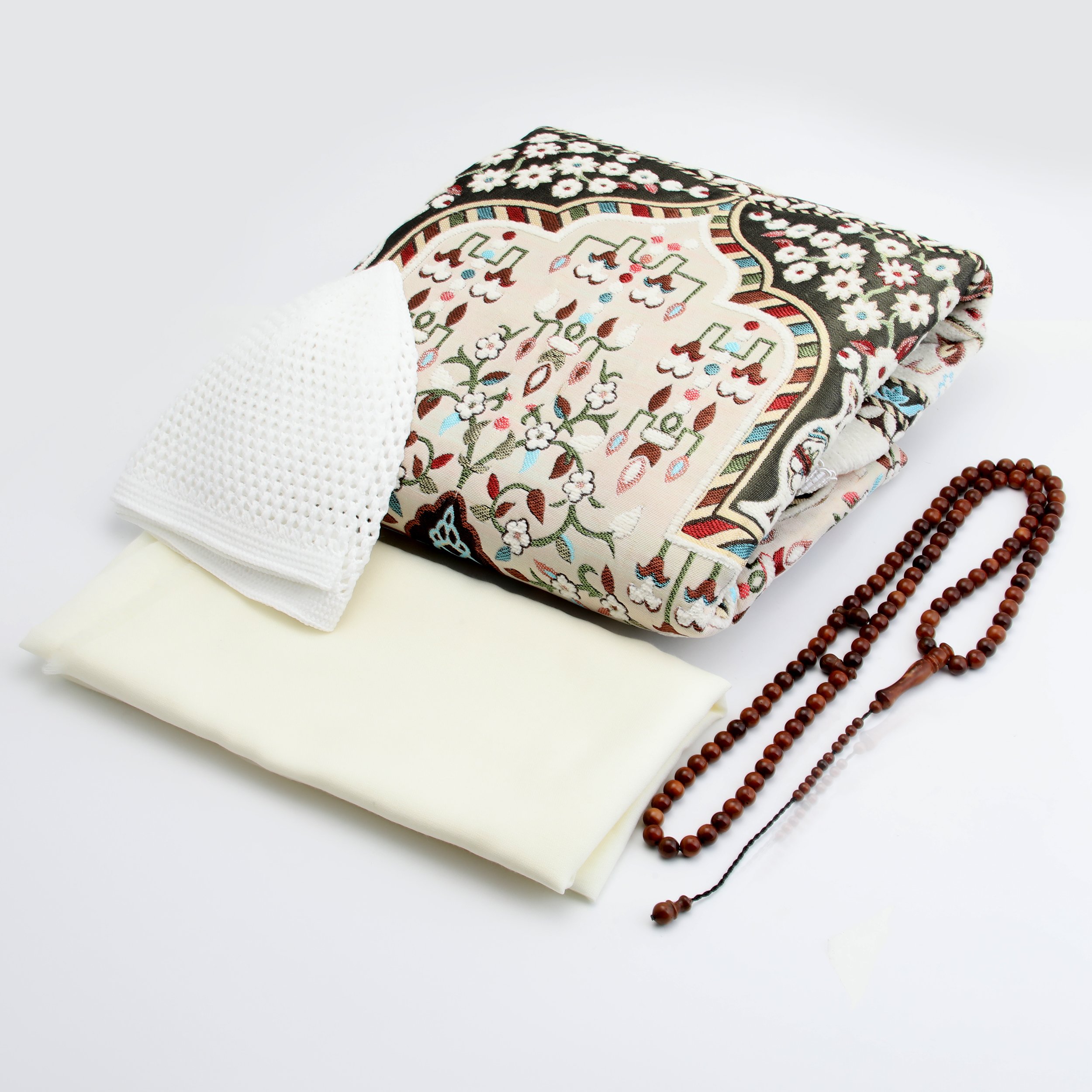 Hediyelik Seccade Eşarp Tesbih Takke Seti Krem