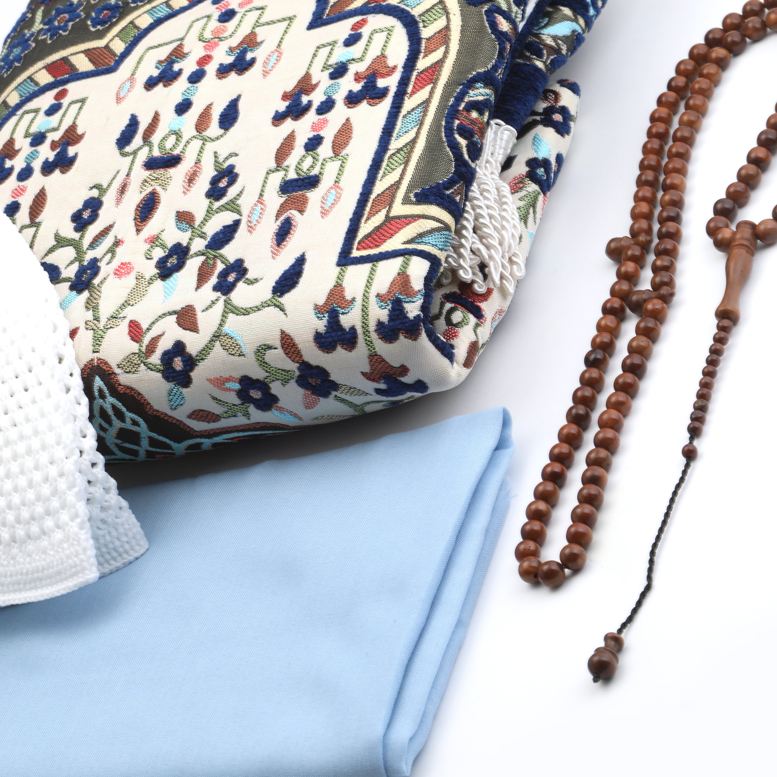 - Asetat kutu içerisinde 70x110 Cm Astarlı Toros Seccade, 100 Cm Renkli Pamuk Eşarp, 99'luk 8 mm Yuvarlak Kuka Tesbih ve Soylu Takke ile beraber sunulur.