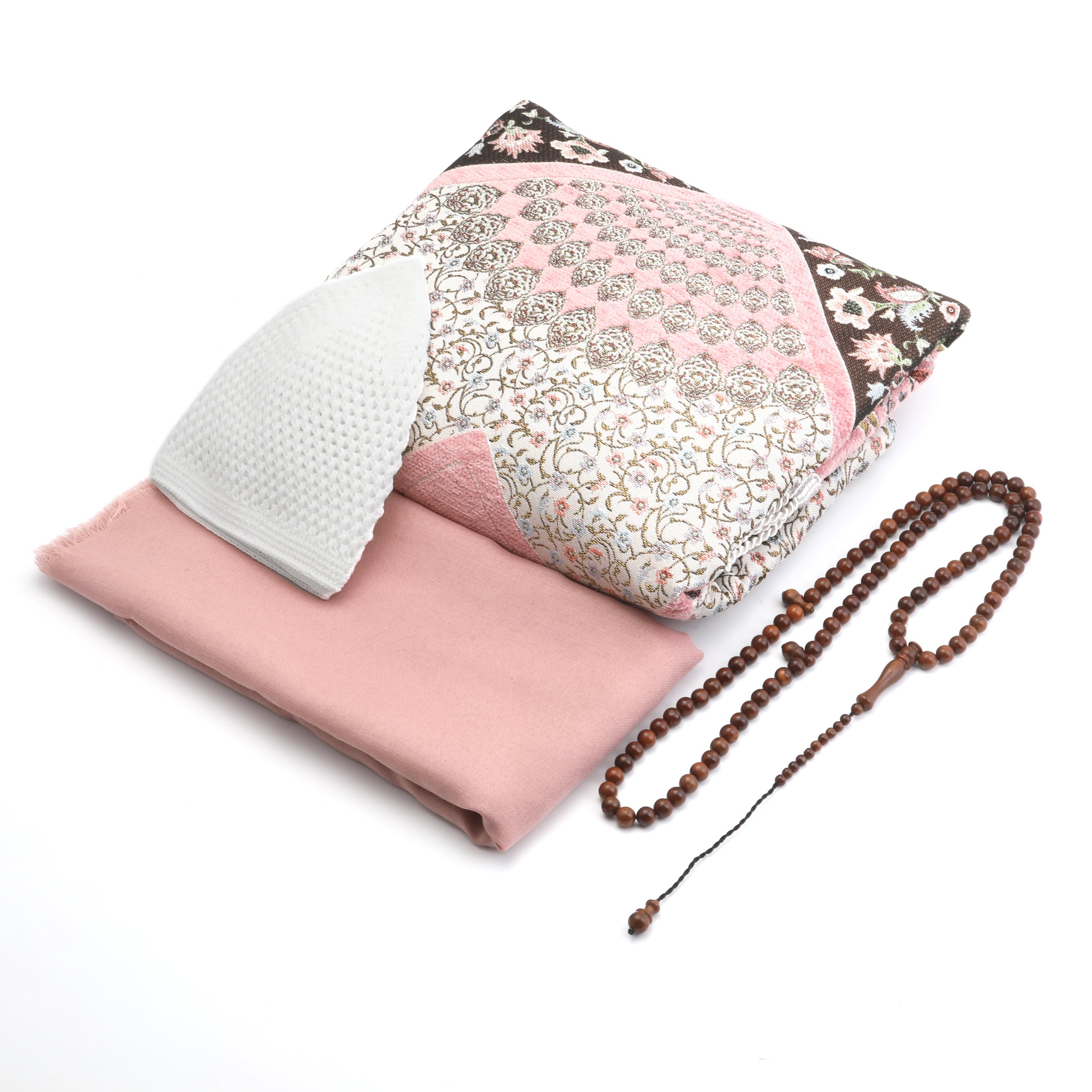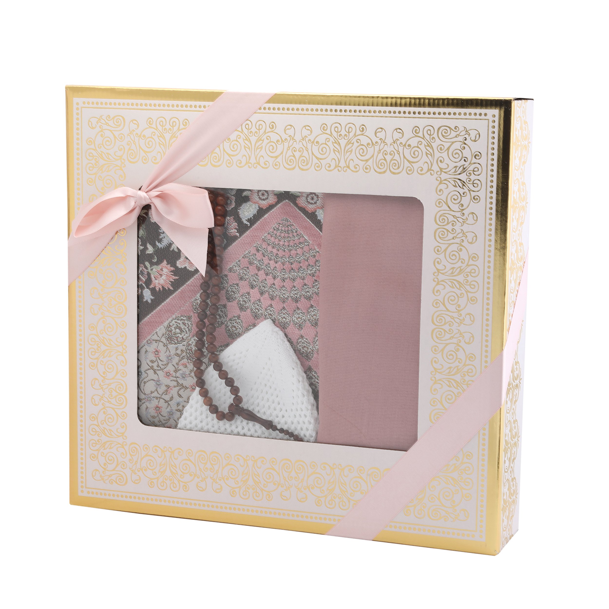 Hediyelik Seccade Eşarp Tesbih Takke Seti Pembe