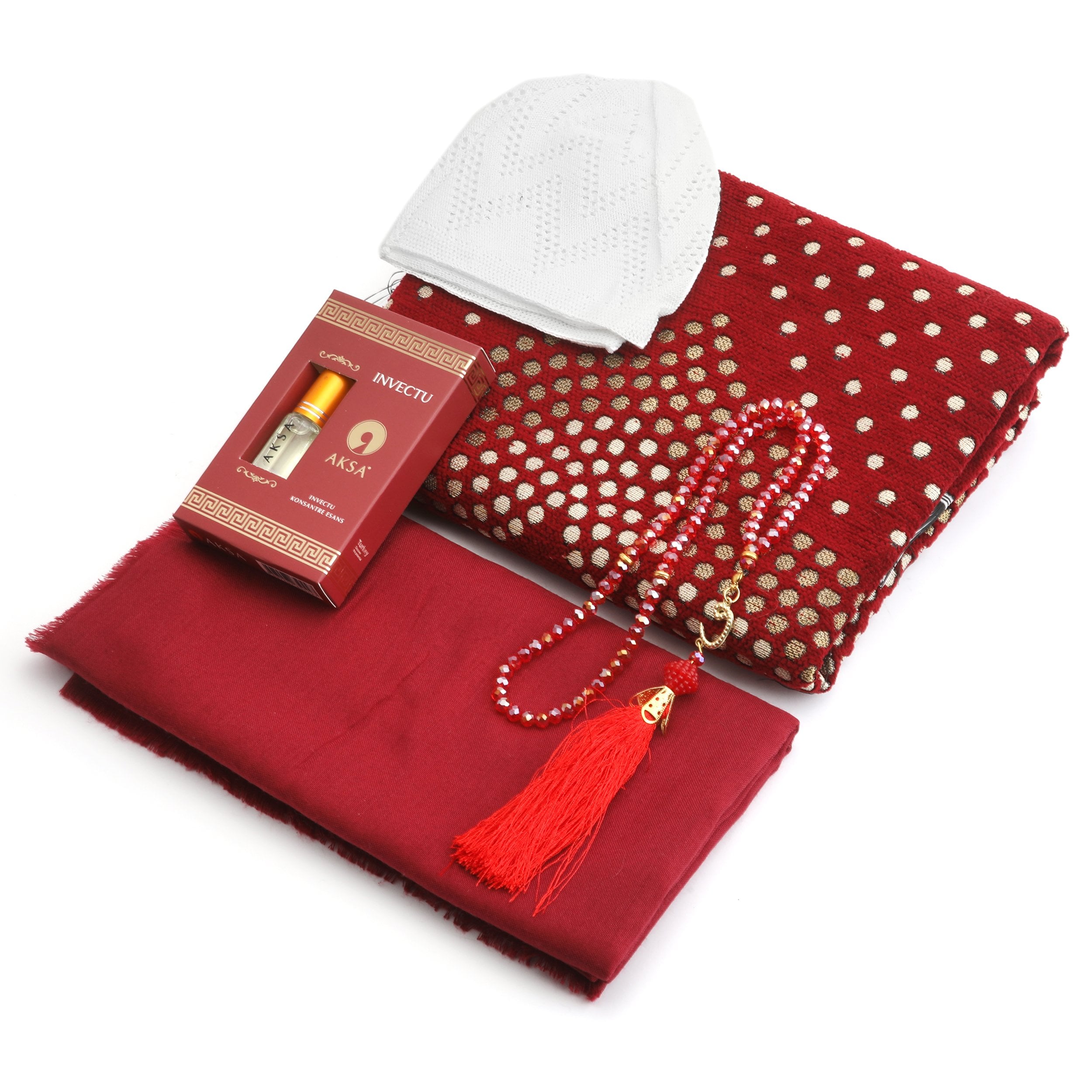 Hediyelik Seccade Eşarp Tesbih Takke Ve Esans Seti Bordo