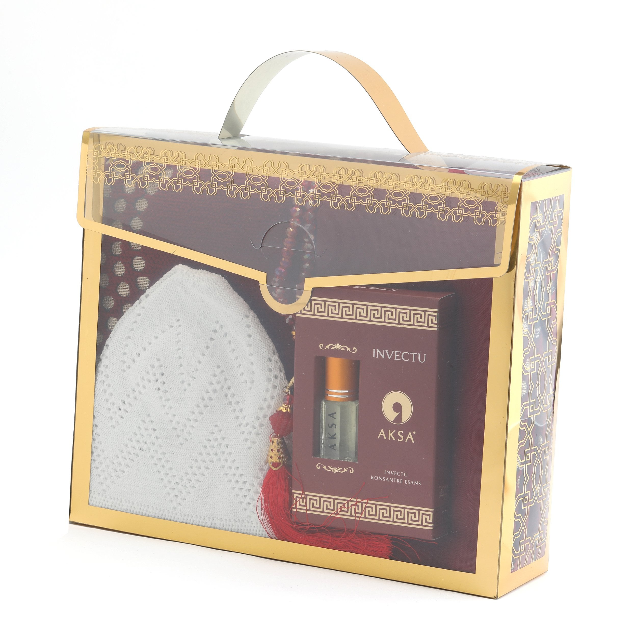 - Asetat kutu içerisinde 70x115 Cm Şönil Seccade, 100 Cm Saçaklı Renkli Eşarp, 99'luk 6 mm Kristal Vavlı Tesbih, Yıldırım Takke ve 3 ml Aksa Esans ile beraber sunulur.