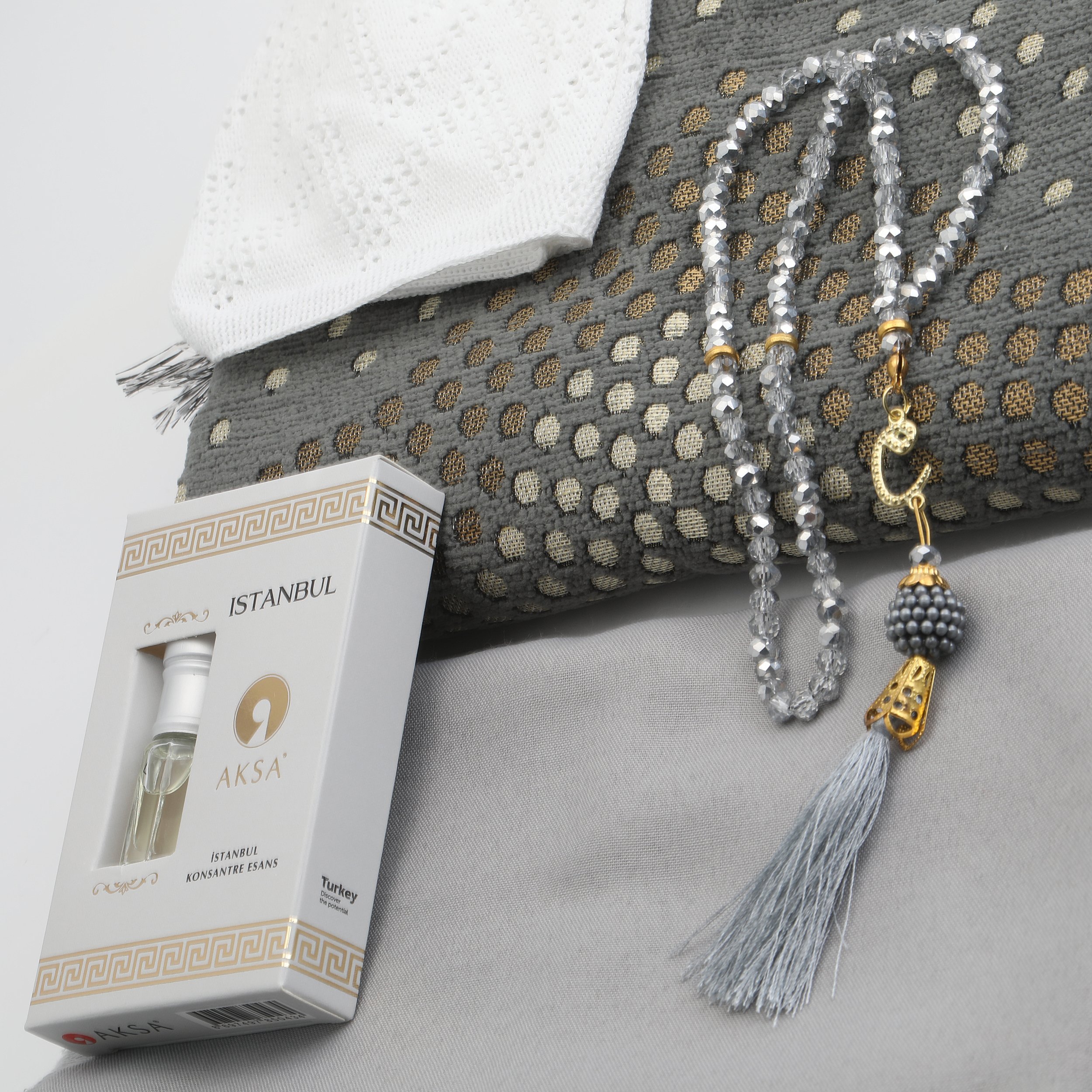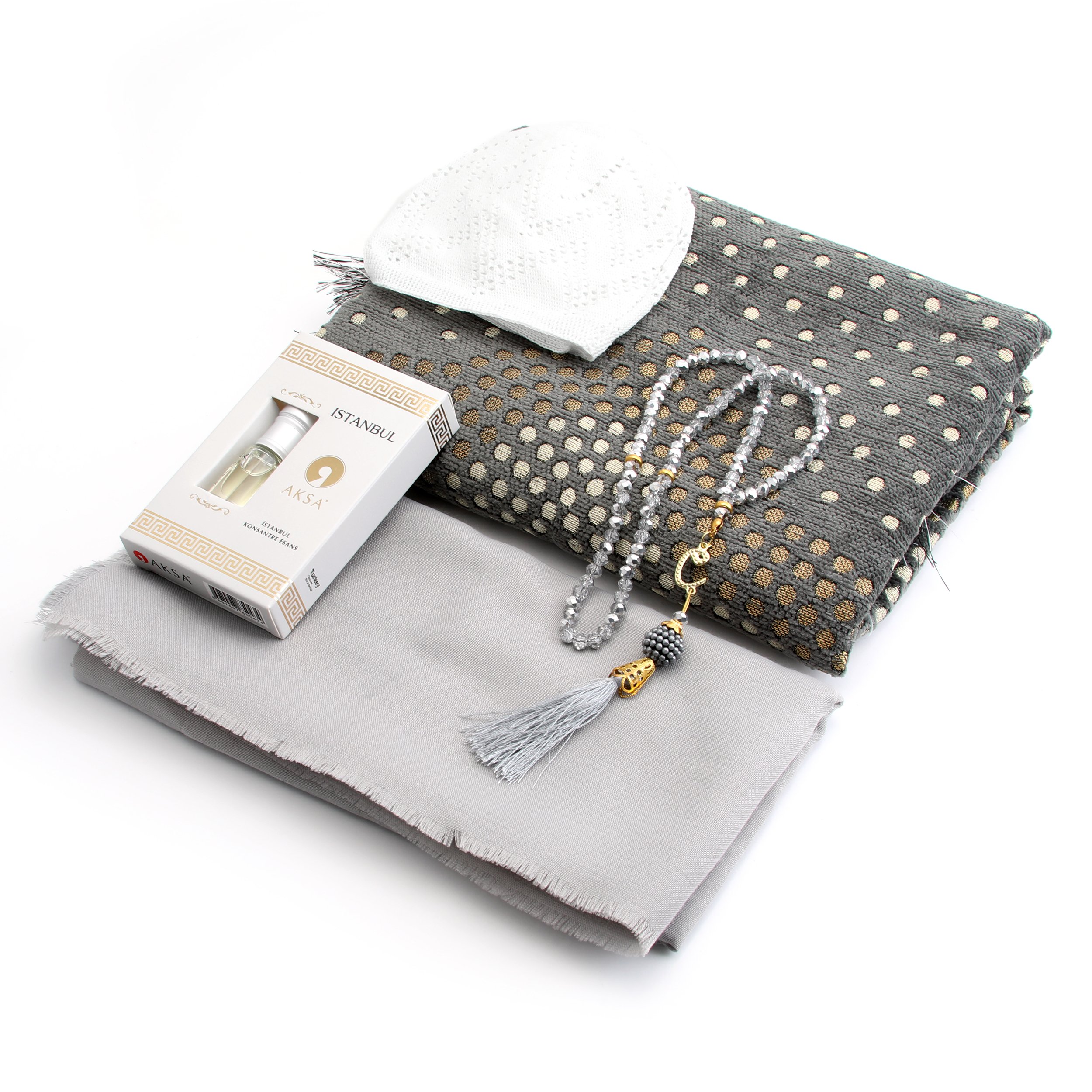 Hediyelik Seccade Eşarp Tesbih Takke Ve Esans Seti Gri