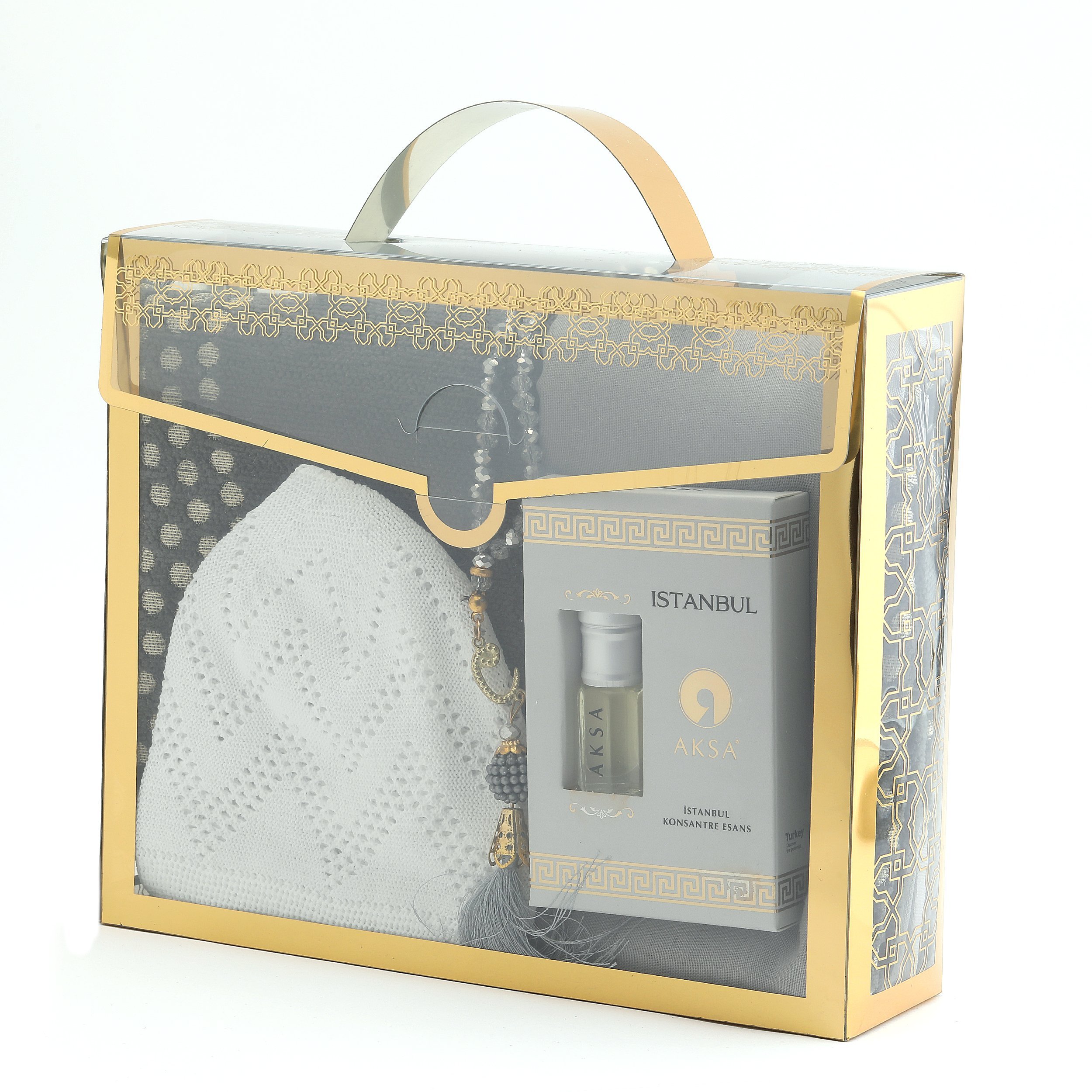 - Asetat kutu içerisinde 70x115 Cm Şönil Seccade, 100 Cm Saçaklı Renkli Eşarp, 99'luk 6 mm Kristal Vavlı Tesbih, Yıldırım Takke ve 3 ml Aksa Esans ile beraber sunulur.