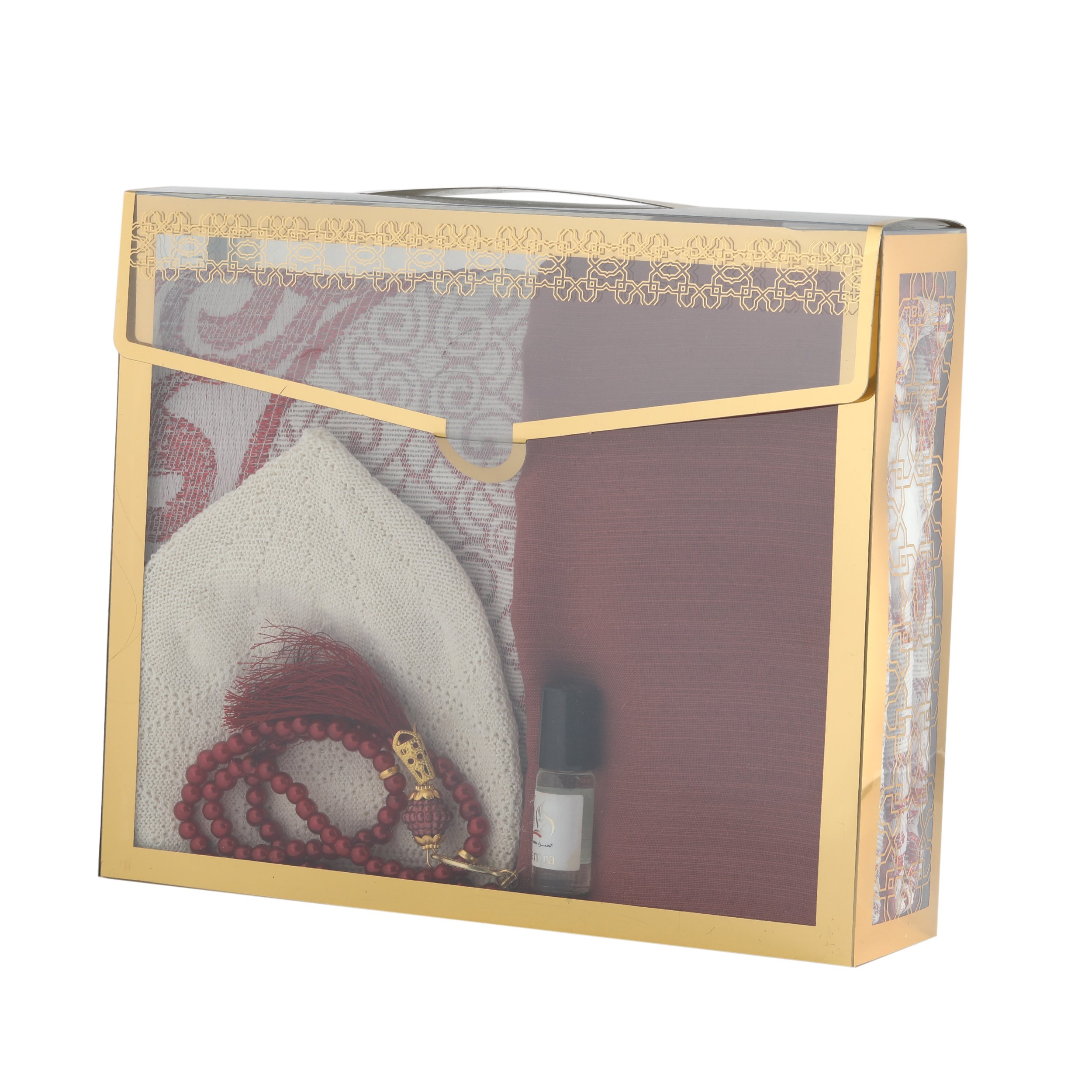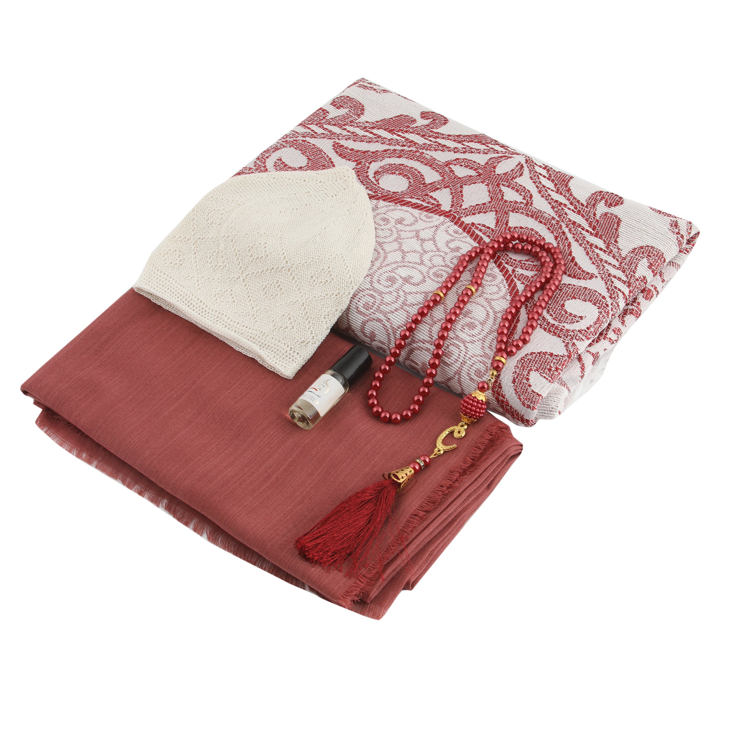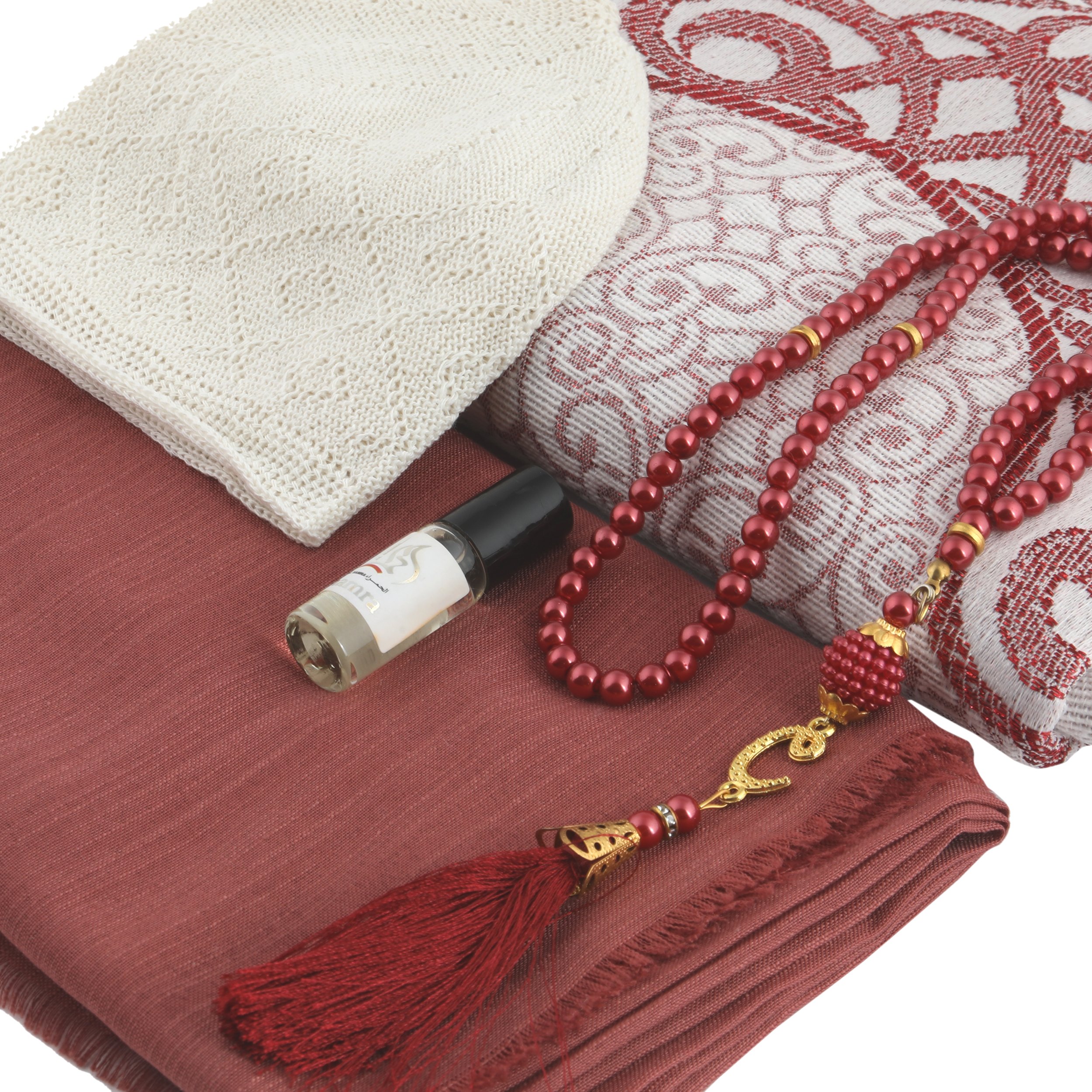Hediyelik Seccade Eşarp Tesbih Takke Ve Esans Seti Bordo