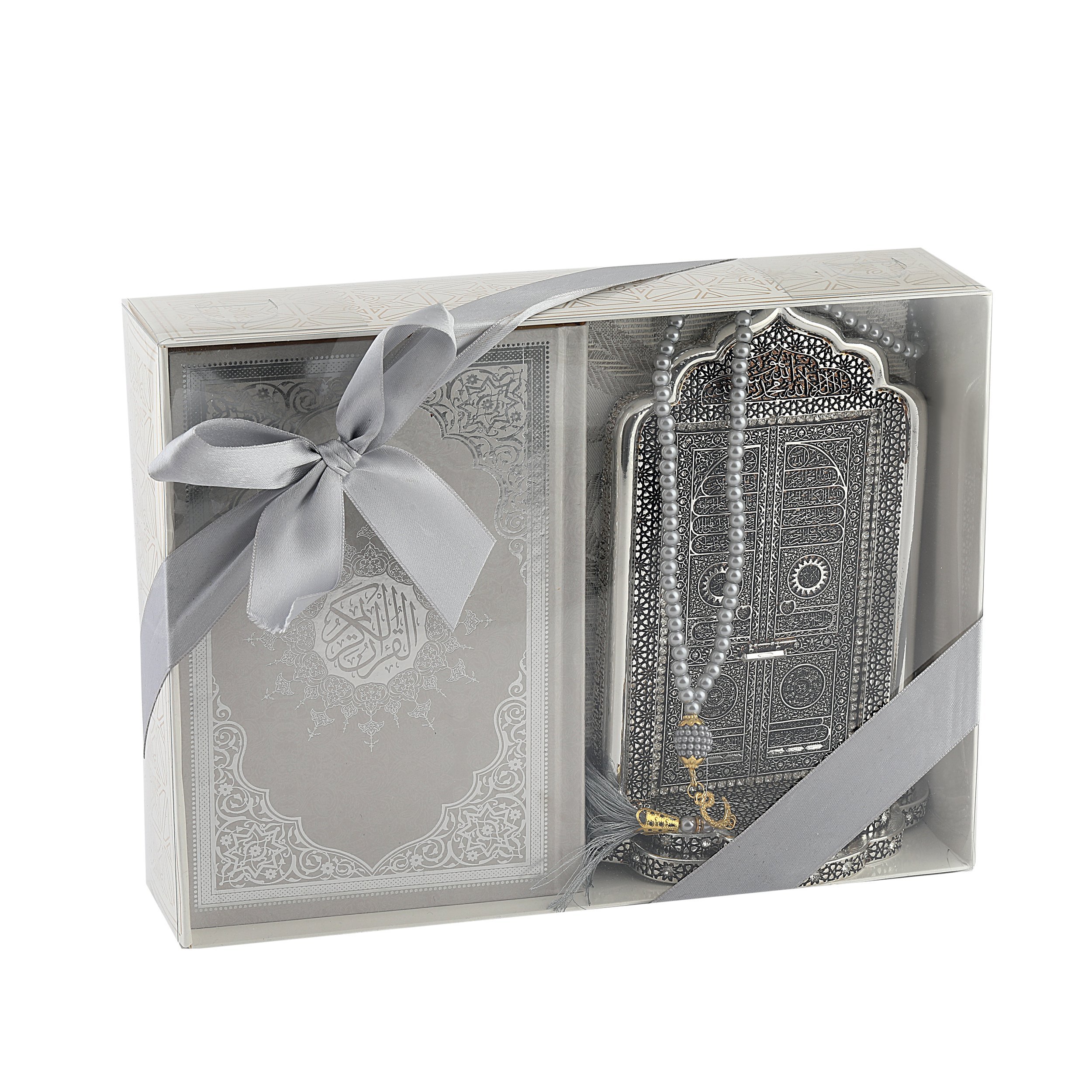 - Asetat kutu içerisinde 99'luk 6 mm Vavlı İnci Tesbih, 14x20 Hafız Boy Medine Hatlı Ofset Kuran-ı Kerim, 14x21 Cm Polyester Kabe Kapısı Biblo ve '70x110' 200 Gr. Pamuk Tafta Seccade ile beraber sunulur.