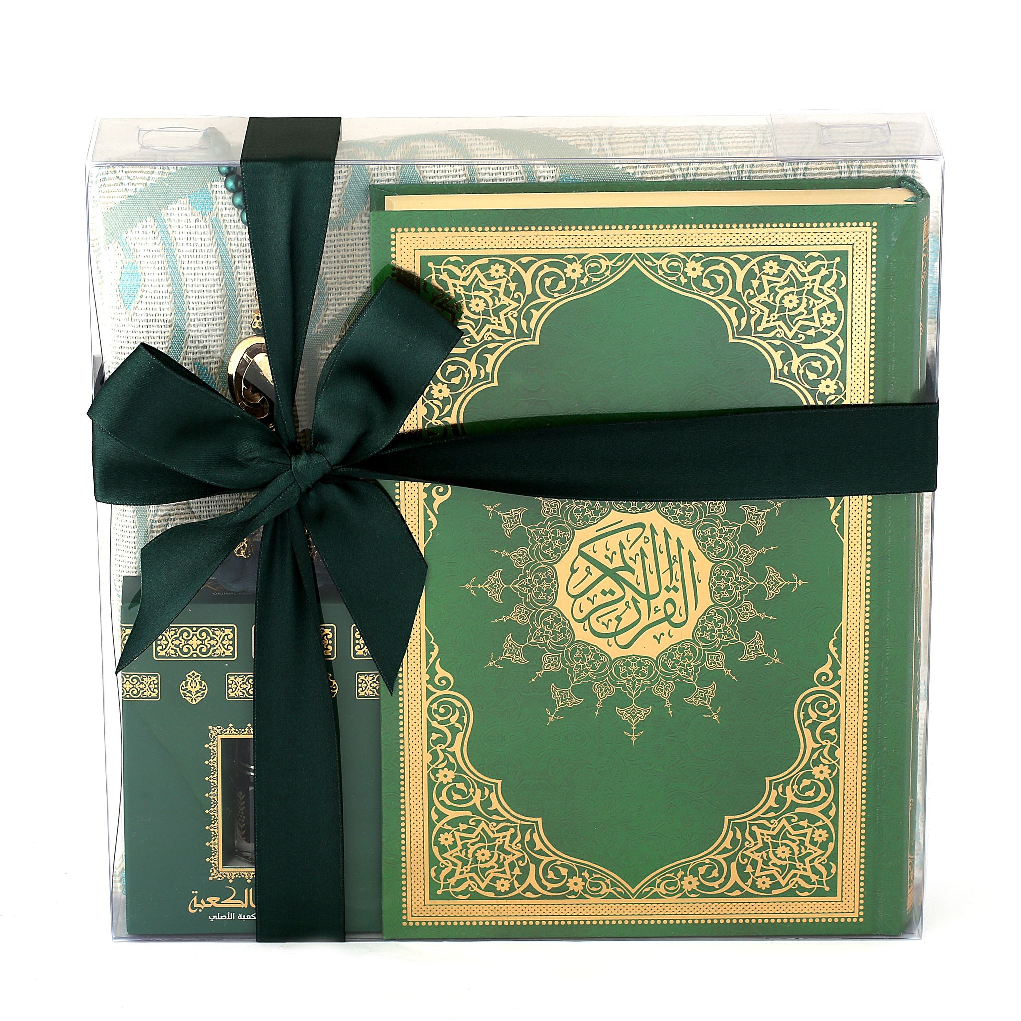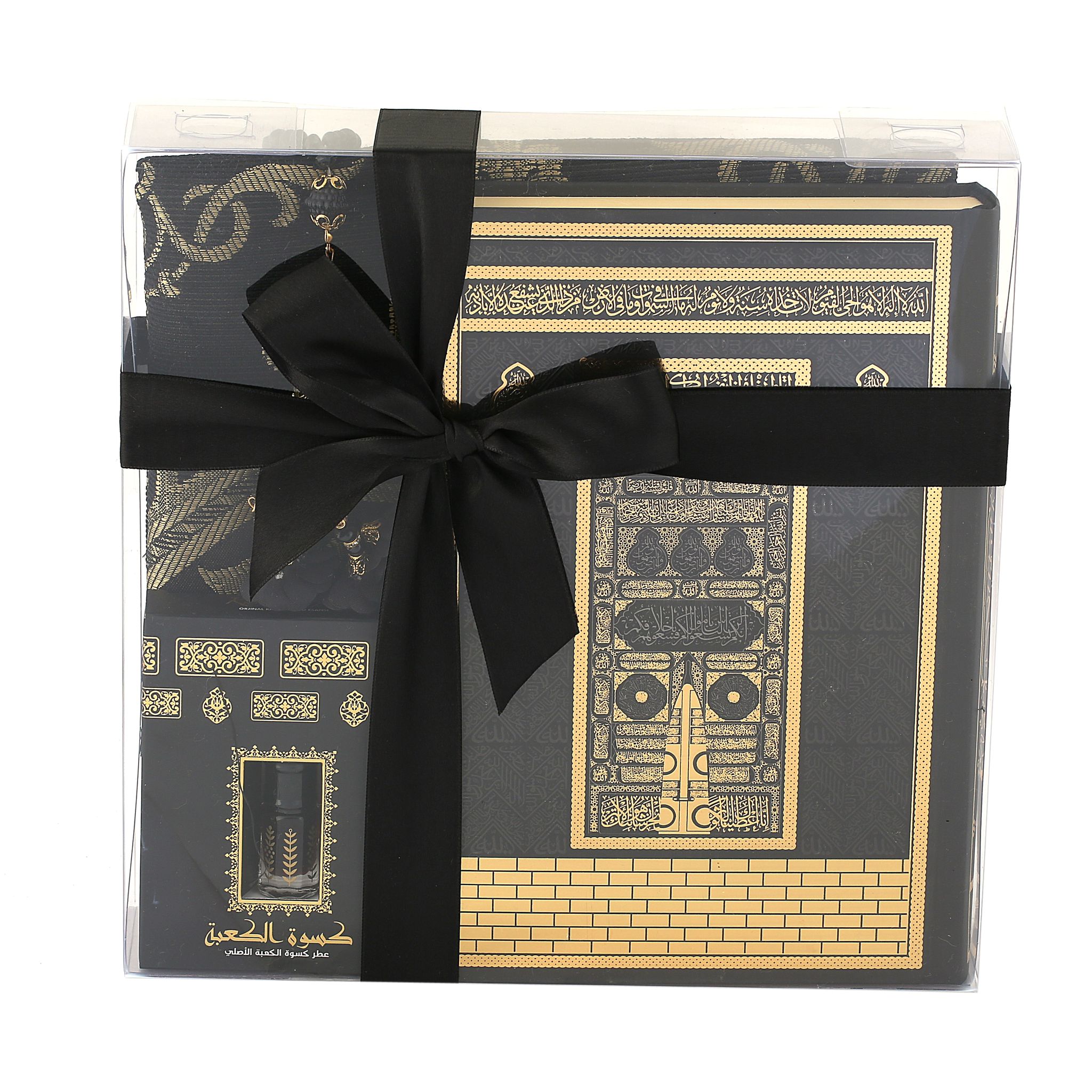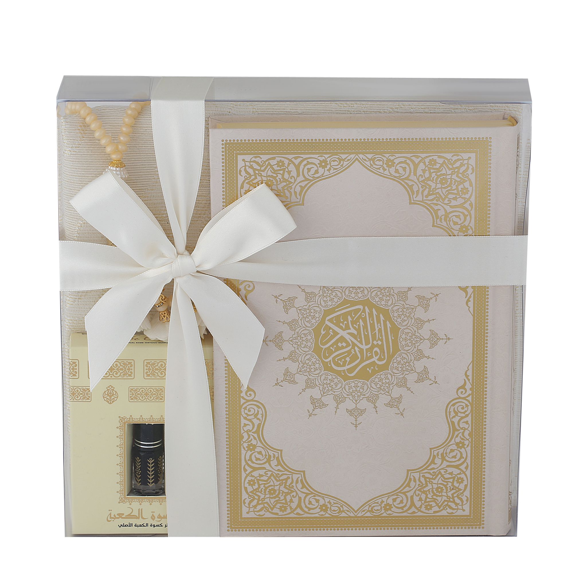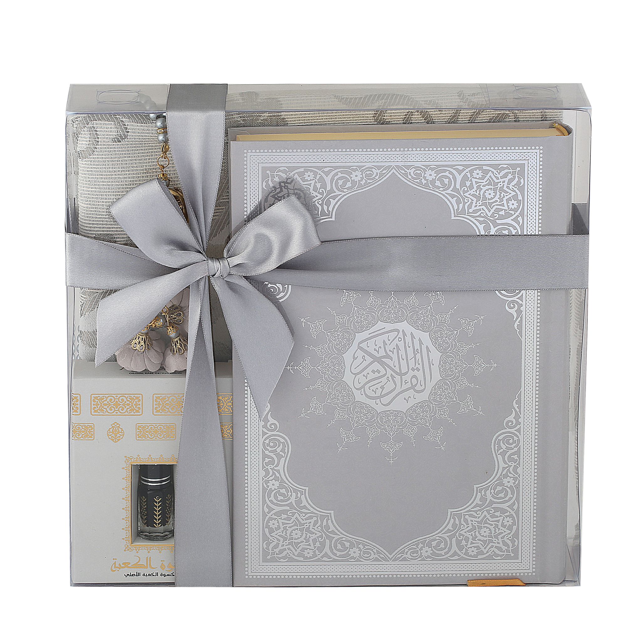 - Asetat kutu içerisinde 99'luk 6 mm Tasarım Tül Güllü Tesbih, 70x110 Tafta Seccade, 17x25 Cm Orta Boy Kuran-ı Kerim ve Kabe Örtüsü Koku ile beraber sunulur.