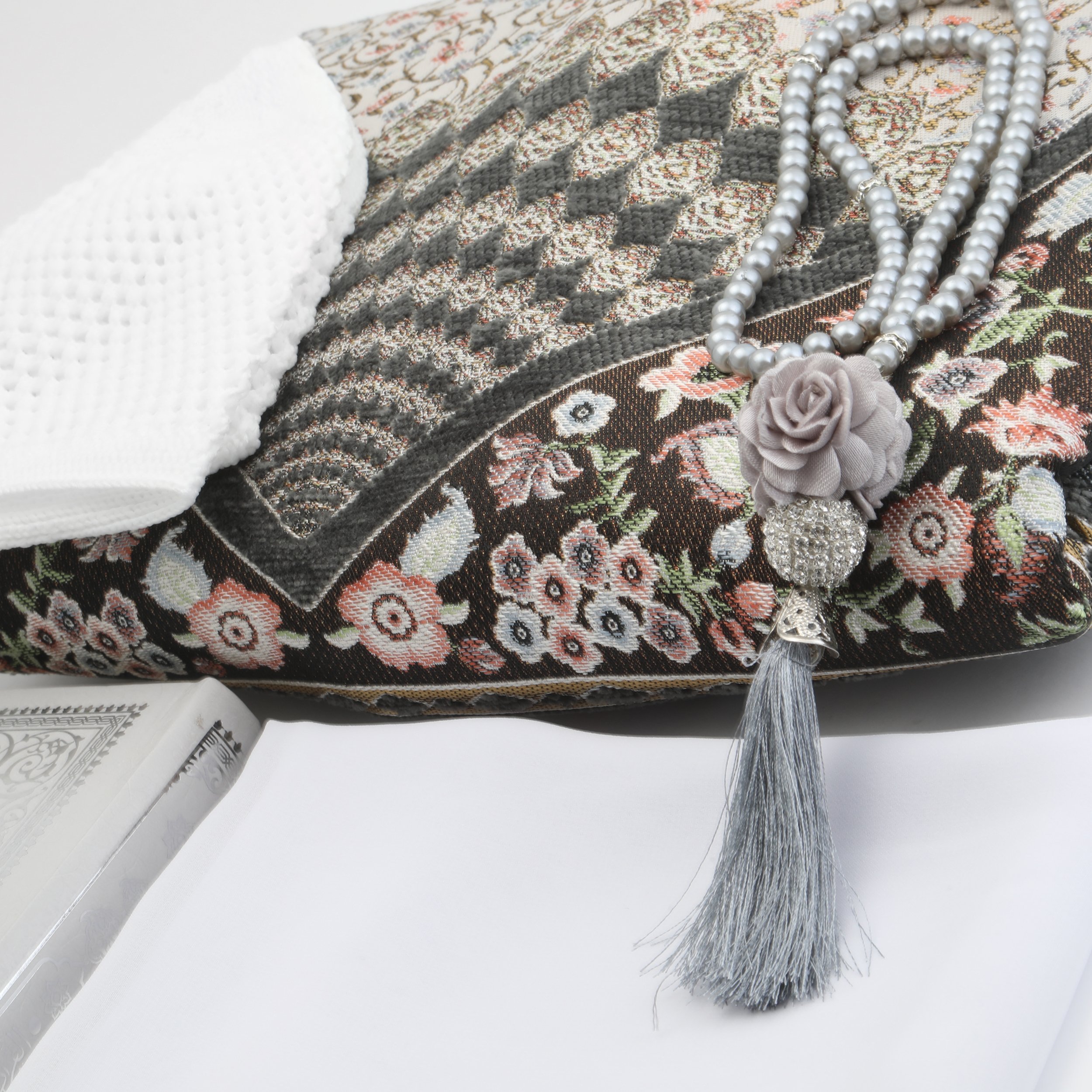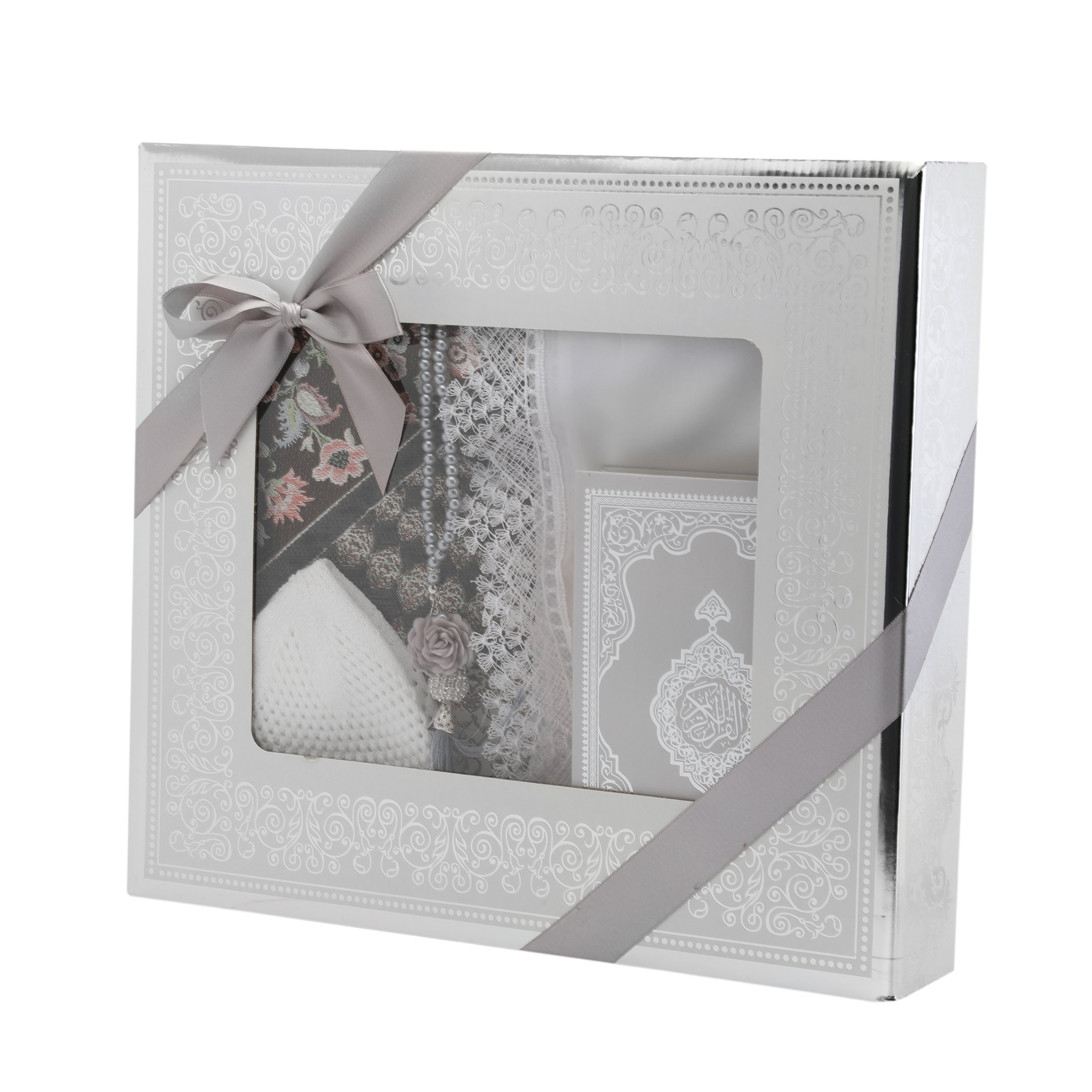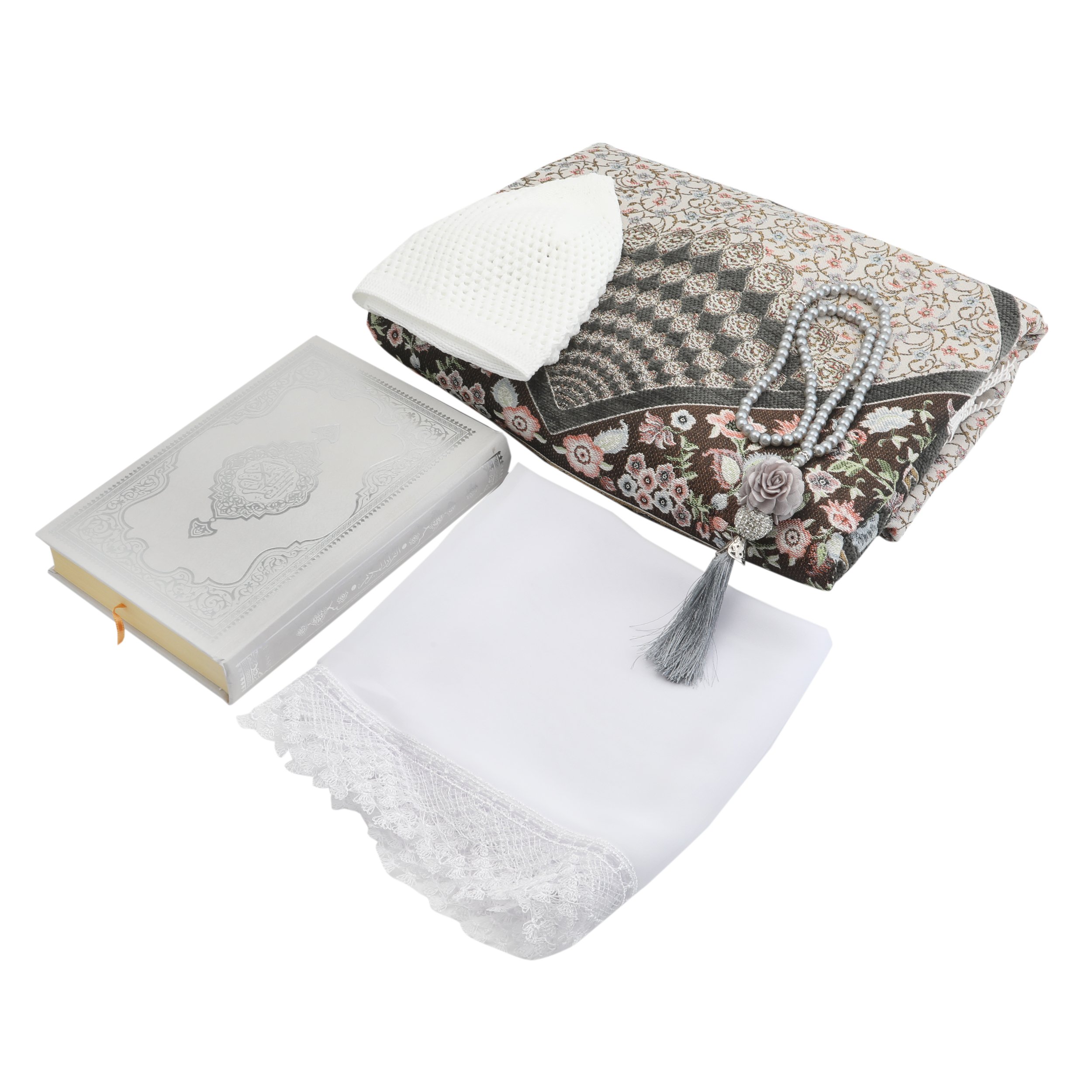 Hediyelik Seccade Kuran-ı Kerim Mevlid Örtüsü Tesbih Takke Seti Gri