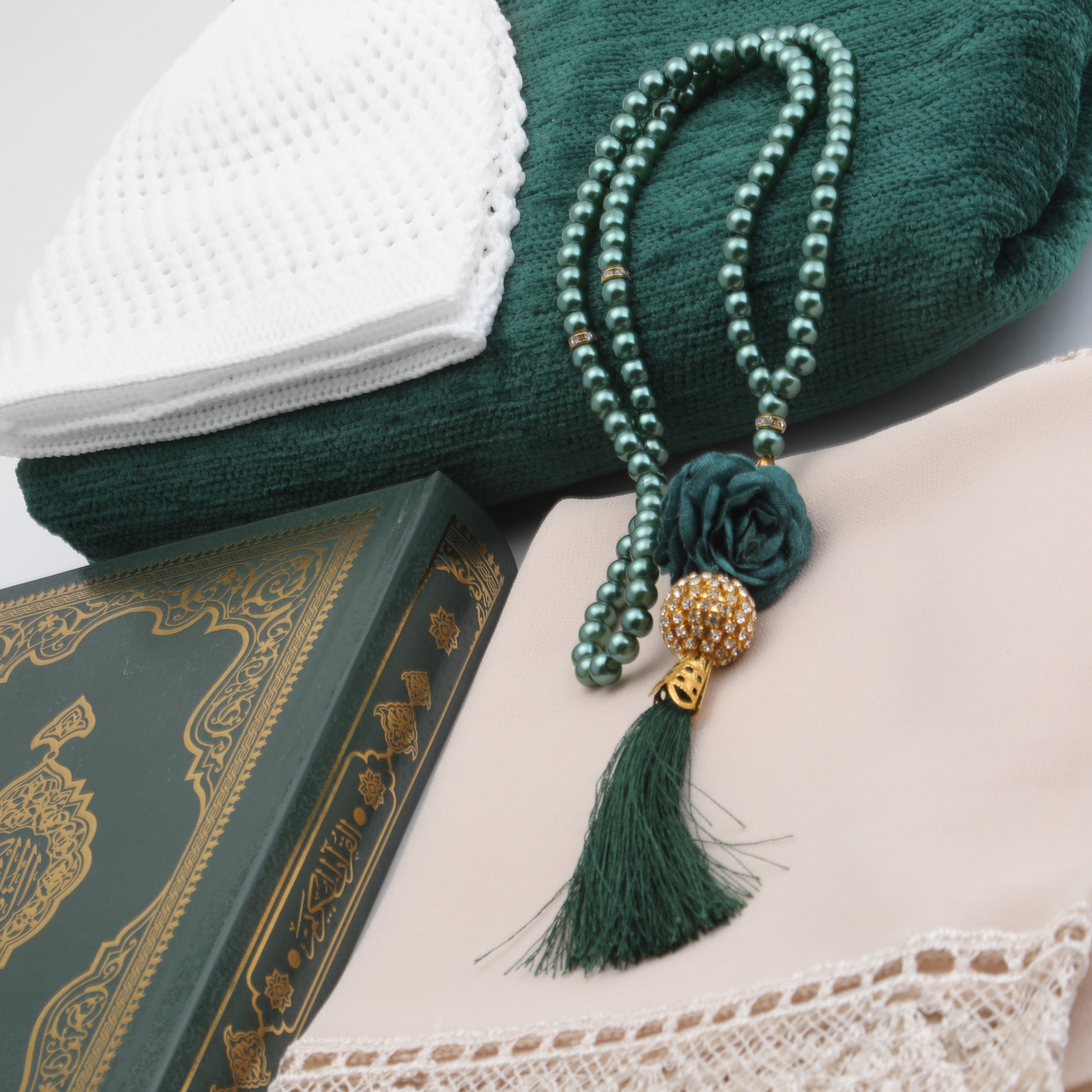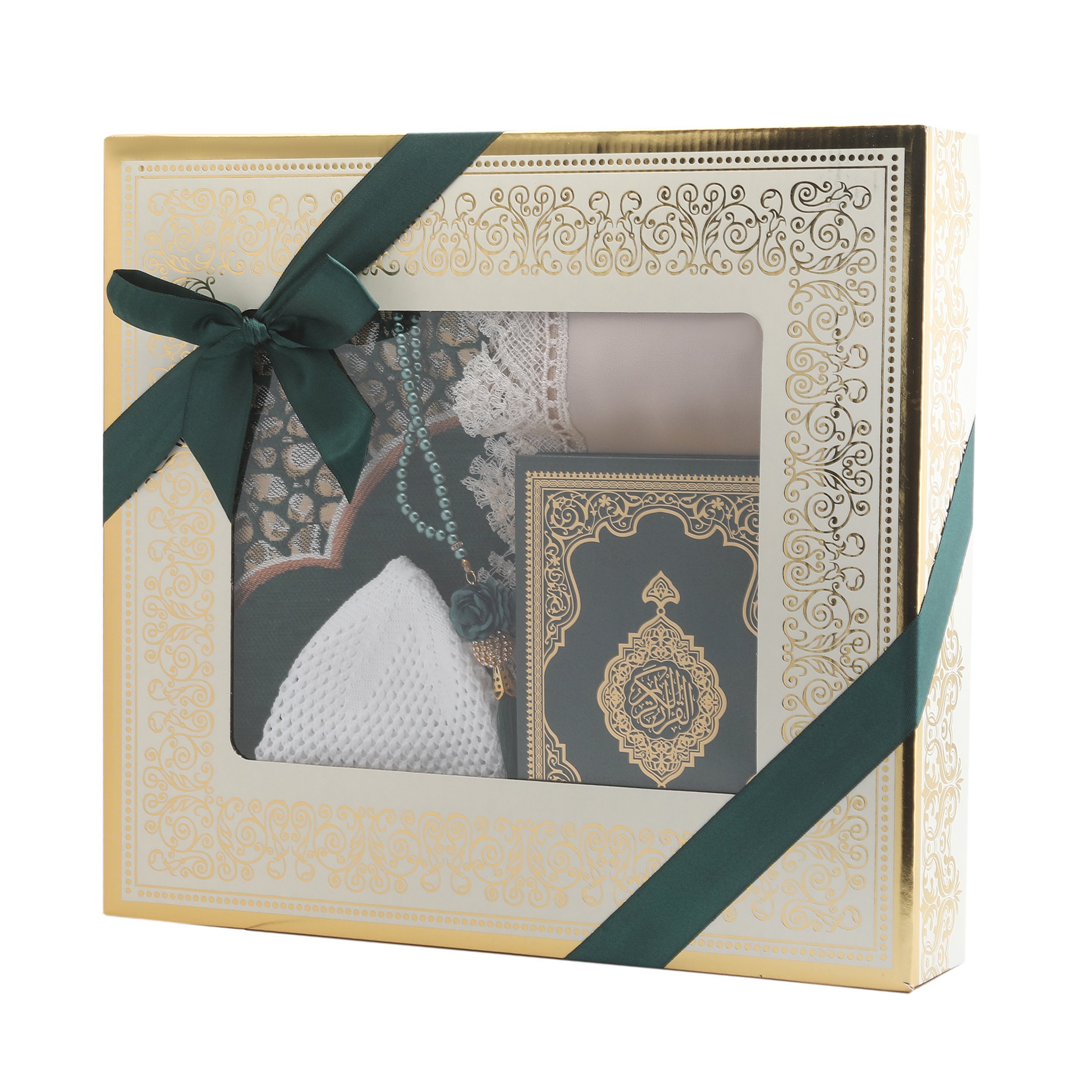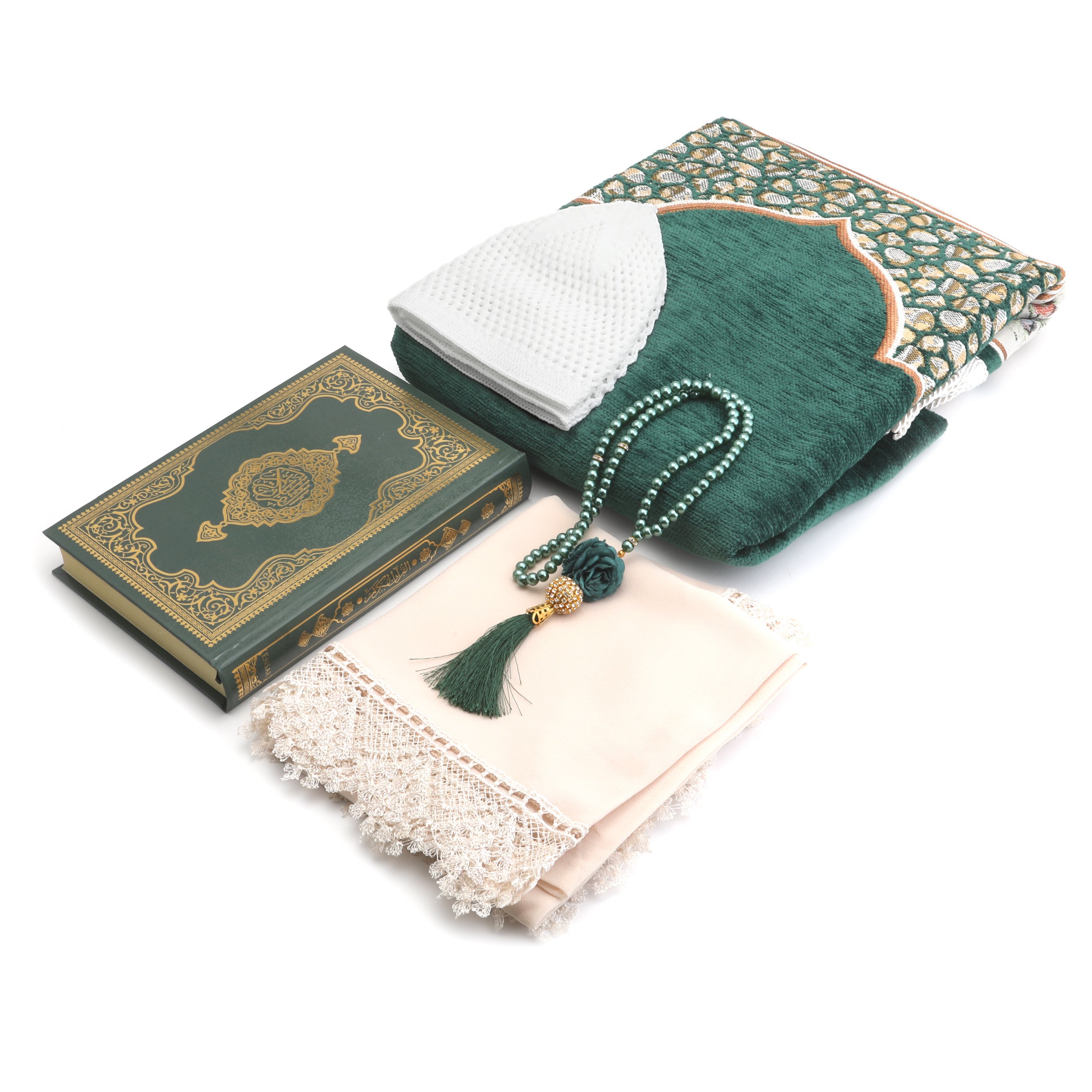 Hediyelik Seccade Kuran-ı Kerim Mevlid Örtüsü Tesbih Takke Seti Yeşil