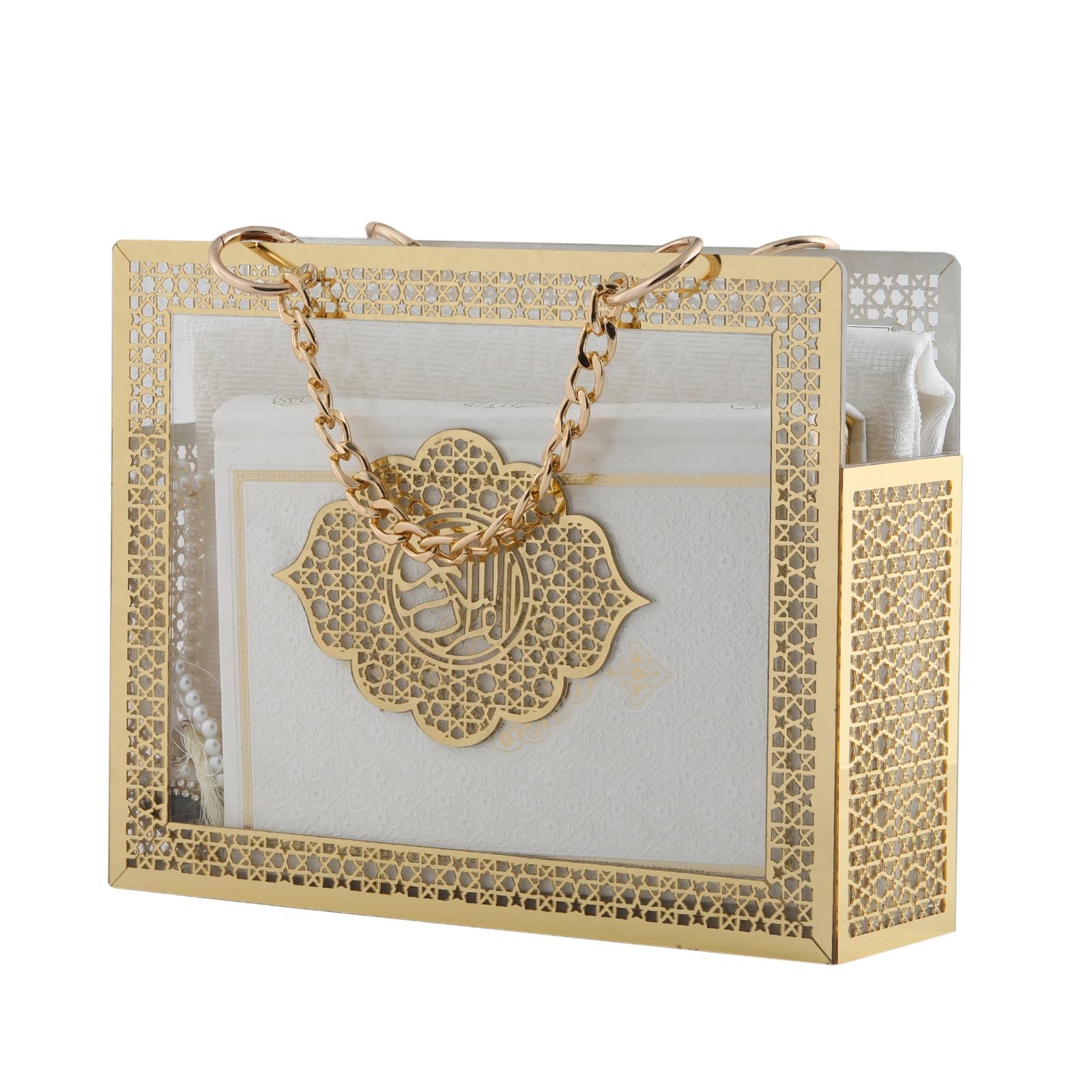 - Çanta kutu içerisinde 70x110 Cm 240 Gr Pamuk Tafta Seccade,14x20 Cm Hafız Boy Termo Deri Medine Hatlı Kuran-ı Kerim, Taşlı Zikirmatik ve 99'luk 6 mm Vavlı İnci Tesbih ile beraber sunulur.