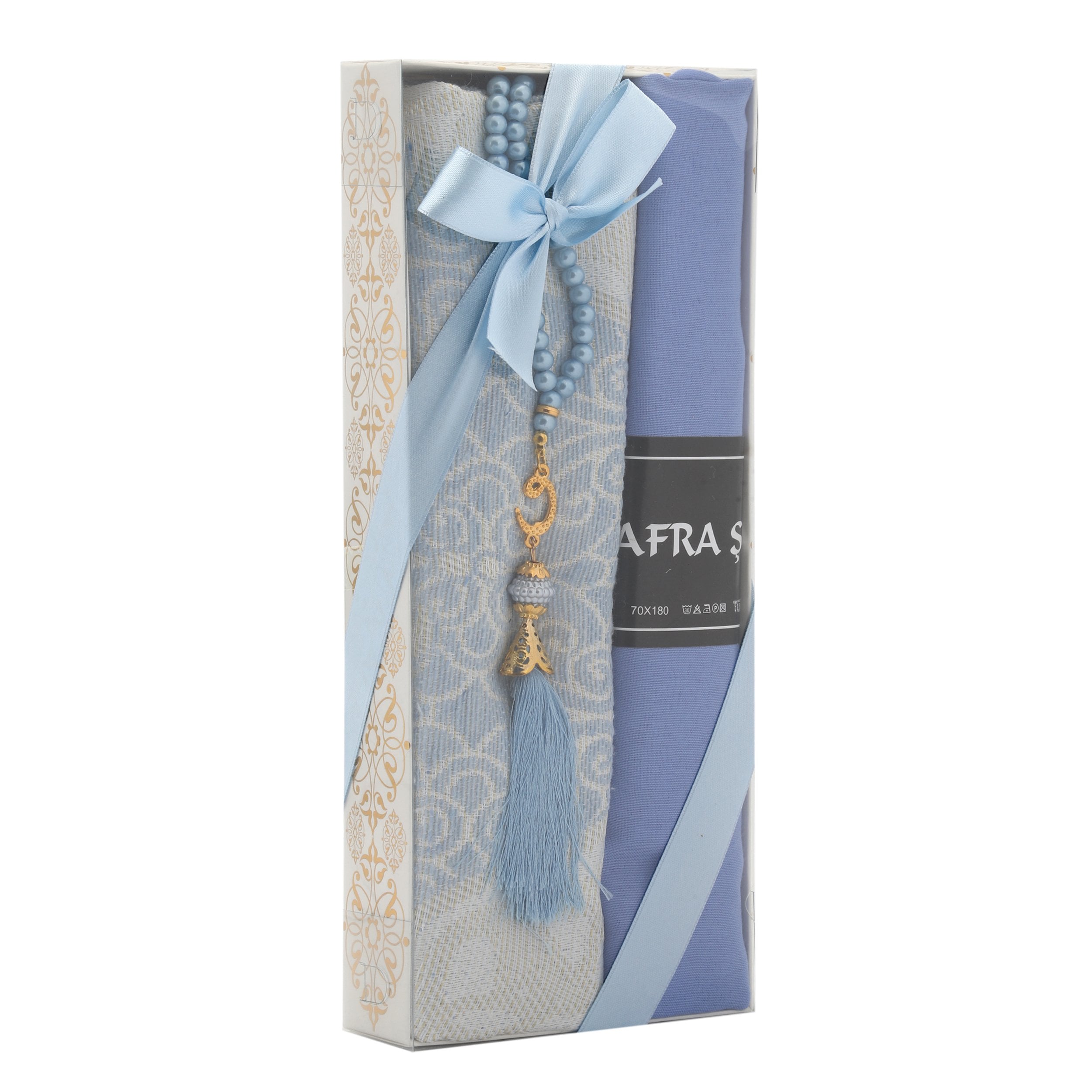 - Asetat kutu içerisinde 70x110 Tafta Seccade, 70x180 Cm Afra Pamuklu Şal ve 99'luk 6 mm Vavlı İnci Tesbih ile beraber sunulur.
